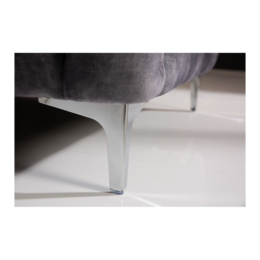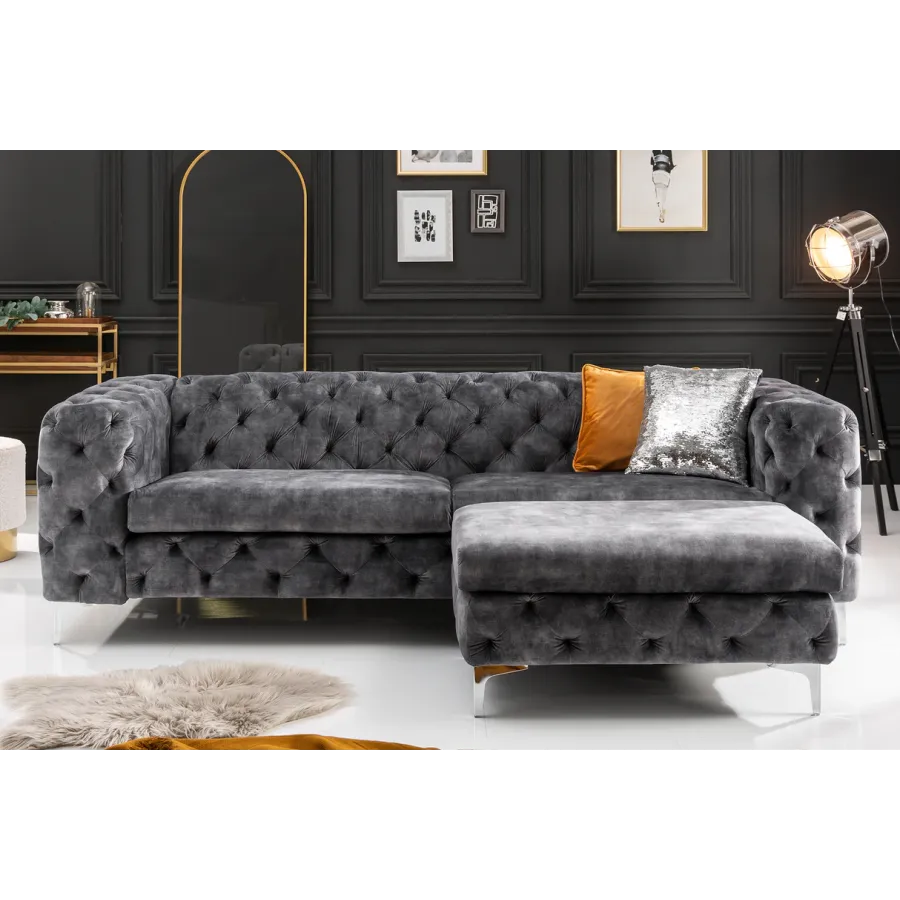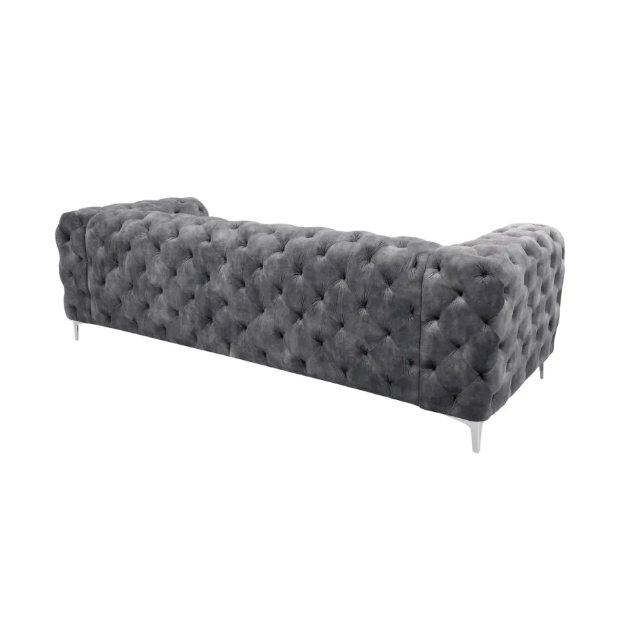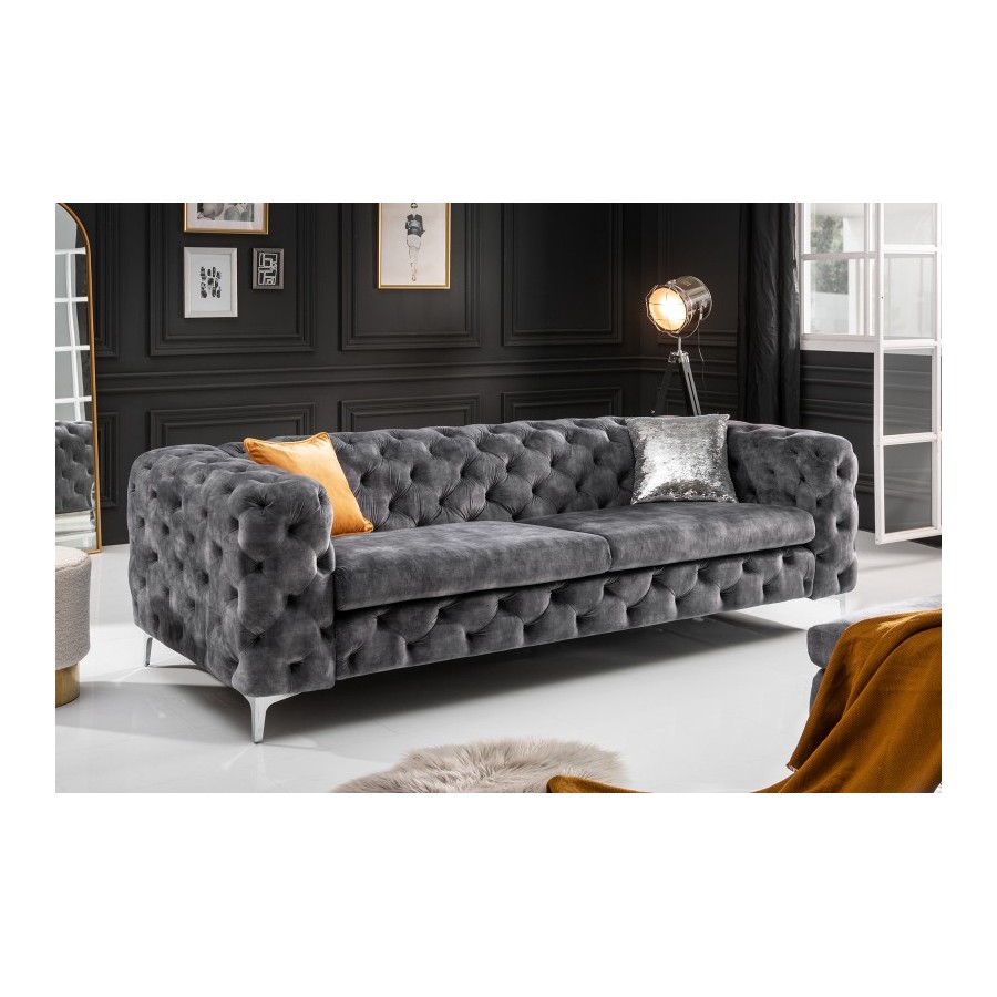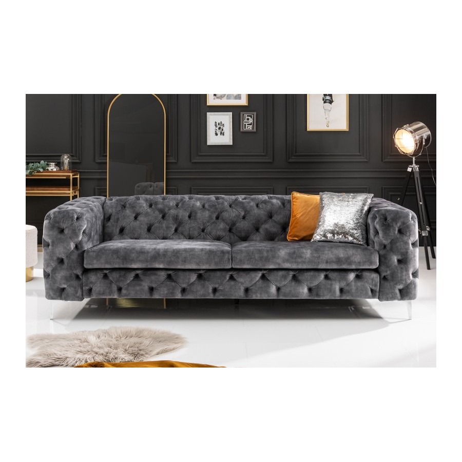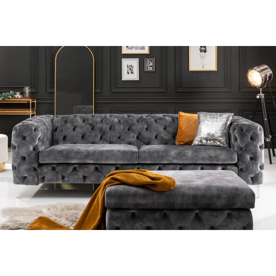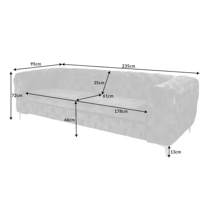 Pikowana powierzchnia oparcia i podłokietników nawiązuje do eleganckiego wzoru Chesterfield z Anglii. Gładkie, wysokiej jakości tapicerowane poduszki do siedzenia tworzą umiejętny kontrast i zachęcają do odpoczynku. Srebrne nóżki sofy dodają nowoczesnego uroku projektowi i gwarantują stabilne oparcie na każdej powierzchni. Pomimo przyciągającego wzrok designu, kanapę można z łatwością łączyć z wieloma różnymi meblami i materiałami. Co więcej, sofa doskonale sprawdza się nie tylko w salonie: wystawną sofę Chesterfield można również umieścić jako designerską atrakcję w strefie wejściowej lub w gabinecie.