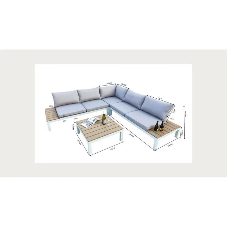 Nowoczesny zestaw wypoczynkowy do ogrodu w ciepłym, beżowym kolorze wprowadza swobodny, lounge’owy klimat do stylowych przestrzeni zewnętrznych. Przestronna sofa narożna zachęca do relaksu, a dzięki miękkim poduszkom siedziskowym i oparciowym tworzy przytulną atmosferę sprzyjającą odpoczynkowi. Stonowana kolorystyka podkreśla spokojny, elegancki charakter zestawu i pozwala łatwo dopasować go do różnych aranżacji ogrodowych. Duży stolik kawowy w naturalnym wykończeniu drewna harmonijnie uzupełnia całość i oferuje wystarczająco dużo miejsca na napoje, czasopisma czy letnie dodatki. Boczne półki w narożniku stanowią ciekawy kontrast, łącząc design z funkcjonalnością. Czyste linie, proporcjonalna forma i przemyślana konstrukcja sprawiają, że zestaw ten jest idealną bazą do relaksu w ogrodzie, na tarasie czy balkonie.