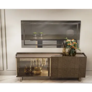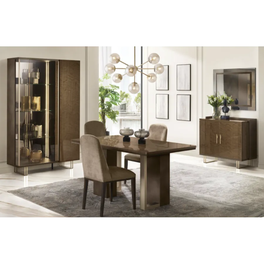 W skład zestawu wchodzi imponujący stół o wysokim połysku, miękko tapicerowane, komfortowe krzesła oraz stylowy bufet z lustrem, które razem budują przestrzeń pełną klasy i wyrafinowania. Fiamma nie tylko zdobi, ale także podkreśla wyjątkowy charakter jadalni — zachwycając kunsztem wykonania i dbałością o każdy detal.