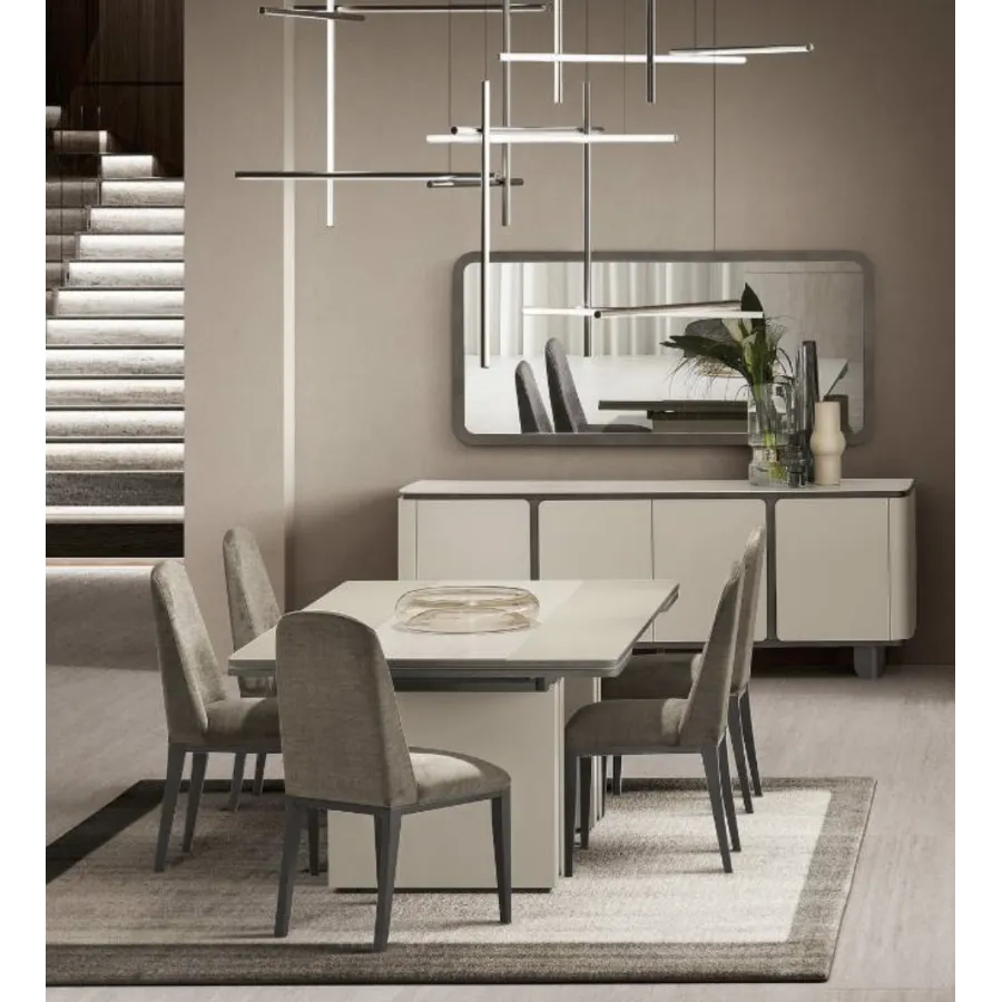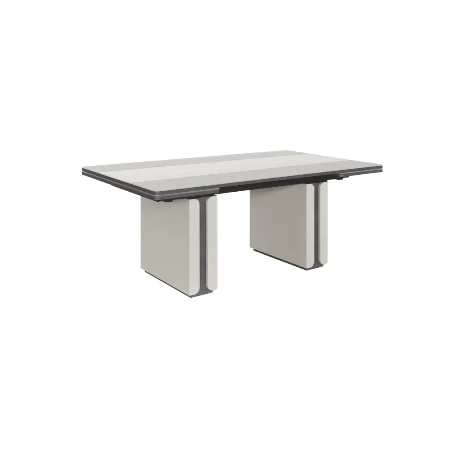 Stół z kolekcji PERLA to esencja współczesnego luksusu i harmonii. Jego geometryczna forma i stonowana kolorystyka idealnie wpisują się w nowoczesne wnętrza, a centralny pas z naturalnego trawertynu wprowadza nutę szlachetnej elegancji. To właśnie detal, który przykuwa wzrok i nadaje całości wyjątkowy charakter.