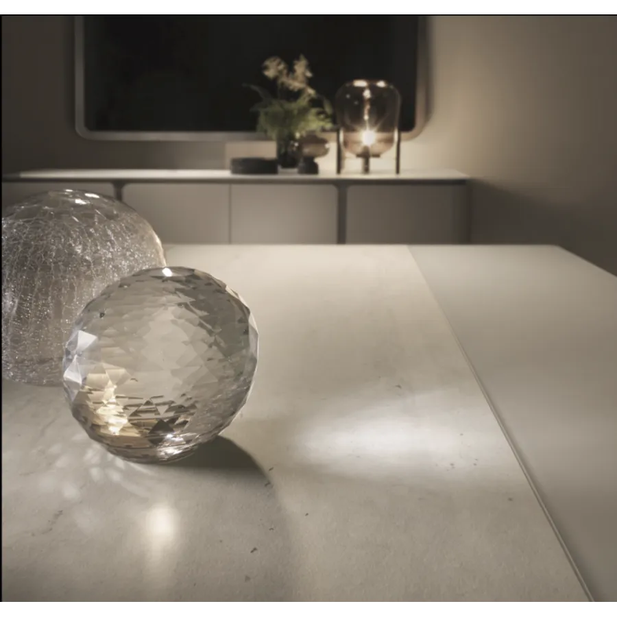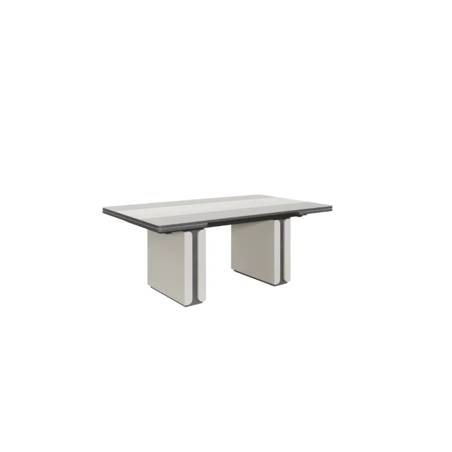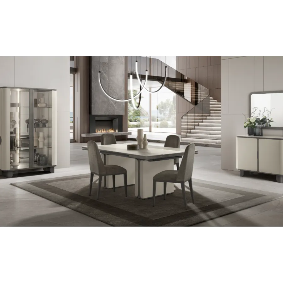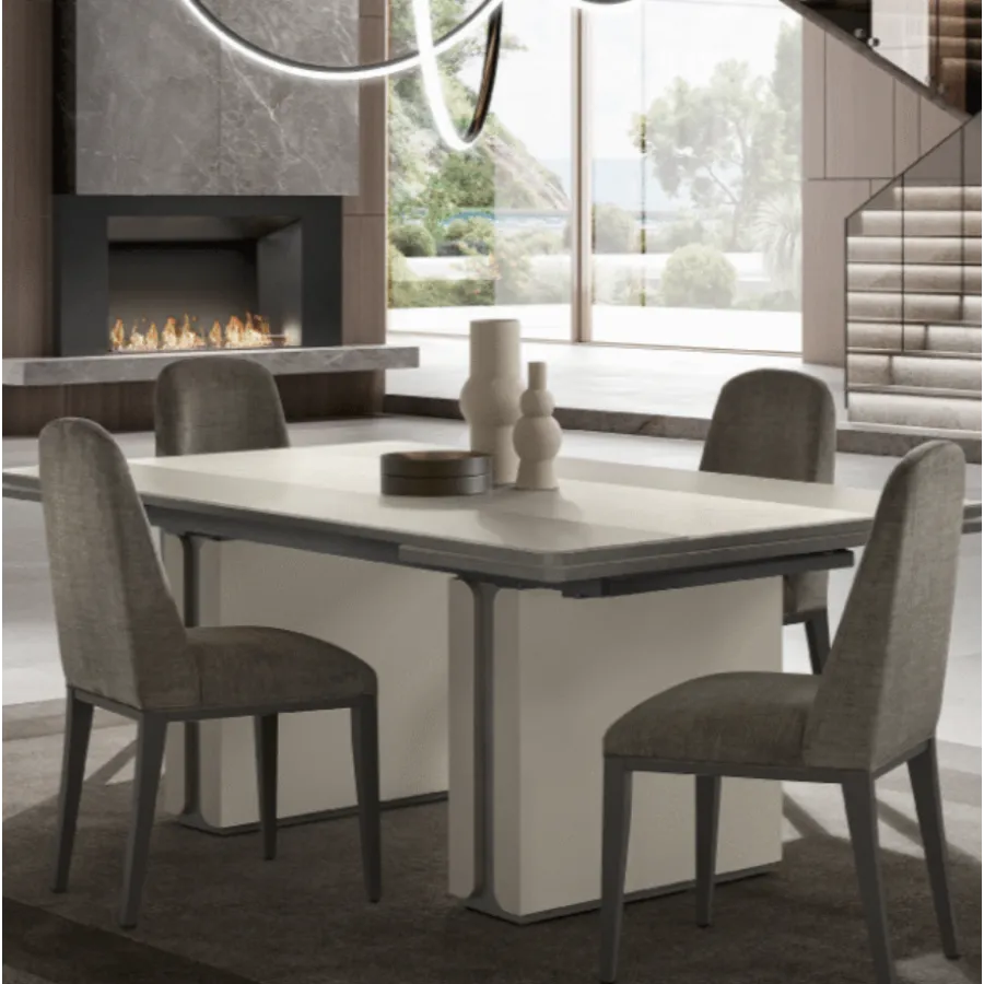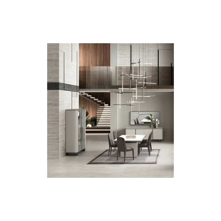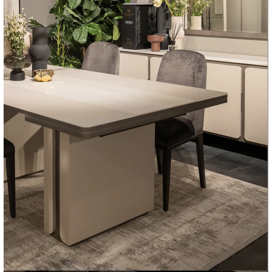 Stół z kolekcji PERLA to esencja współczesnego luksusu i harmonii. Jego geometryczna forma i stonowana kolorystyka idealnie wpisują się w nowoczesne wnętrza, a centralny pas z naturalnego trawertynu wprowadza nutę szlachetnej elegancji. To właśnie detal, który przykuwa wzrok i nadaje całości wyjątkowy charakter.