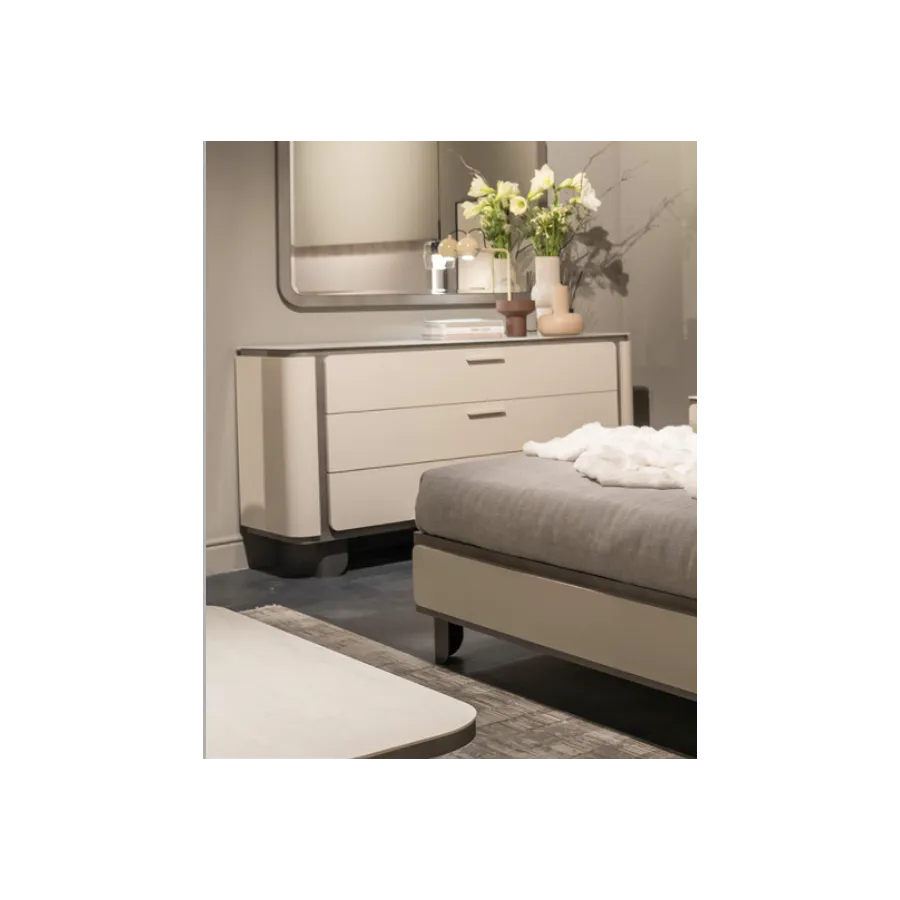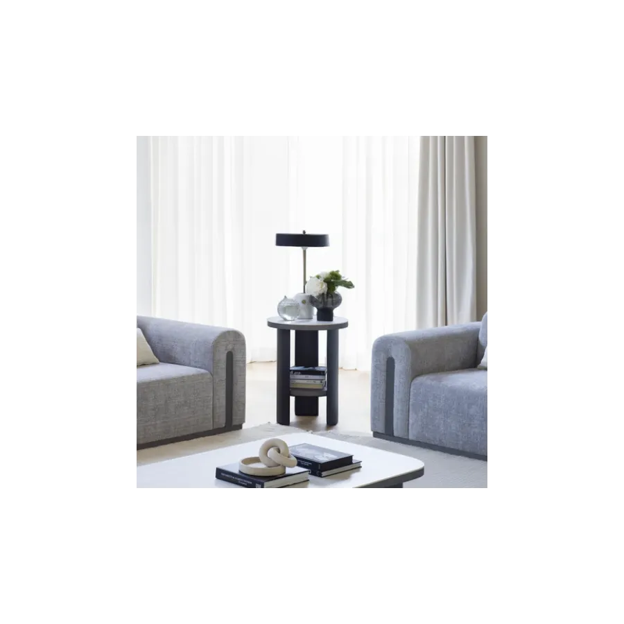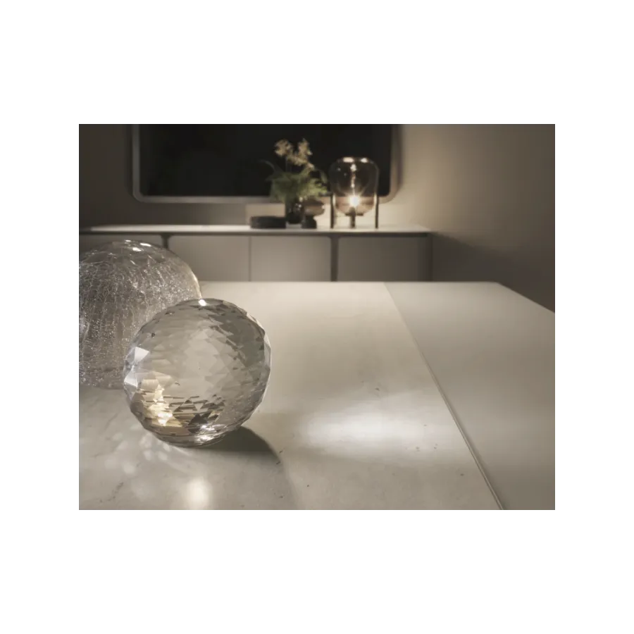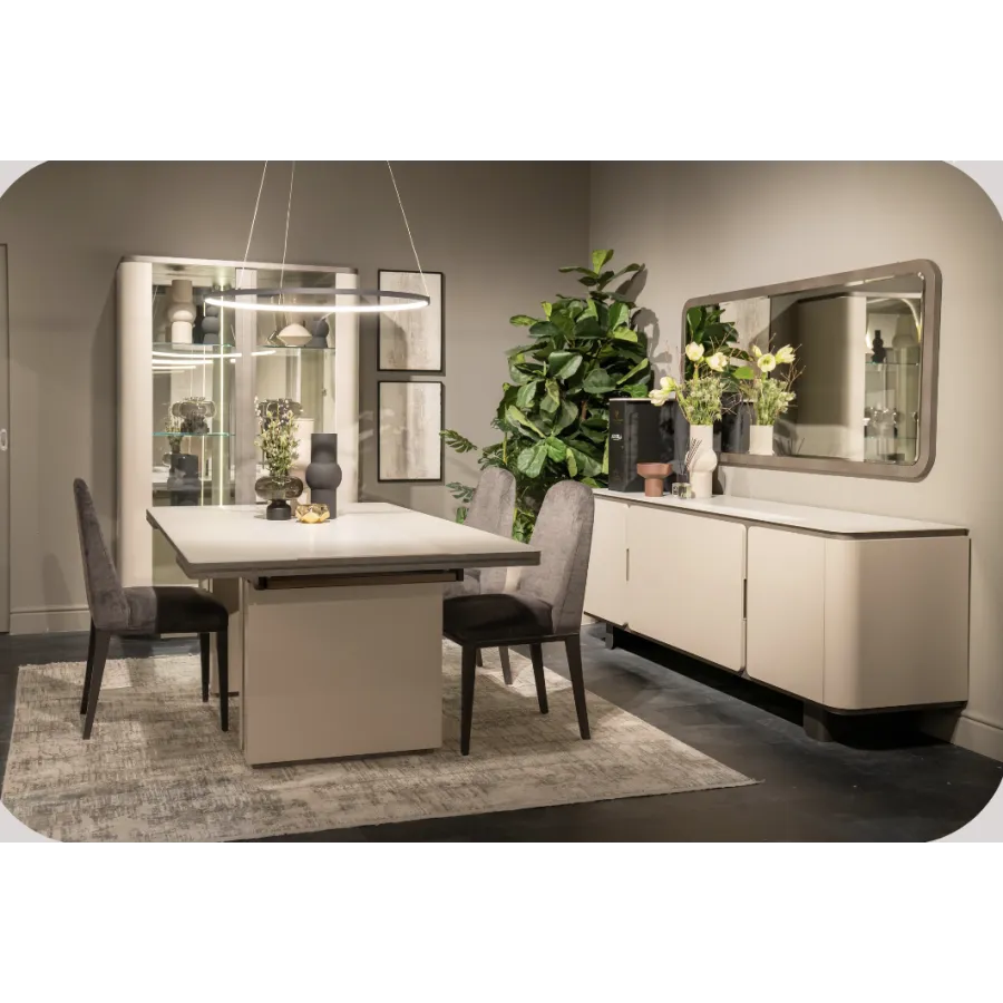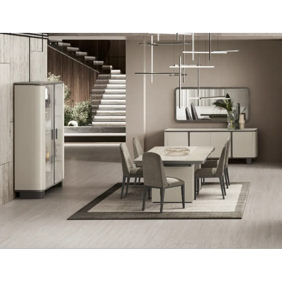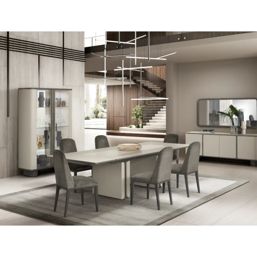 Stół z kolekcji PERLA to esencja współczesnego luksusu i harmonii. Jego geometryczna forma i stonowana kolorystyka idealnie wpisują się w nowoczesne wnętrza, a centralny pas z naturalnego trawertynu wprowadza nutę szlachetnej elegancji. To właśnie detal, który przykuwa wzrok i nadaje całości wyjątkowy charakter.