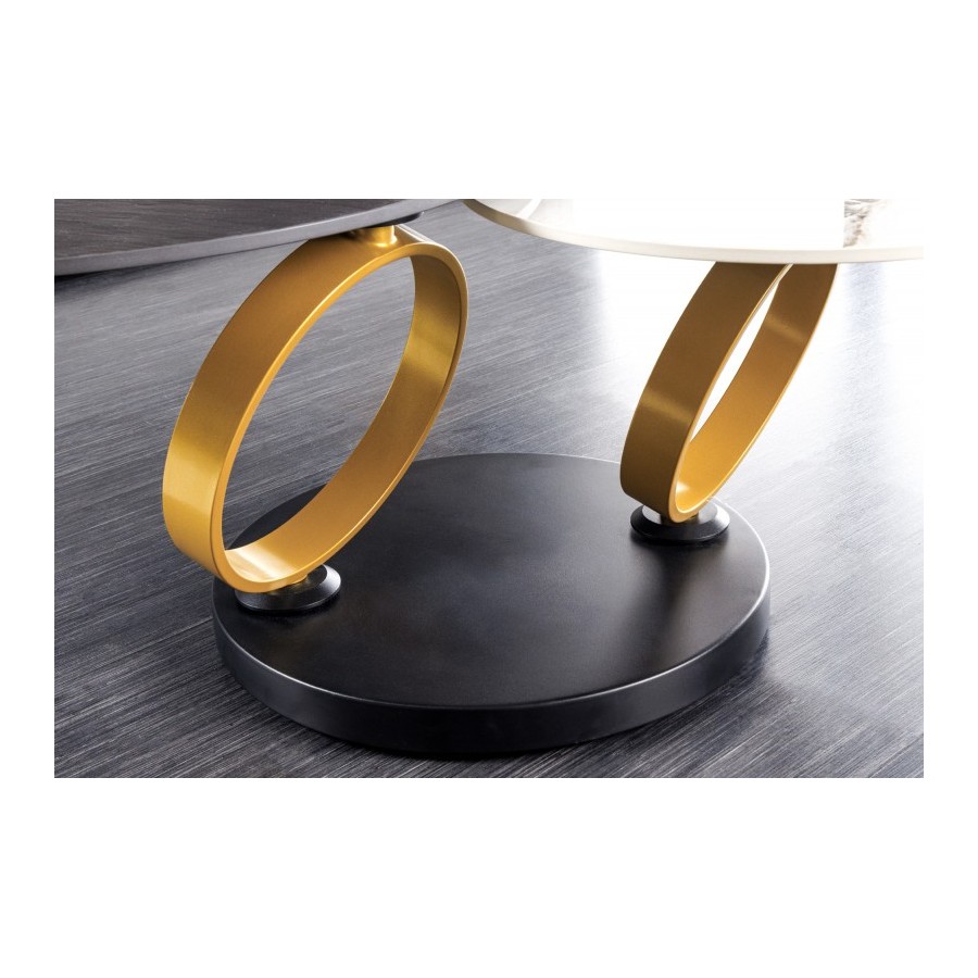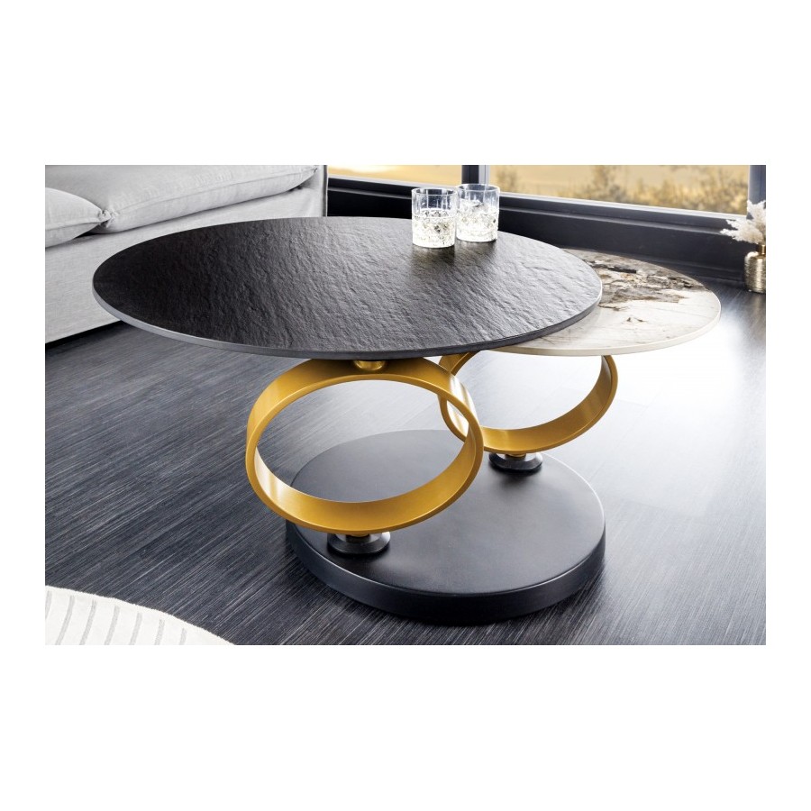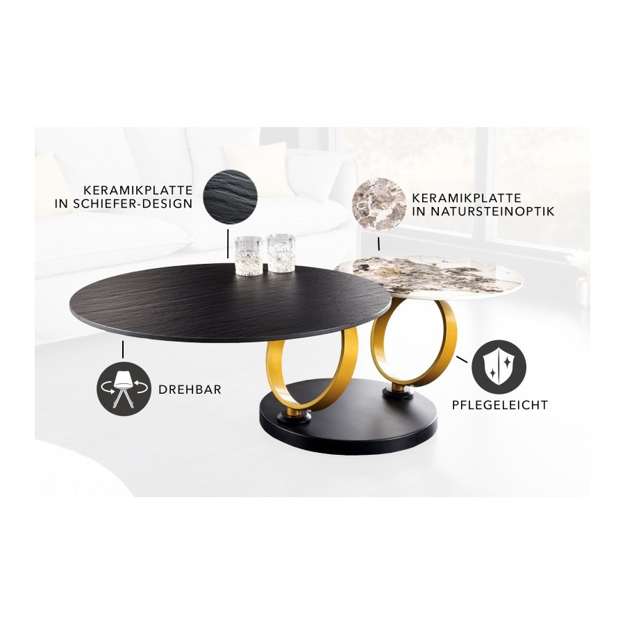Duży ceramiczny blat zapewnia mnóstwo miejsca do przechowywania tuż obok sofy. Ale mniejszy blat w kolorze jasnego kamienia naturalnego to także praktyczne miejsce do przechowywania w Twoim salonie. Dla fanatyków funkcjonalności ten mebel to wyższa klasa stołów do salonu – bo gdy tylko obróci się jeden z dwóch blatów, drugi automatycznie obraca się wraz z nim! Stolik kawowy nie tylko wnosi ponadczasową elegancję do Twojego salonu, ale jako mebel modułowy oferuje również elastyczne możliwości przechowywania. Rama stołu wykonana z dwóch złotych metalowych pierścieni nadaje funkcjonalnemu stolikowi kawowemu efektowny wygląd. Każdy stolik kawowy jest wykonany z najwyższą precyzją i starannością, aby stworzyć wyjątkowy mebel, który doda wyjątkowego akcentu każdemu pomieszczeniu. Nasza rada dotycząca wnętrz: ten sprytny dodatek pozwoli Ci wnieść do Twojego salonu nie tylko styl, ale także funkcjonalność.