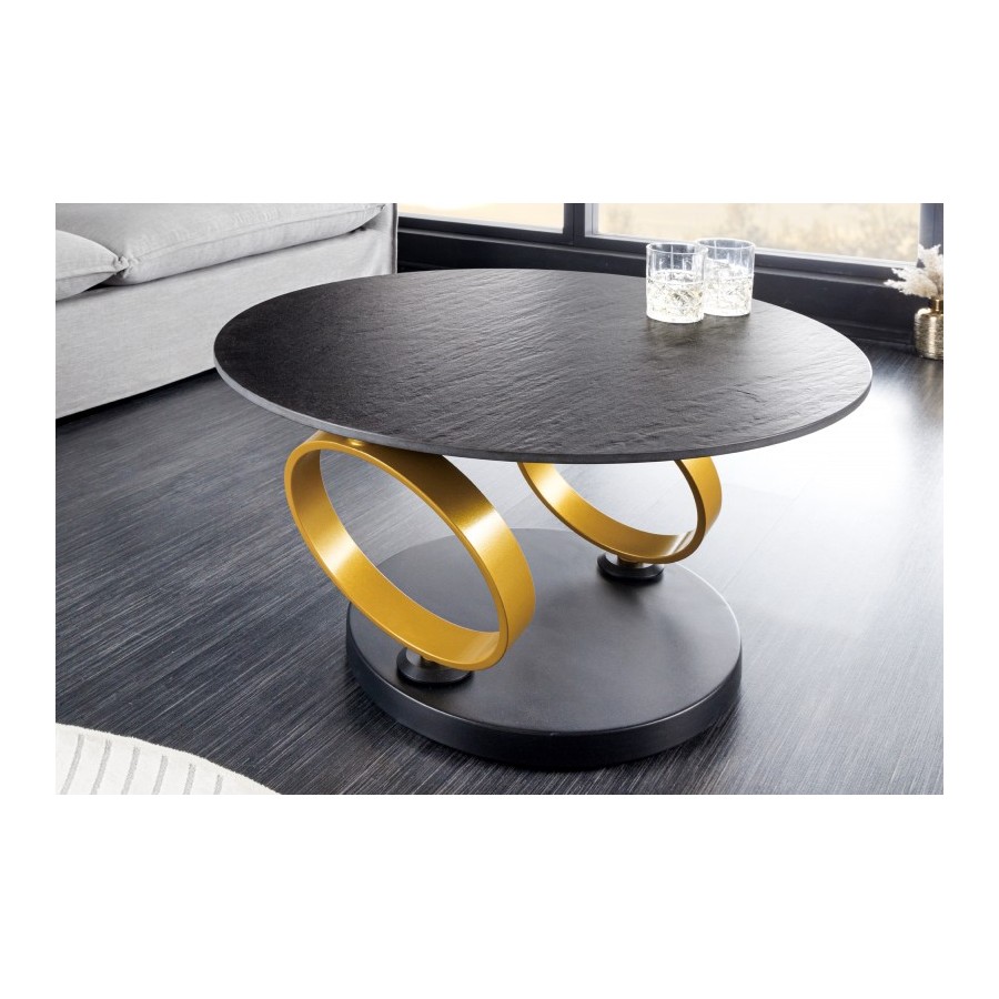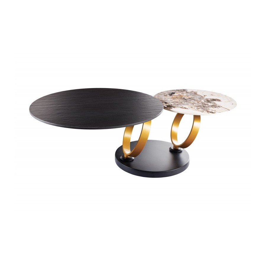 Szukasz ponadczasowo pięknego stolika kawowego o praktycznym designie? W takim razie stolik kawowy DANCING RINGS będzie idealnym meblem dla Ciebie! Obszerne, okrągłe blaty wykonane z wysokiej jakości ceramiki spełniają najwyższe standardy jakości, a także zachwycają praktyczną funkcją obracania. Oznacza to, że stolik kawowy dopasowuje się indywidualnie do Twoich potrzeb w salonie. Okrągłe blaty o wyglądzie kamienia naturalnego i ciemnego łupka nadają temu stołowi do salonu futurystyczny wygląd, który idealnie komponuje się z nowoczesnym otoczeniem. Nareszcie Twoje poszukiwania dobiegły końca dzięki idealnemu stołowi do salonu DANCING RINGS!