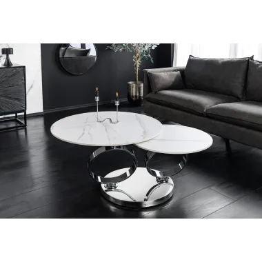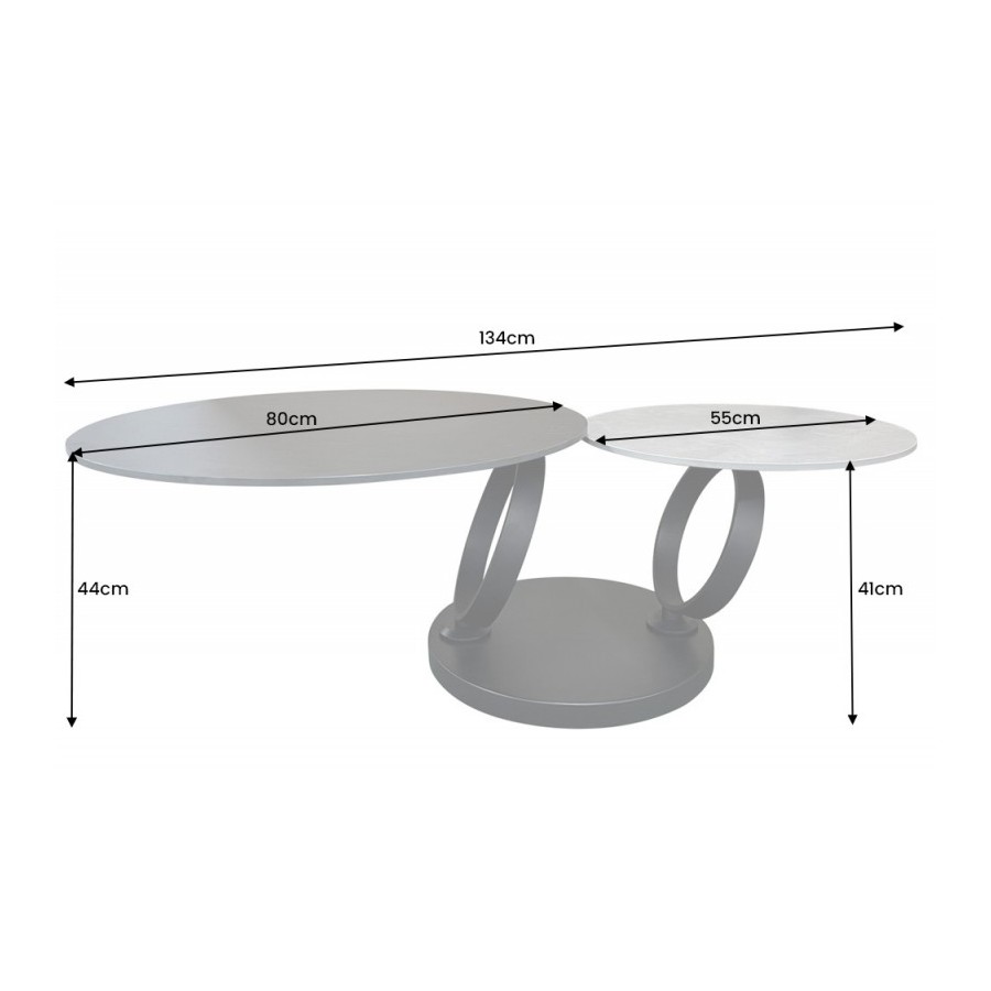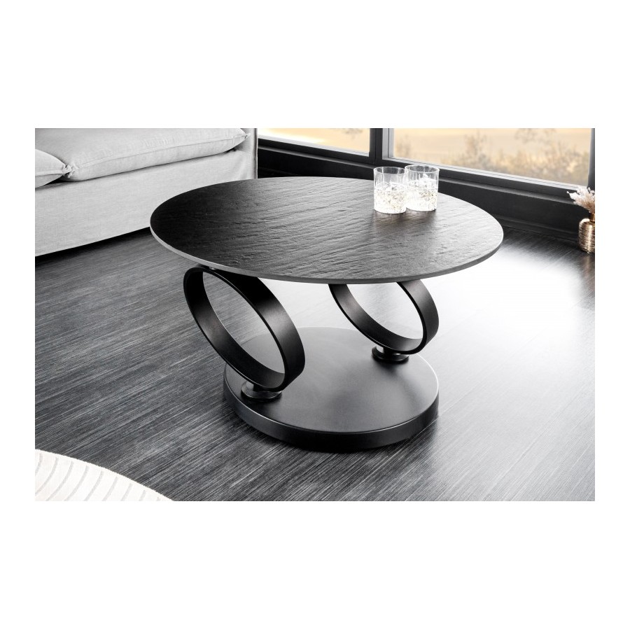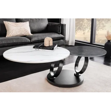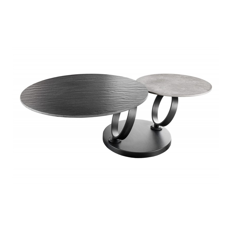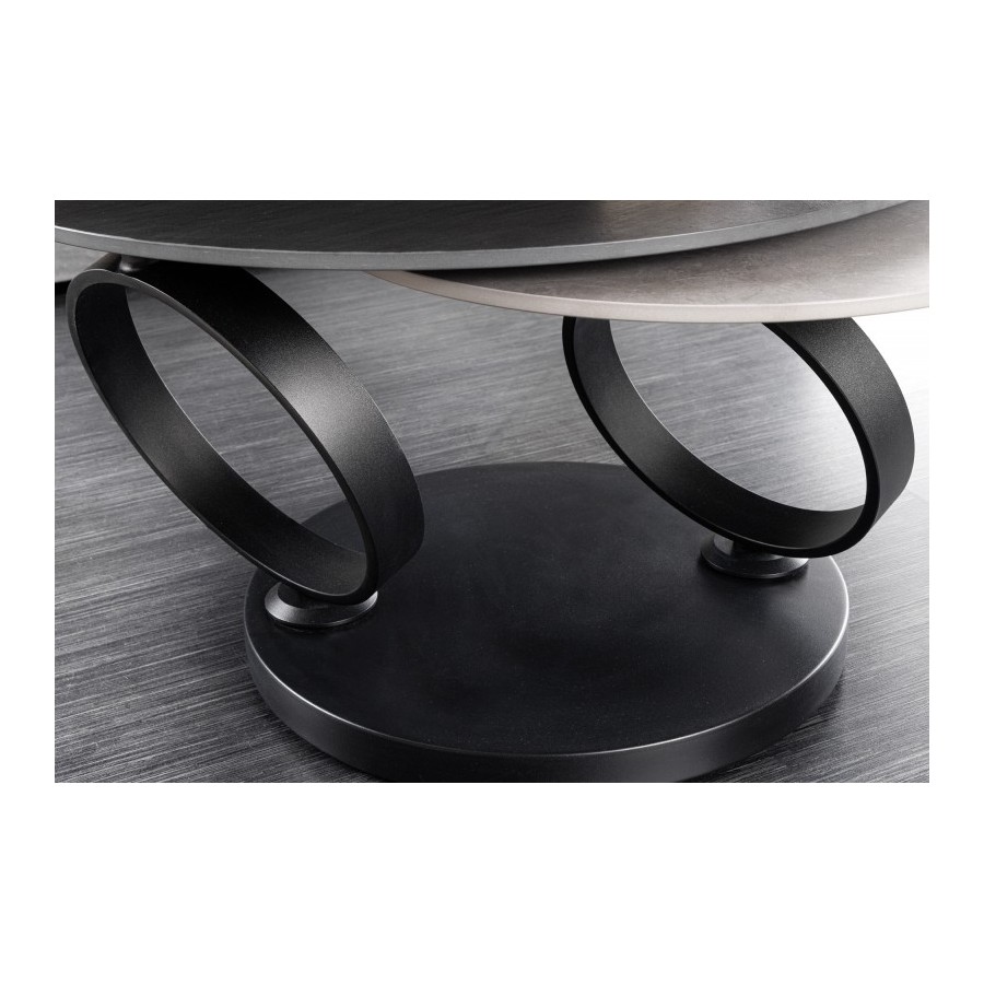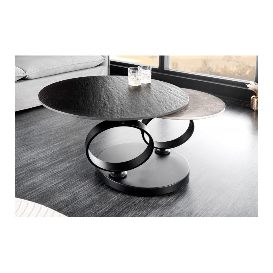 Szukasz ponadczasowo pięknego stolika kawowego o praktycznym designie? W takim razie stolik kawowy DANCING RINGS będzie idealnym meblem dla Ciebie! Obszerne, okrągłe blaty wykonane z wysokiej jakości ceramiki spełniają najwyższe standardy jakości, a także zachwycają praktyczną funkcją obracania. Oznacza to, że stolik kawowy dopasowuje się indywidualnie do Twoich potrzeb w salonie. Okrągłe blaty o wyglądzie kamienia naturalnego i ciemnego łupka nadają temu stołowi do salonu futurystyczny wygląd, który idealnie komponuje się z nowoczesnym otoczeniem. Nareszcie Twoje poszukiwania dobiegły końca dzięki idealnemu stołowi do salonu DANCING RINGS!