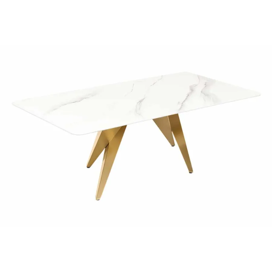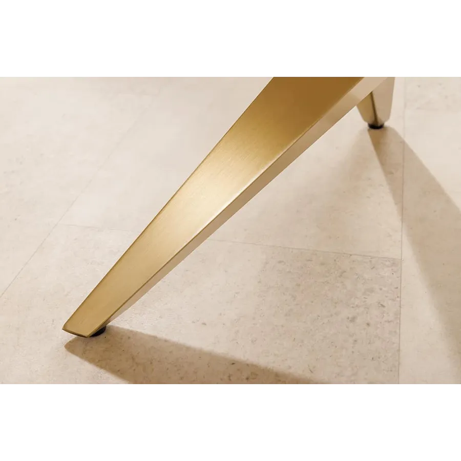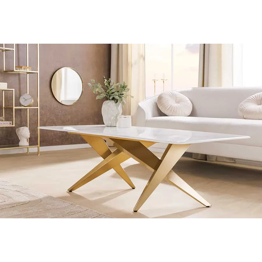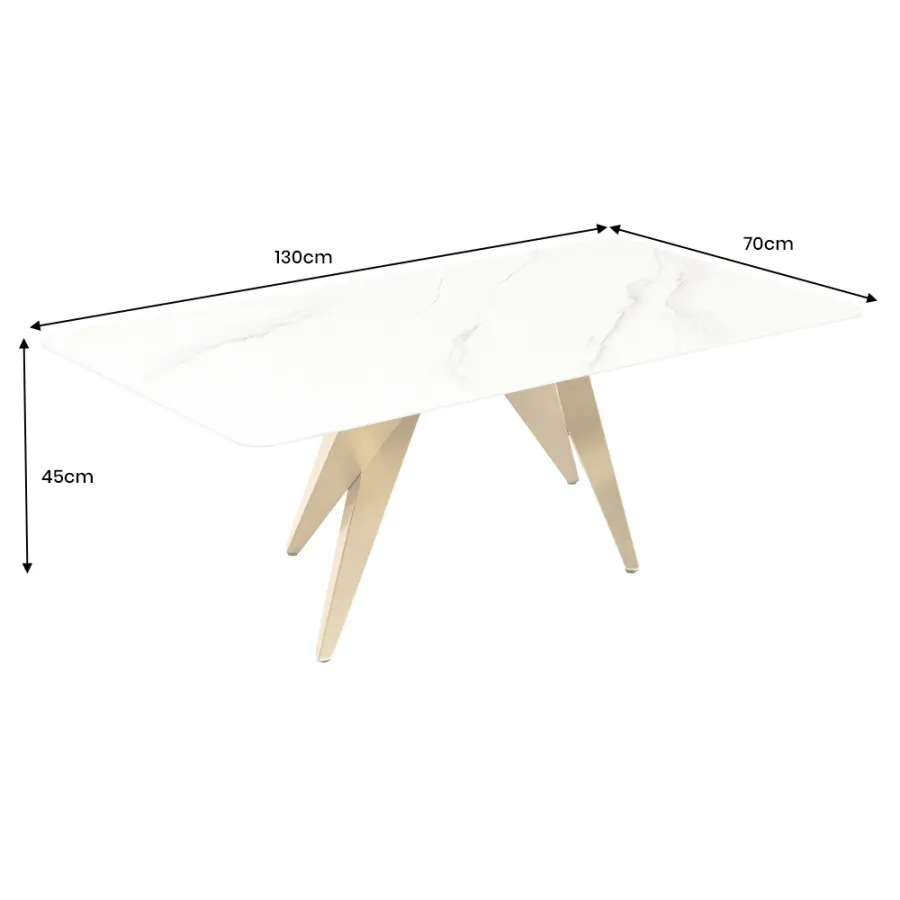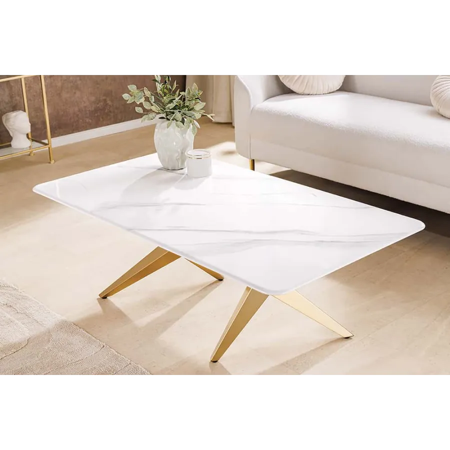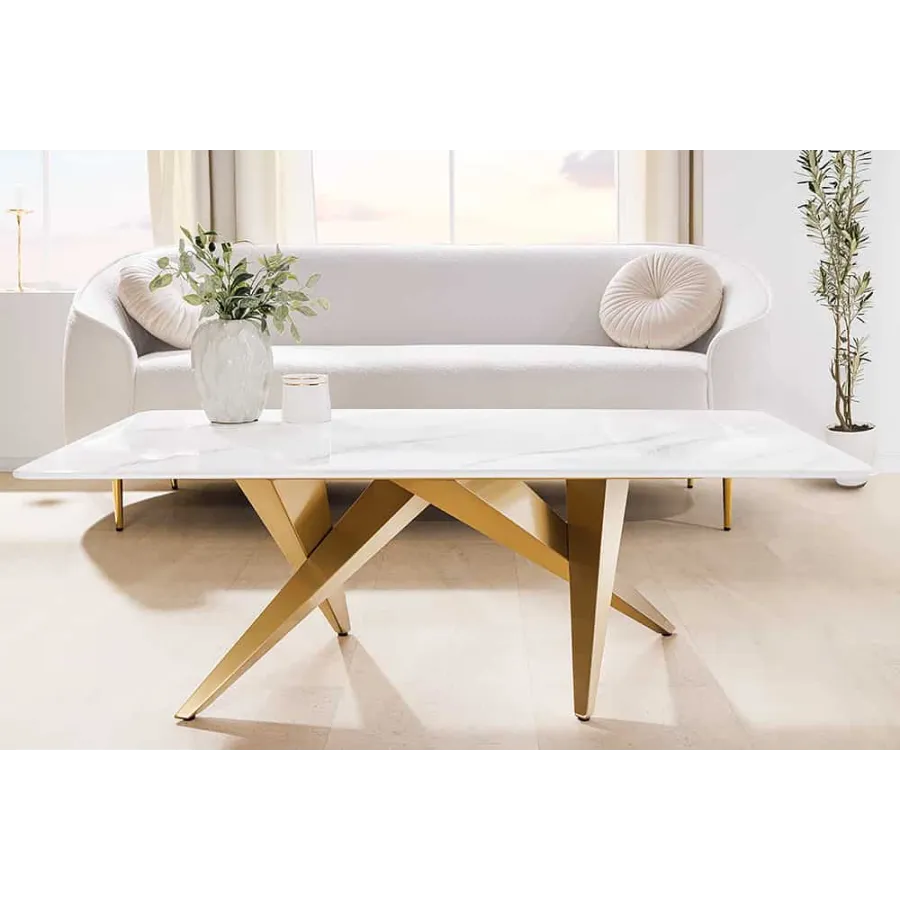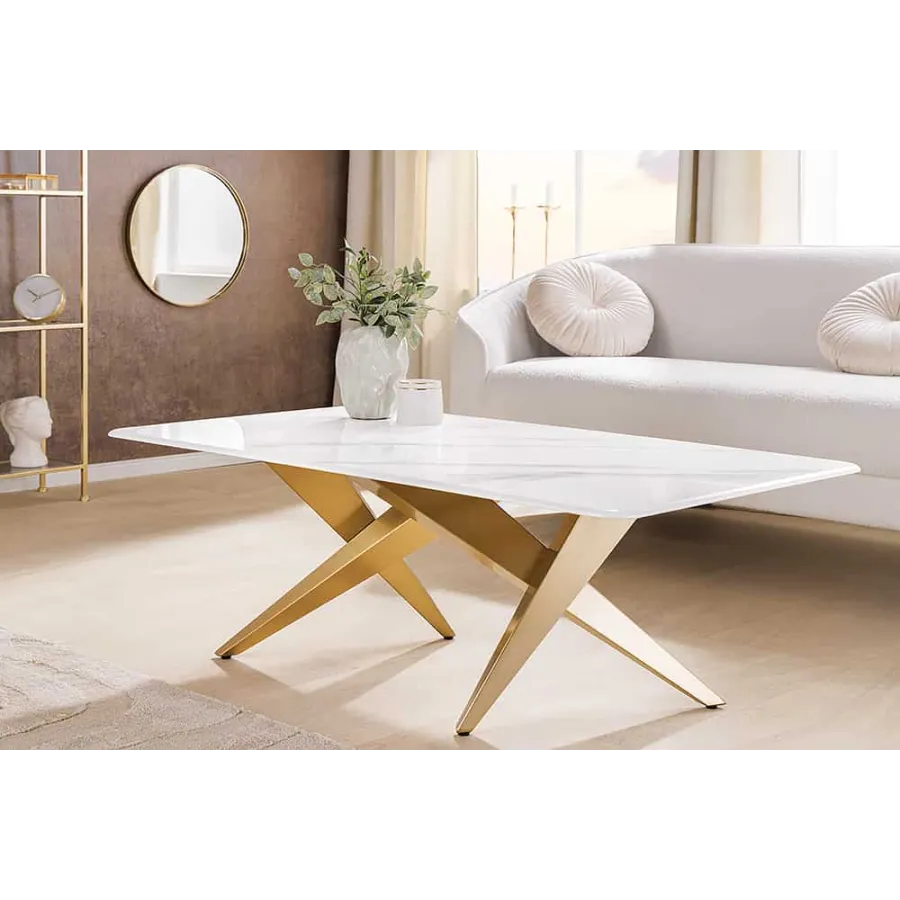 Stolik kawowy ART LIVING zachwyca eleganckim połączeniem białej ceramiki o marmurowym wzorze i filigranowej ramy w kolorze szczotkowanego złota szampańskiego. Przejrzysty design i wysokiej jakości materiały czynią z niego stylowy element centralny Twojego salonu. Elegancki blat stołu wniesie odrobinę luksusu do Twojego salonu, a delikatna metalowa rama zapewni lekkość i elegancję.