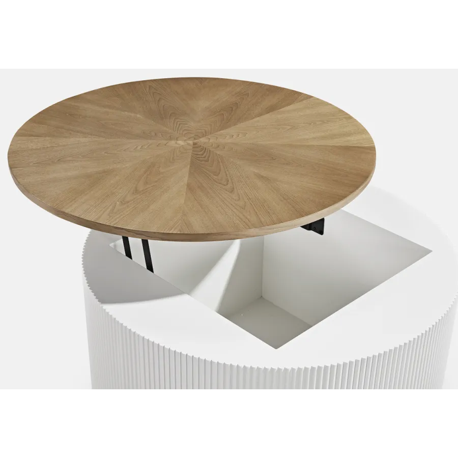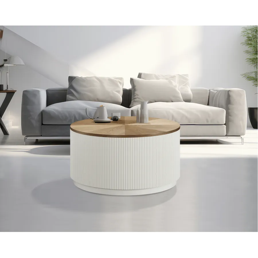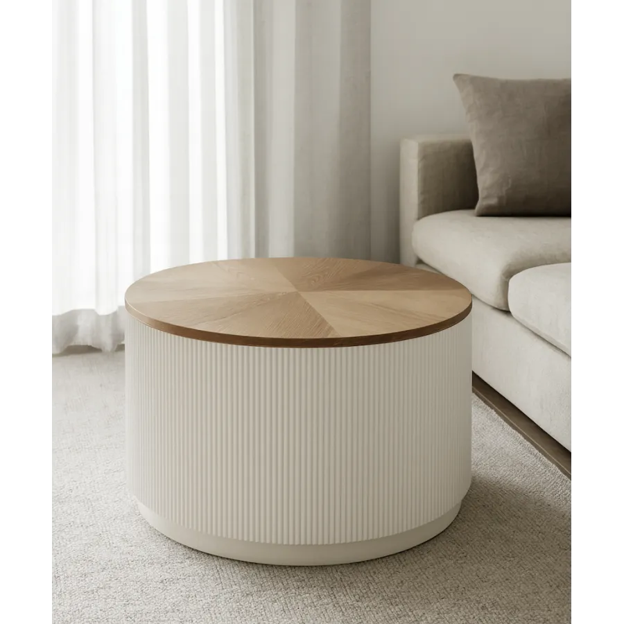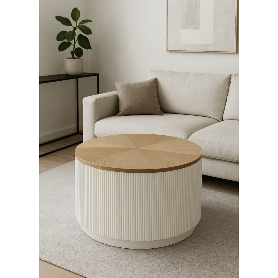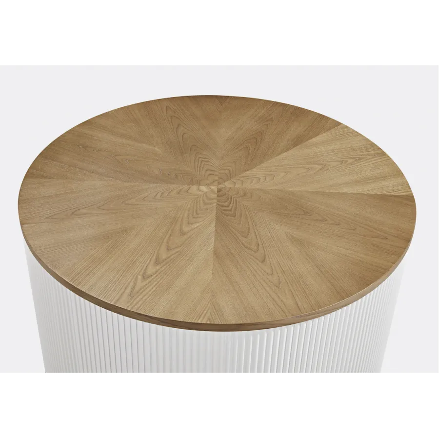 Korpus wykonany z ryflowanego drewna tworzy efekt trójwymiarowej struktury, a okrągły blat z okleiną z drewna wiązu nadaje całości lekkości i ponadczasowego charakteru.