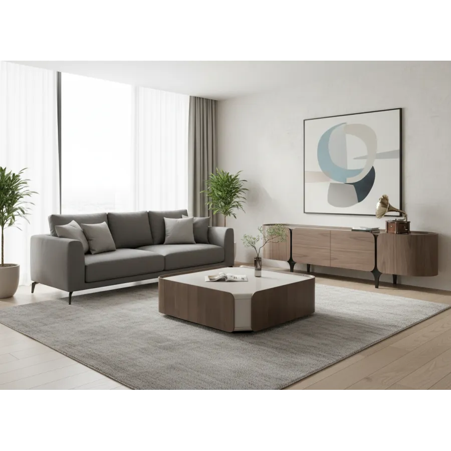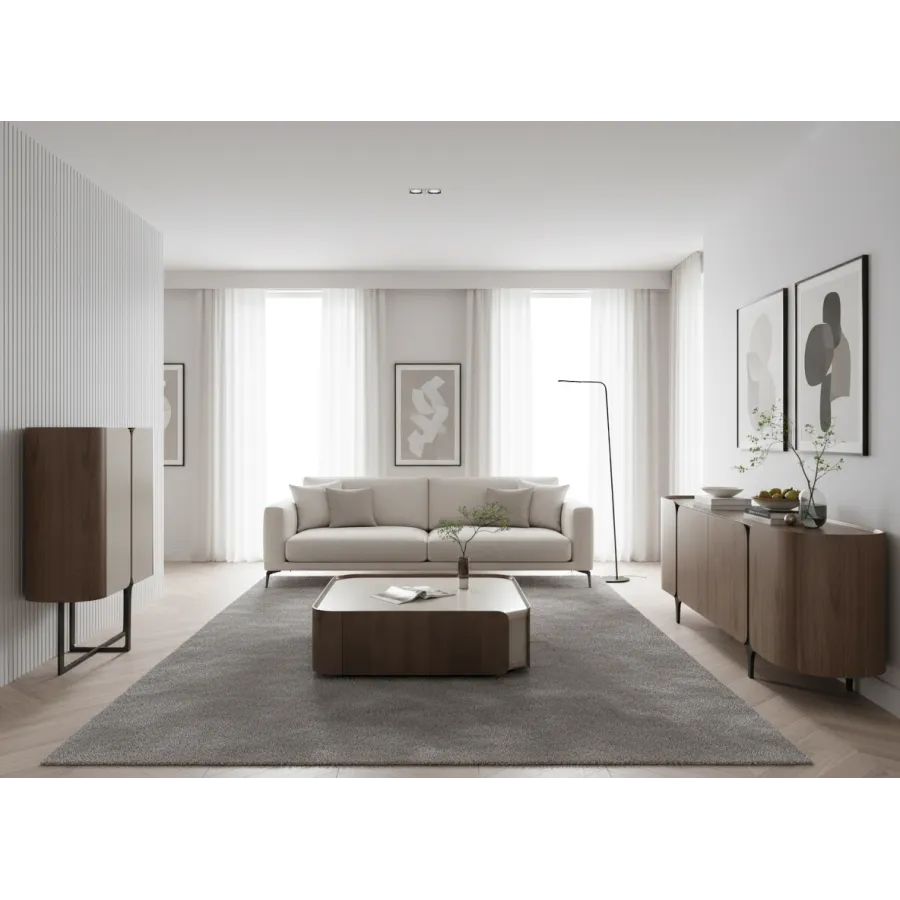 Minimalistyczny stolik kawowy w kolorze kaszmiru i orzecha włoskiego z widoczną strukturą drewna. Bryła korpusu ma zaokrąglone boki a fronty obłe krawędzie.