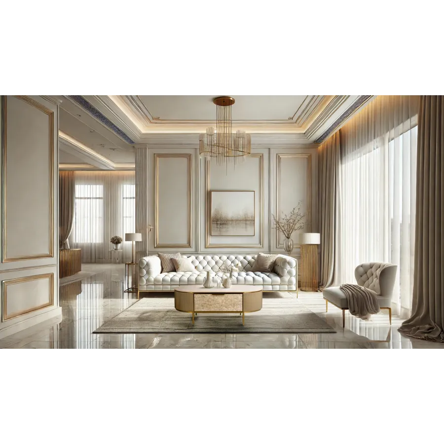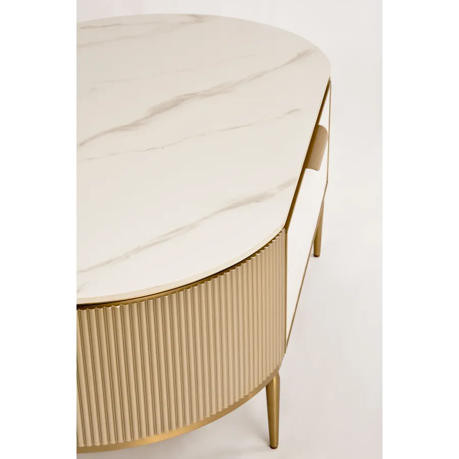 Szampańskie złoto, złote nogi i akcenty, jasnokremowy front, biały marmurowy blat