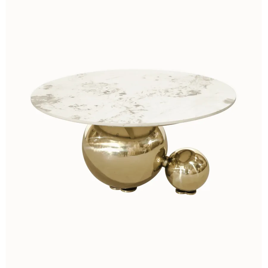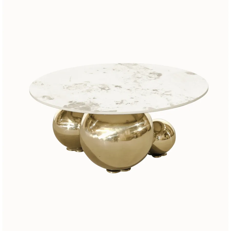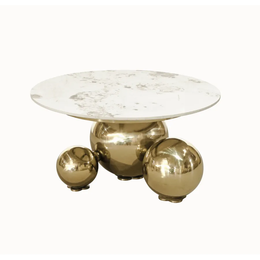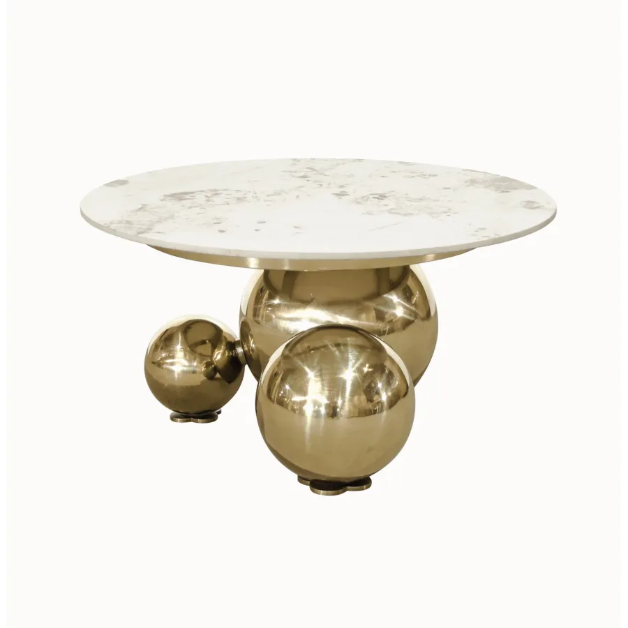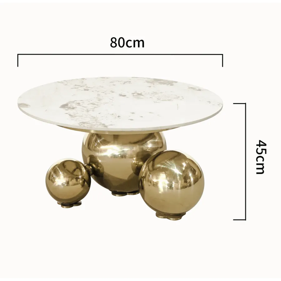 Ten oryginalny stolik kawowy zachwyca niebanalnym designem i luksusowym wykończeniem. Podstawa z trzech połączonych, chromowanych kul w kolorze złota przyciąga wzrok i nadaje meblowi wyjątkowy charakter.