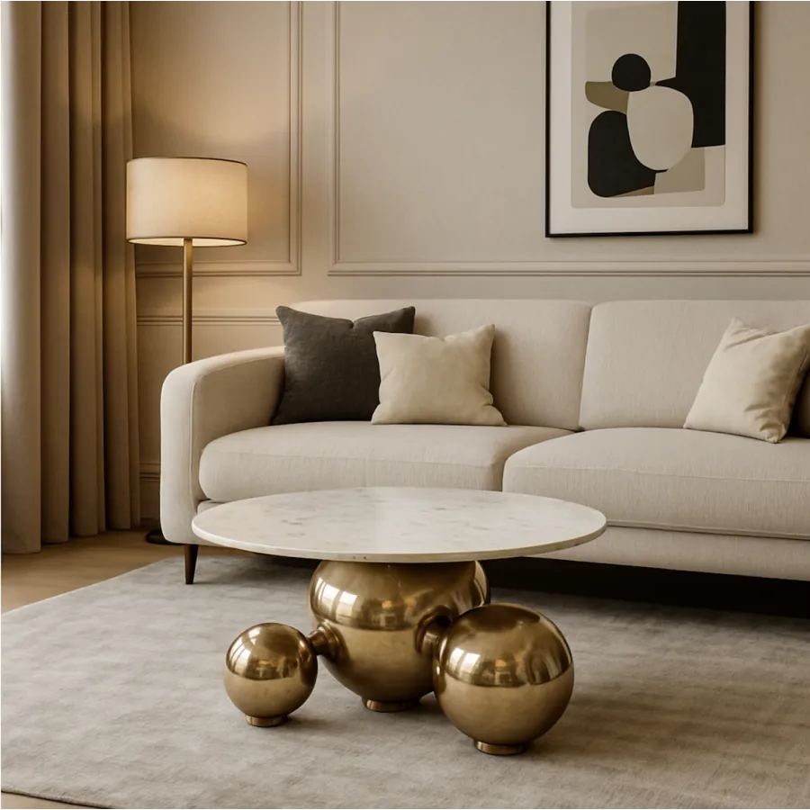 Nowoczesny stolik kawowy z marmurowym blatem i złotą podstawą
