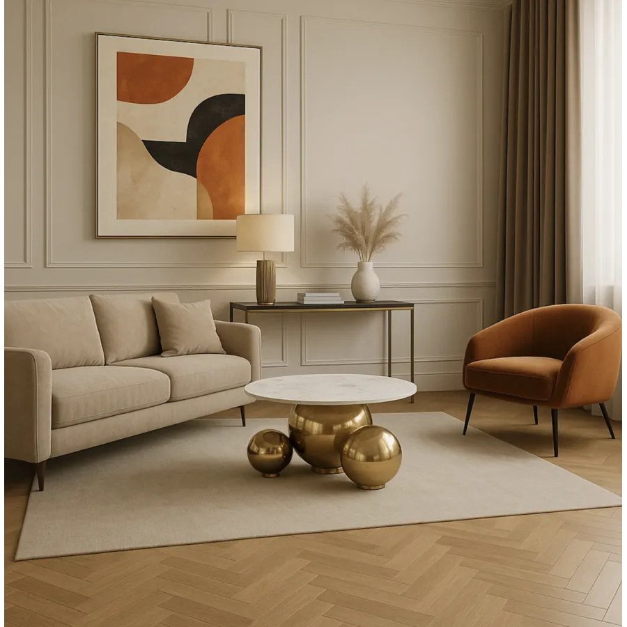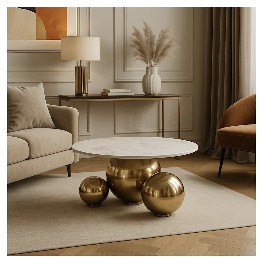Okrągły blat imitujący biały marmur doskonale komponuje się z połyskiem złota, tworząc eleganckie i nowoczesne połączenie, które wprowadza do wnętrza nutę stylu glamour i modern luxury.
