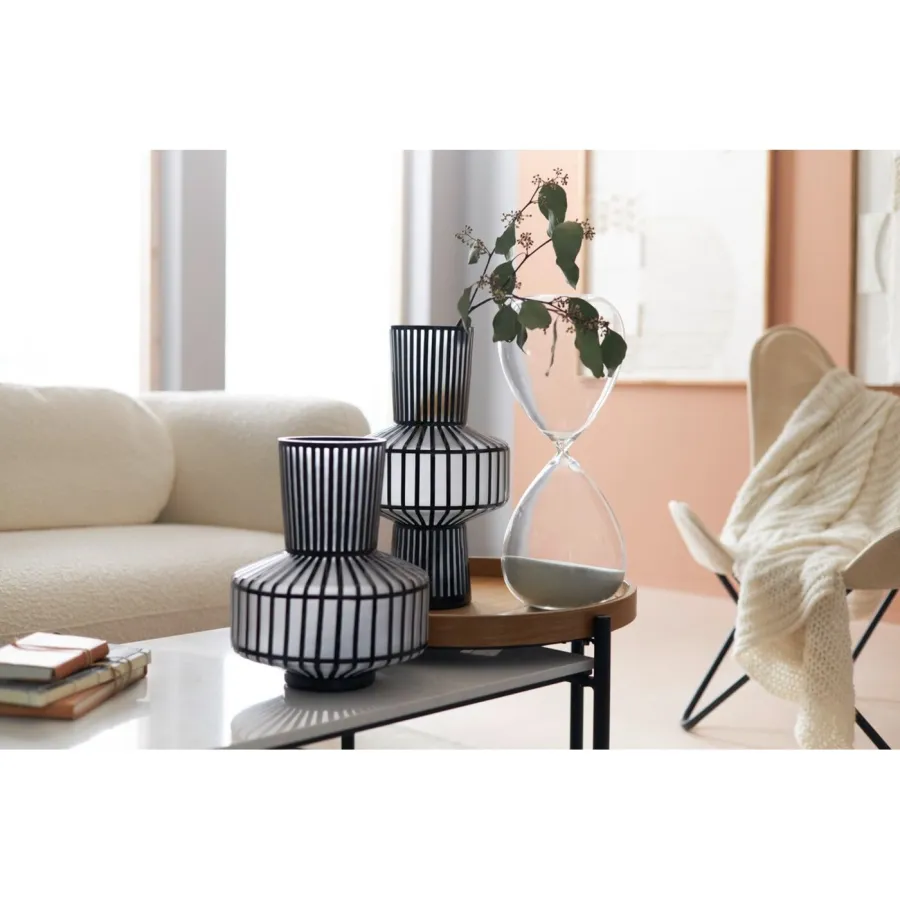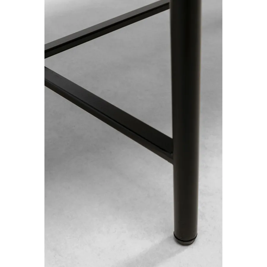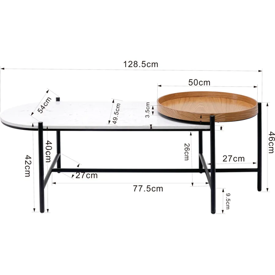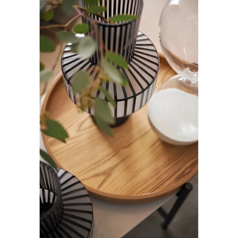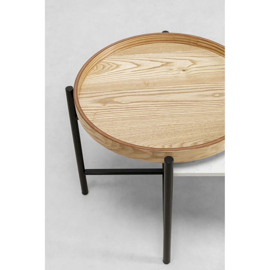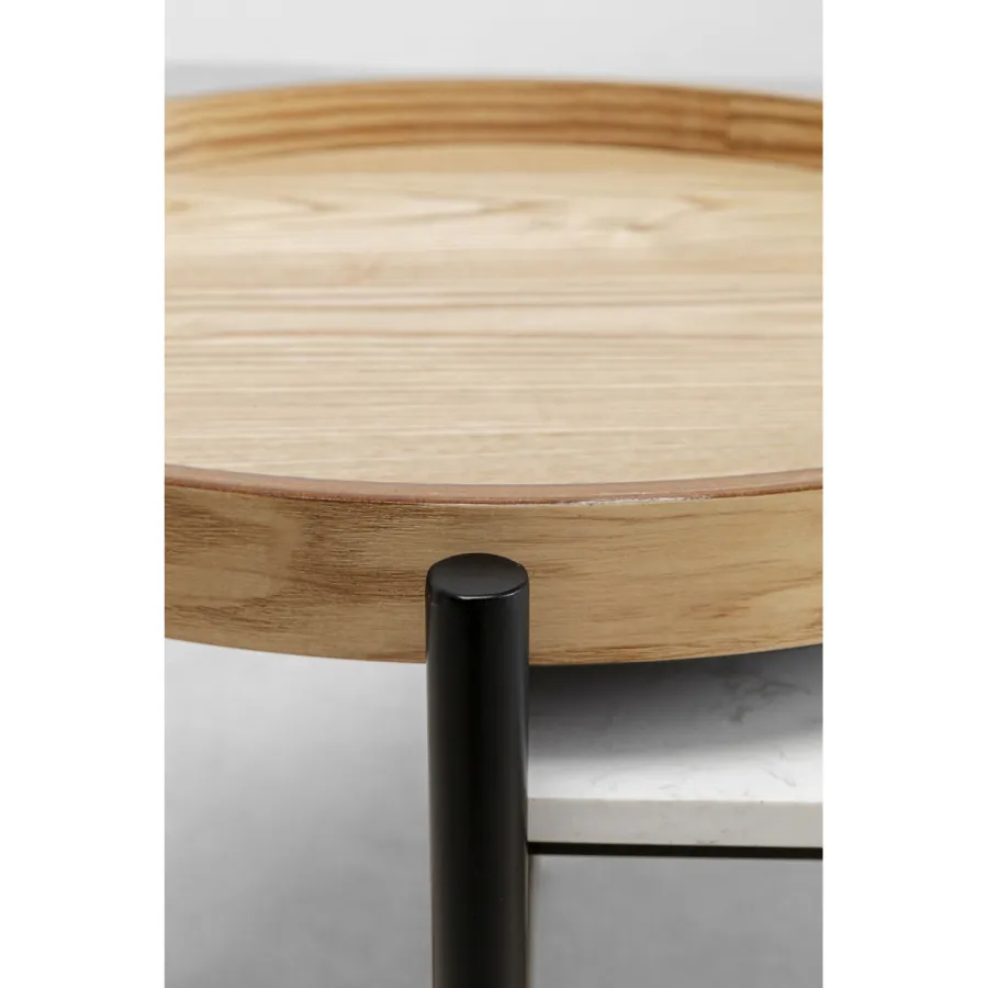 Połączenie kolorystyczne czerni, bieli i jasnego drewna jest eleganckie i wiecznie młode. Ten obszernie rozmieszczony stolik boczny można połączyć z minimalistycznymi meblami lub zapewnić szykowny kontrast z miękkimi meblami tapicerowanymi w aksamicie. Dwa geometryczne blaty zachęcają do wykorzystania stolika kawowego nie tylko jako funkcjonalnego schowka, ale także do udekorowania go bukietami kwiatów i dodatkam