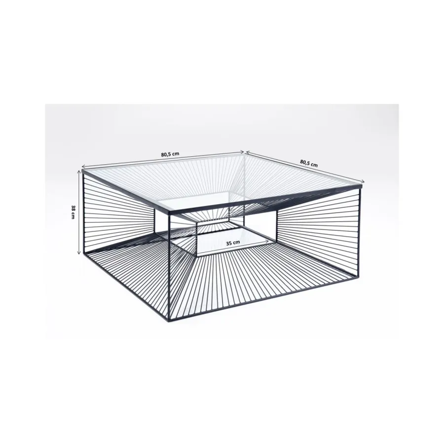 Ten graficzny, zmniejszony stolik kawowy z przezroczystym szklanym blatem jest atrakcją projektu: ręcznie wykonana rama z drutu stalowego tworzy oszałamiające efekty wizualne i dodaje czegoś bardzo nowoczesnego do każdego wnętrza