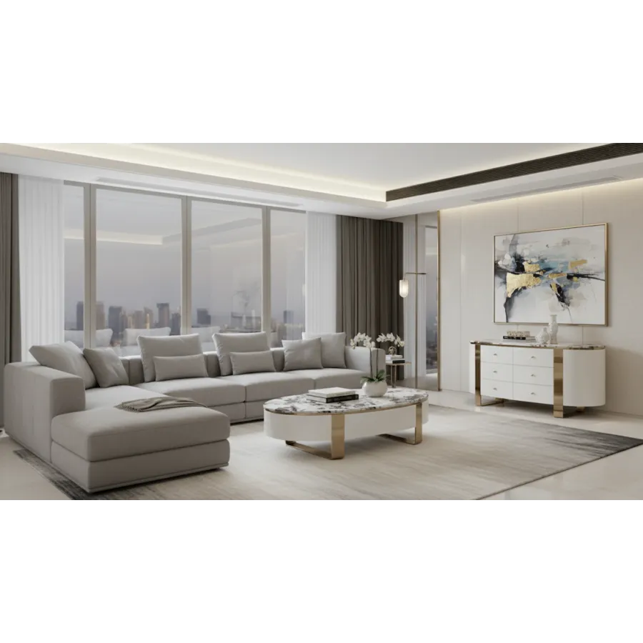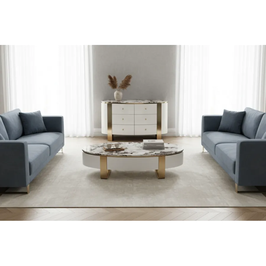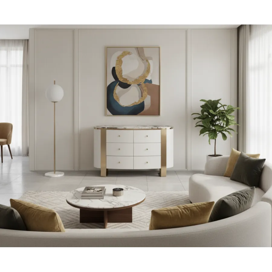 Ten owalny stolik w odcieniu złamanej bieli zachwyca subtelną elegancją i ponadczasowym designem. Jej charakterystycznym elementem są pionowe panele oraz nogi w kolorze szczotkowanego złota, które płynnie łączą się z zaoblonymi bokami mebla, tworząc harmonijną i nowoczesną sylwetkę. Front komody zdobi sześć smukłych szuflad z drobnymi, złotymi uchwytami o biżuteryjnym charakterze. Marmurowy blat — w ciepłej tonacji beżu, szarości i delikatnych żyłowań — dodaje całości luksusowego wykończenia.