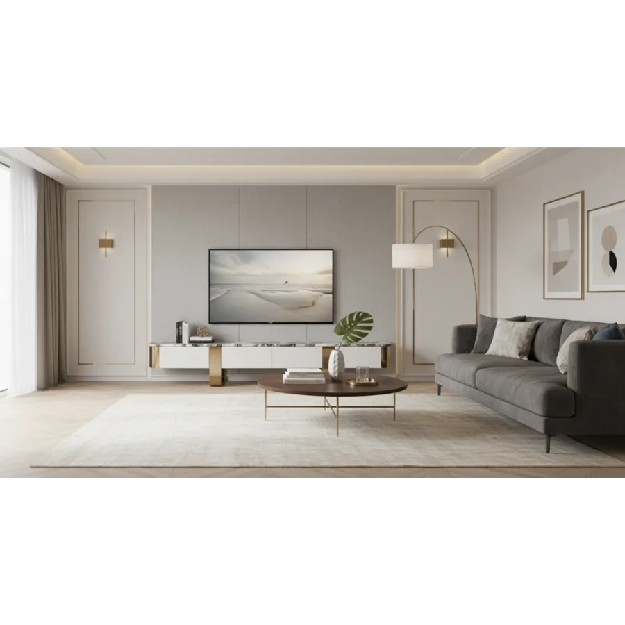 W prezentowanym wnętrzu stolik kawowy staje się centralnym punktem aranżacji. Towarzyszą jej symetrycznie ustawione lampy podłogowe o minimalistycznej formie oraz okrągłe lustro w złotej ramie, podkreślające elegancję i spójność kompozycji. Dekoracje na blacie, takie jak ceramiczny wazon i geometryczna rzeźba, dopełniają estetyki nowoczesnego, jasnego salonu.