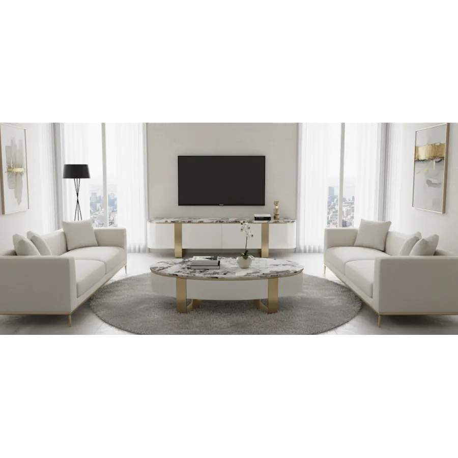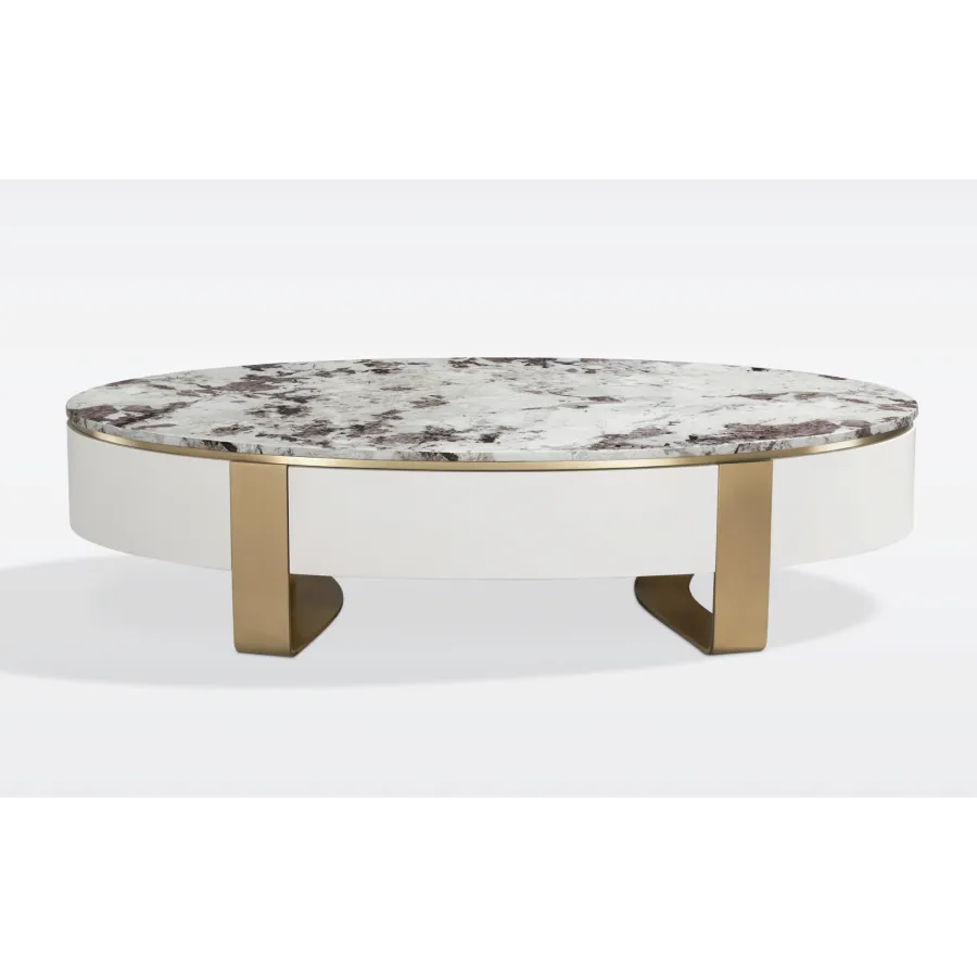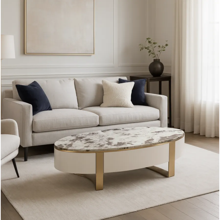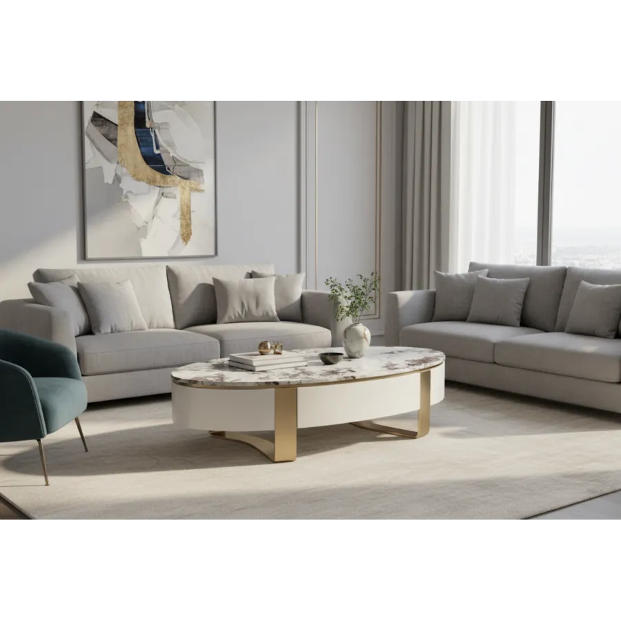 Stylowy owalny stolik w odcieniu złamanej bieli zachwyca elegancką formą i dopracowanymi detalami. Złote akcenty — subtelna listwa podblatowa oraz smukłe nogi płynnie łączące się z frontami — nadają jej wyrafinowanego charakteru. Całość dopełnia blat o marmurowym wykończeniu, który podkreśla luksusowy, ponadczasowy styl mebla.