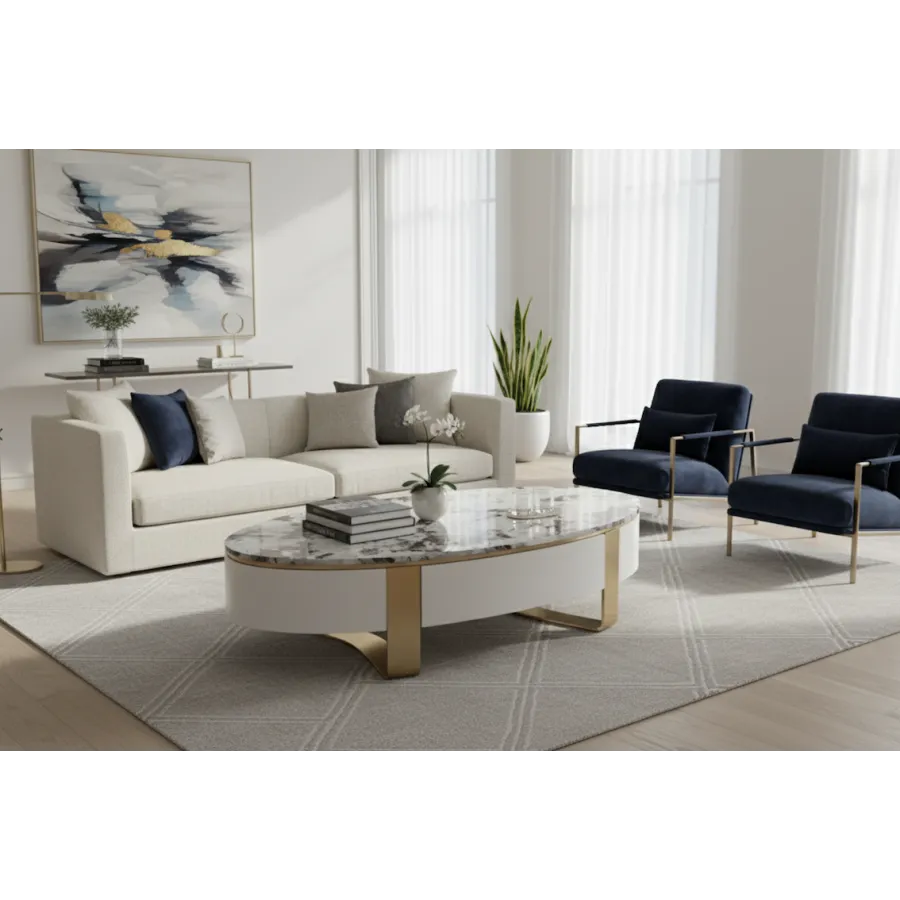 Owalny stolik kawowy w odcieniu złamanej bieli emanuje wysublimowaną elegancją. Jej lekko zaokrągloną formę podkreślają pionowe, złote panele biegnące od blatu aż do podłogi, tworzące stabilną i efektowną konstrukcję nóg. Front zdobią symetrycznie rozmieszczonych szuflady z drobnymi, złotymi uchwytami, które dodają całości biżuteryjnego charakteru. Blat wykonany z marmurowego wzoru w odcieniach beżu, szarości i czerni nadaje meblowi luksusowego wykończenia. Komoda doskonale komponuje się z eleganckim, klasycznym wnętrzem, w którym królują stonowane barwy i złote akcenty.