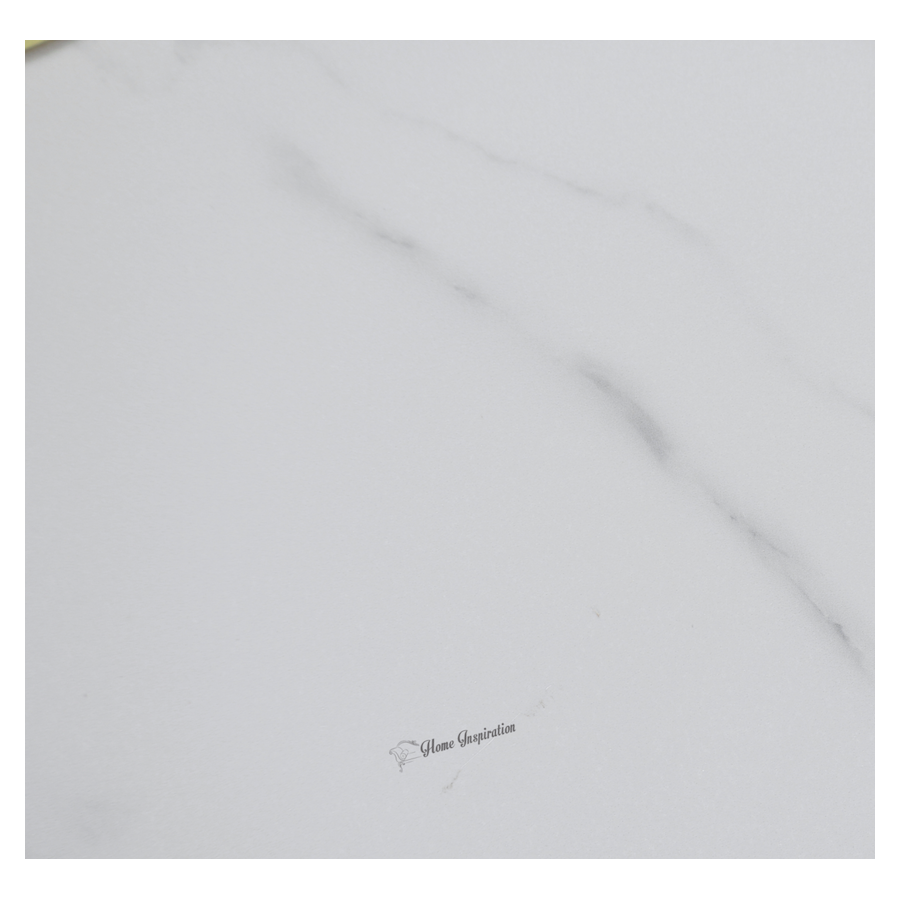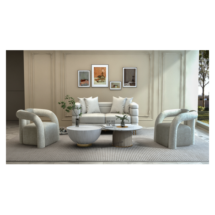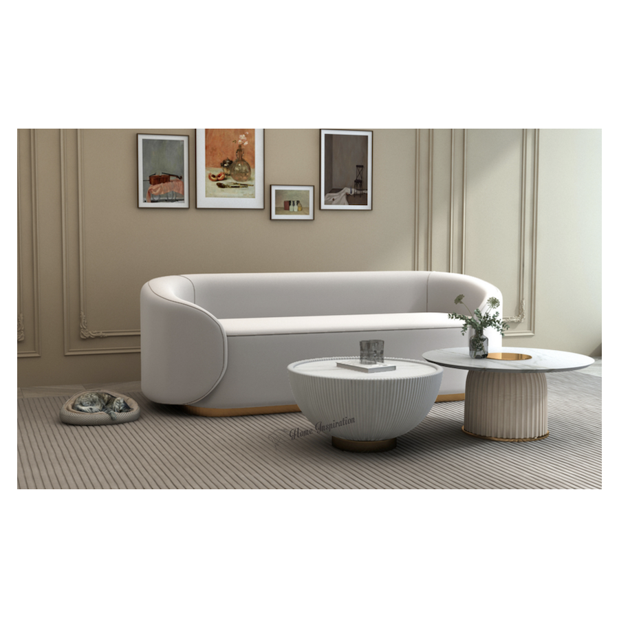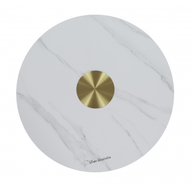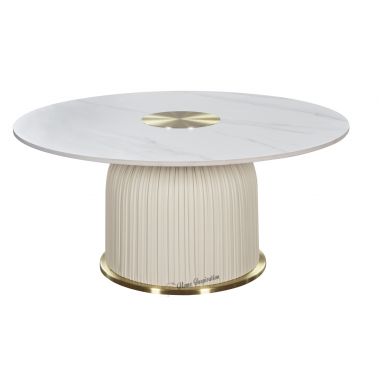 Nowoczesny stolik kawowy o zaokrąglonej ku blatowi nodze, pokrytej białą ekologiczną skórą tworzącą pionowe plisy, na złotej podstawą. Okrągły biały blat jest imitacją marmuru, z akcentem w postaci złotego kręgu.
