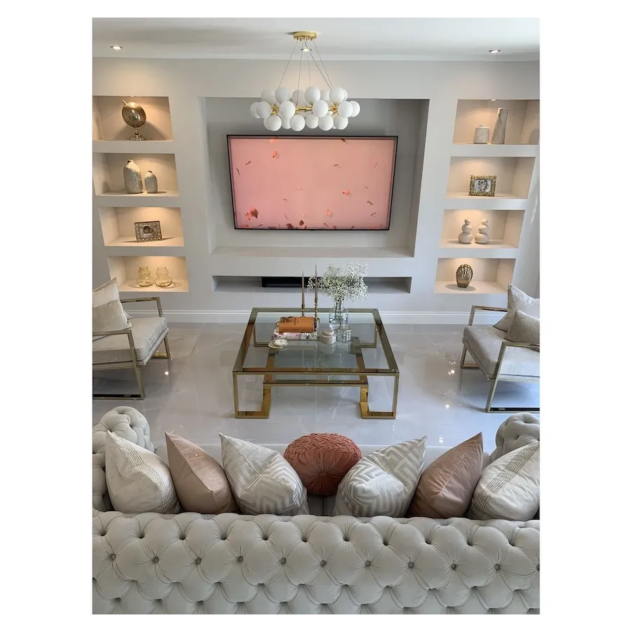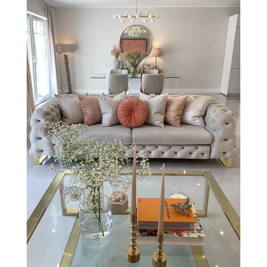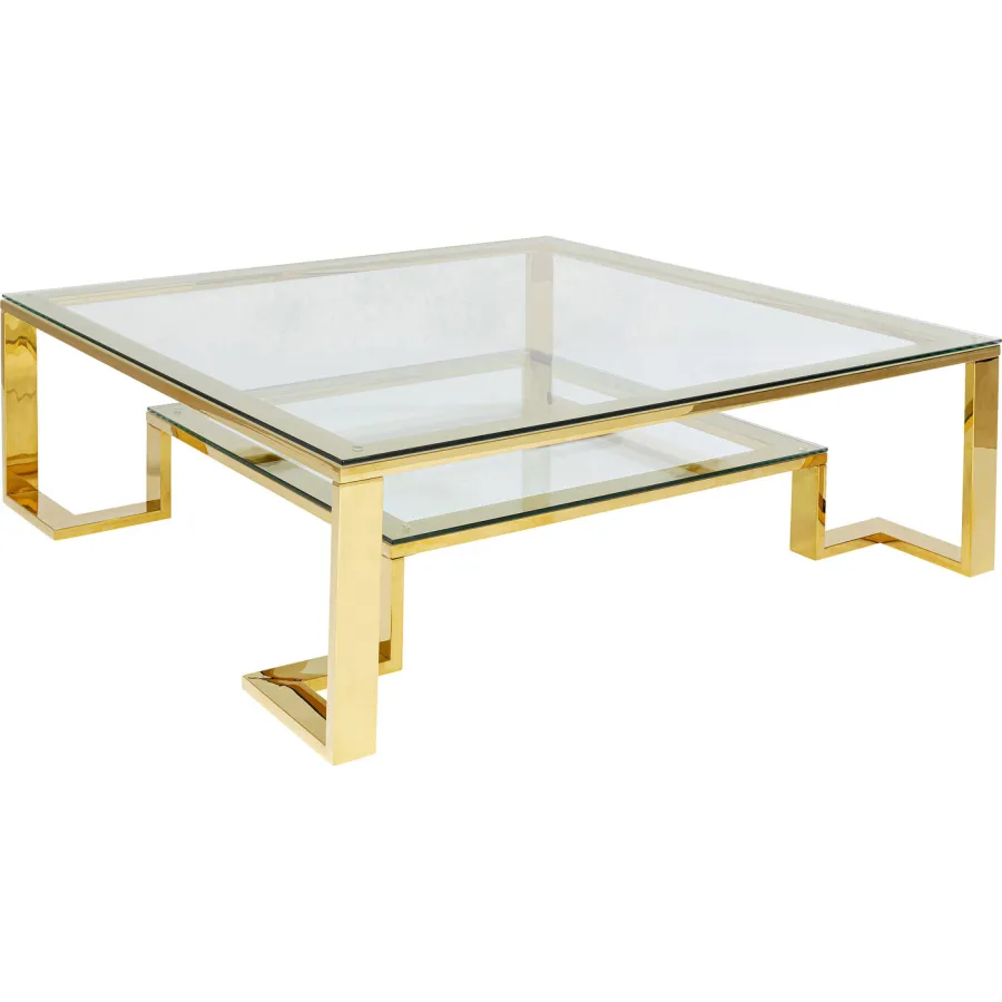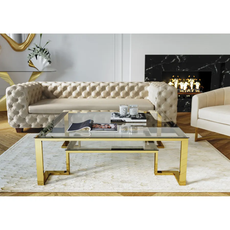 Stolik kawowy Gold Rush to wyjątkowy element wyposażenia salonu, który łączy minimalistyczną formę z luksusowym wykończeniem. Złota konstrukcja w połączeniu z przezroczystymi, szklanymi blatami nadaje wnętrzu lekkości i elegancji, jednocześnie przyciągając wzrok i podkreślając charakter aranżacji.