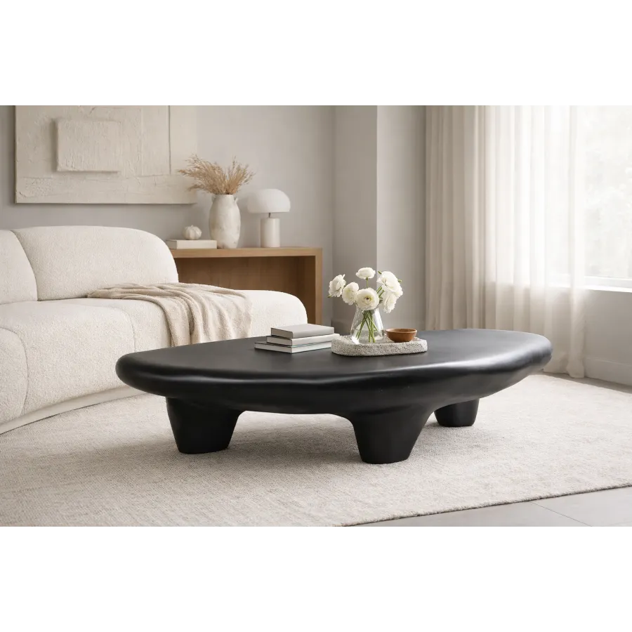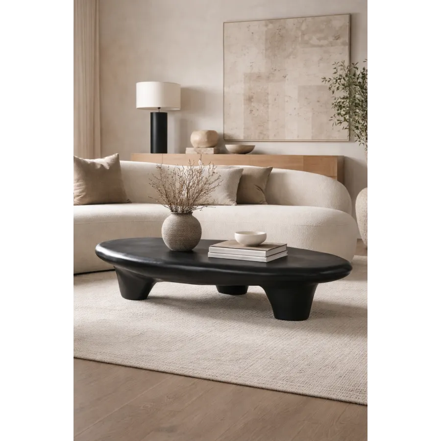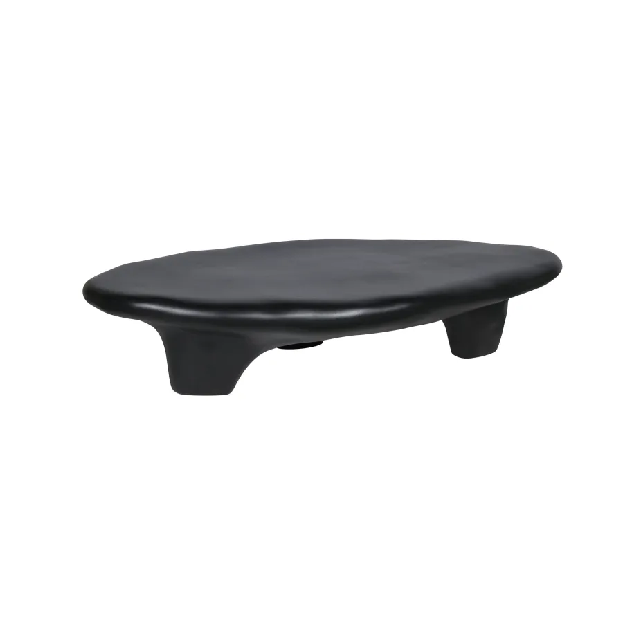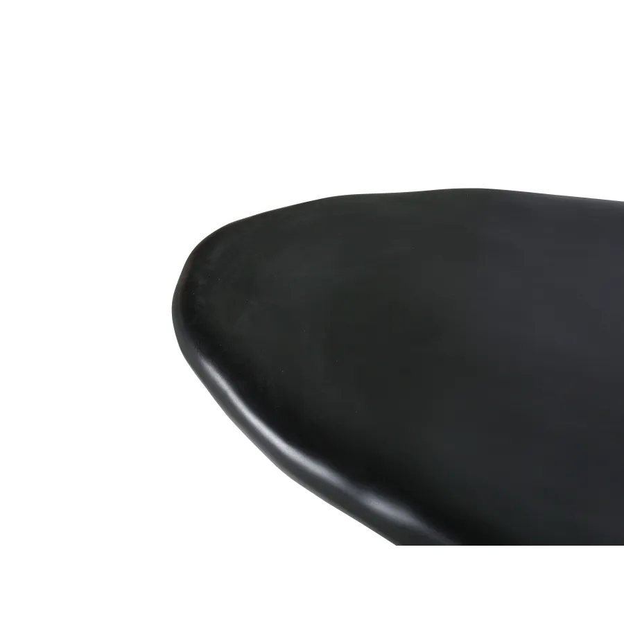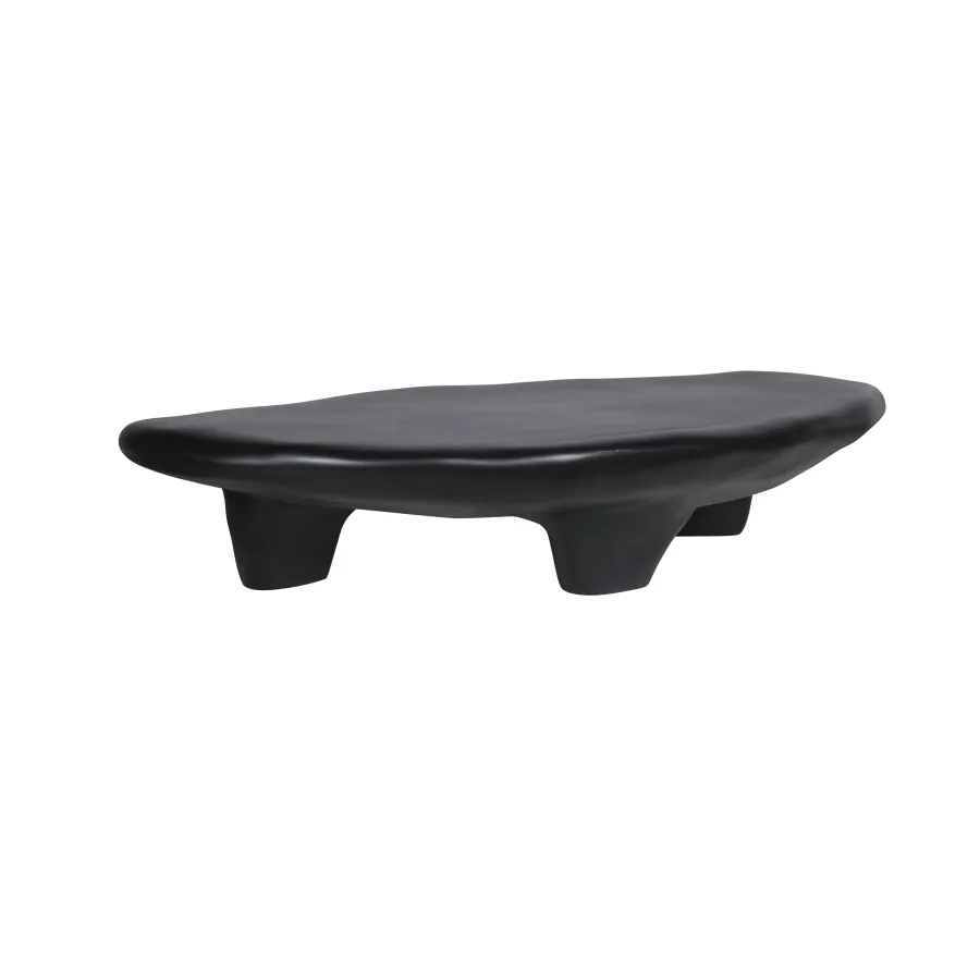 Minimalistyczny stolik wykonany z włókna szklanego w kolorze czarnym. Nieregularny, organiczny kształt inspirowany głazem nadaje rzeźbiarskiego charakteru. Nietuzinkowa forma wpisze się idelanie do nowoczesnego wnętrza.
