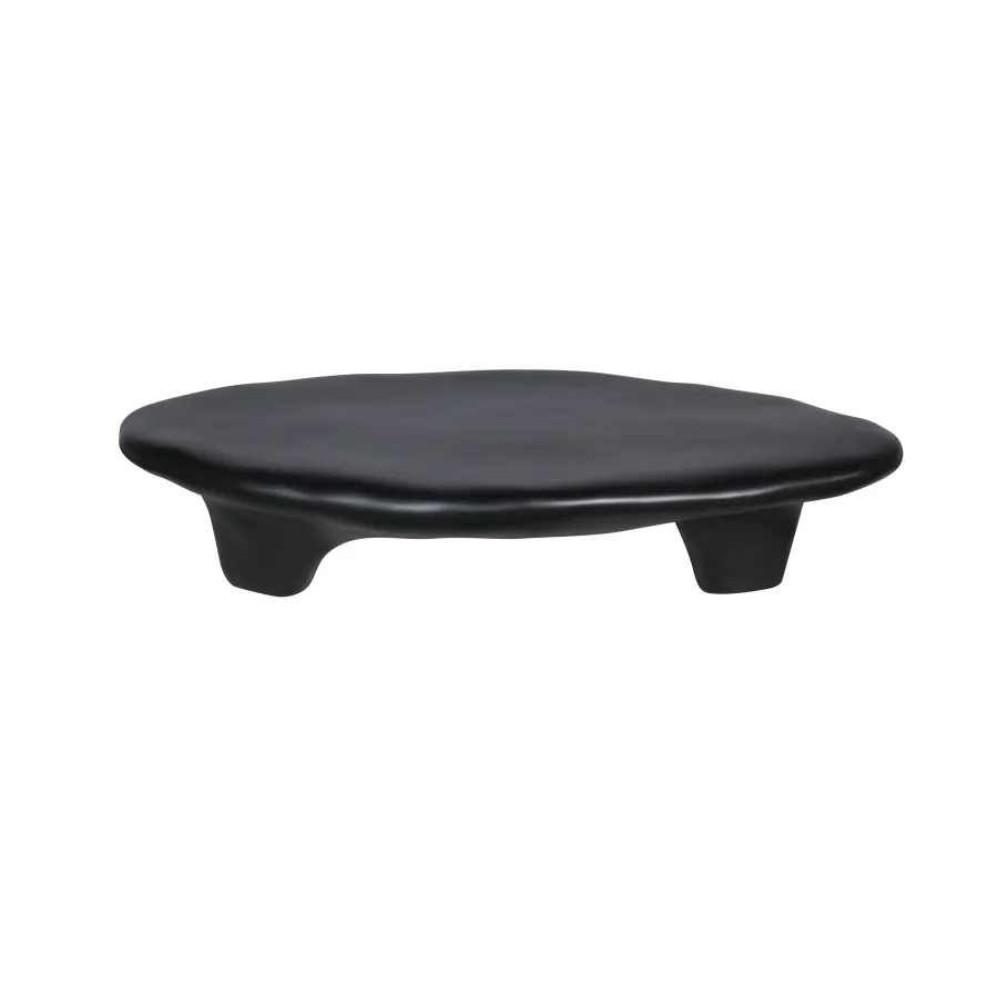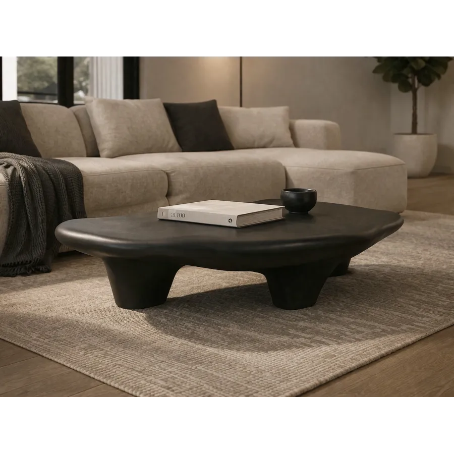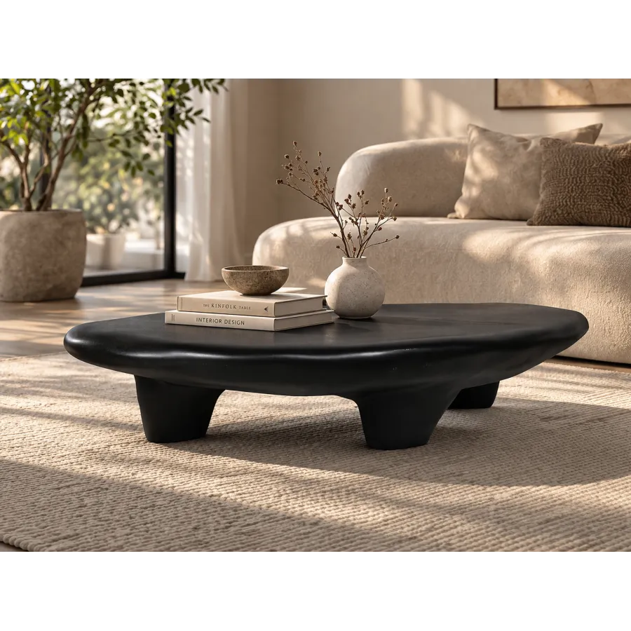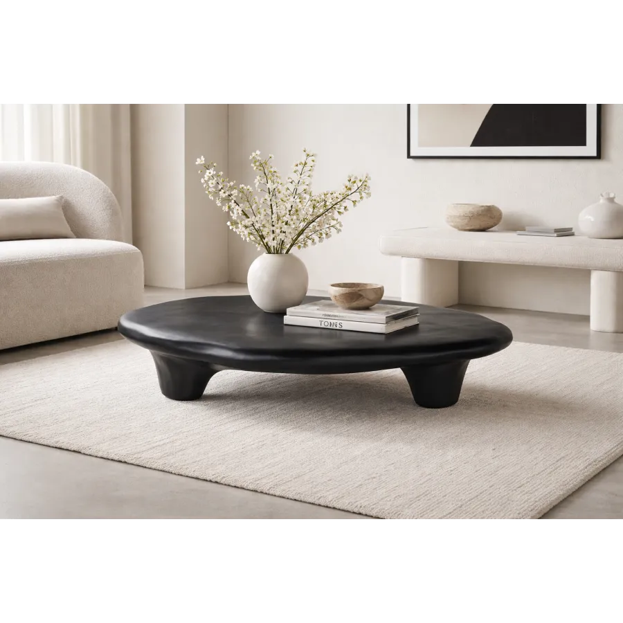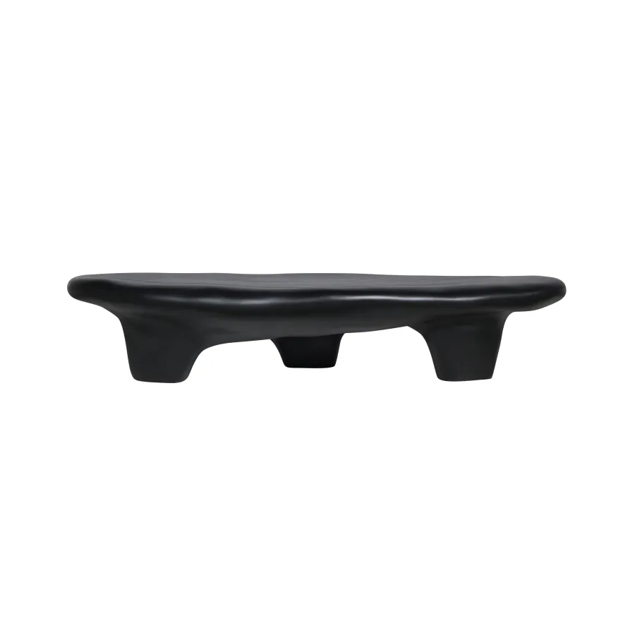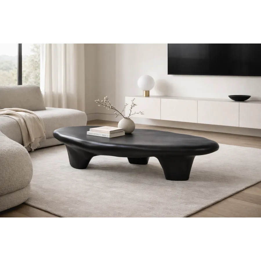 Minimalistyczny stolik wykonany z włókna szklanego w kolorze czarnym. Nieregularny, organiczny kształt inspirowany głazem nadaje rzeźbiarskiego charakteru. Nietuzinkowa forma wpisze się idelanie do nowoczesnego wnętrza.
