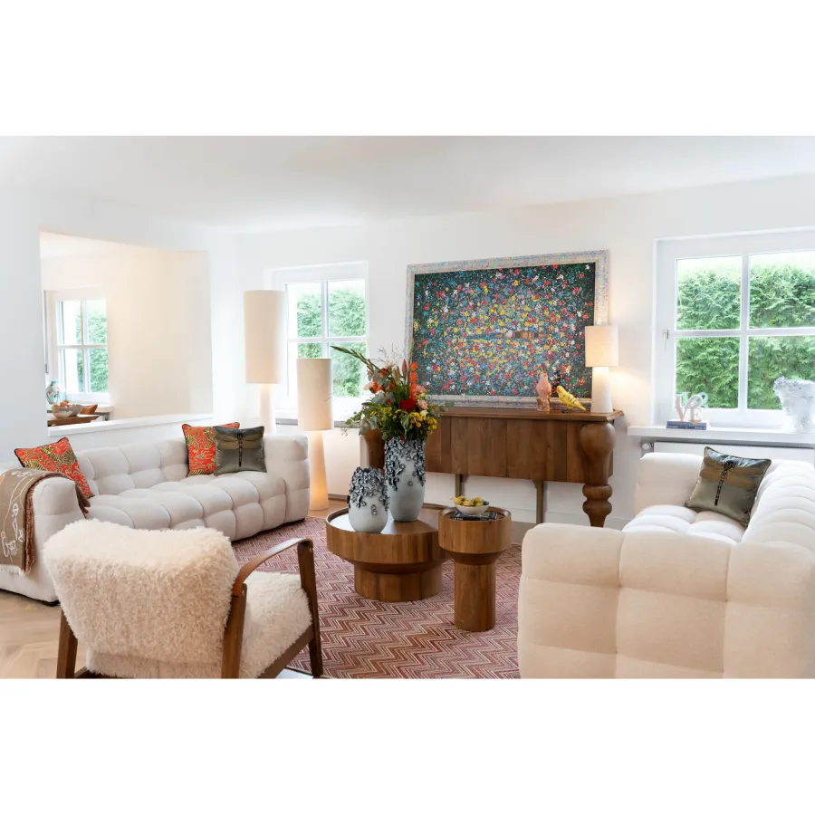 Stolik kawowy z wdziękiem - Tessa łączy w sobie ponadczasową naturalność z nowoczesnym niedopowiedzeniem. Obszerny, okrągły blat wykonany z litego drewna mango tworzy ciepłe akcenty i oferuje mnóstwo miejsca na stylowe aranżacje. Niezależnie od tego, czy ozdobiony jest wazonem pełnym suszonych kwiatów, eleganckimi książkami na stolik kawowy, czy tacą ze świecami – ta żywa atrakcja doskonale wpasowuje się w koncepcje skandynawskie, inspirowane boho lub minimalistyczne. Solidna konstrukcja czyni go trwałym towarzyszem przytulnych wieczorów i spotkań towarzyskich w salonie