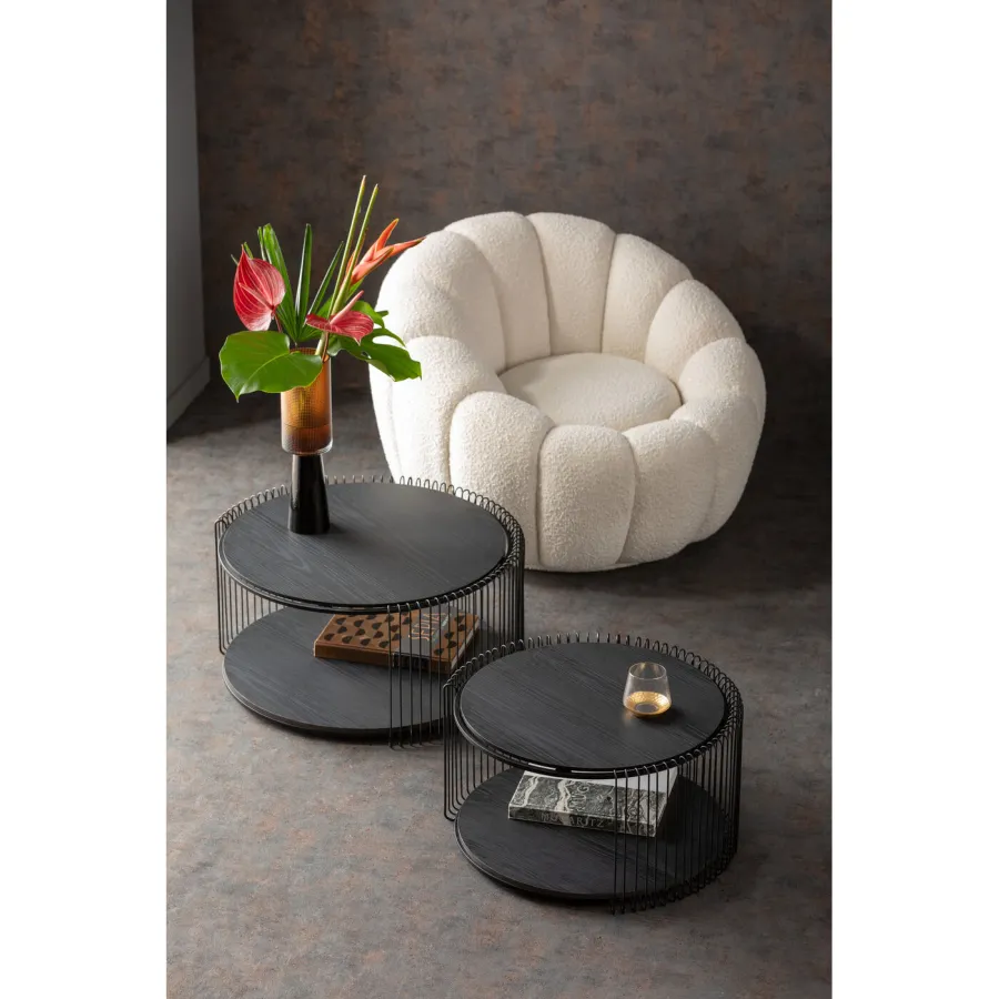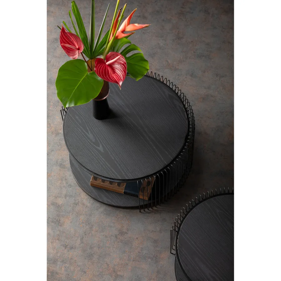 Zestaw dwóch okrągłych stolików bocznych w kolorze czarnym, duży: 33,5 x Ø69,5 cm, mały: 31,5 x Ø59,5 cm (wys./gł.) Elastyczne stoliki boczne do salonu, sypialni lub domowego biura Dużo miejsca do ułożenia rzeczy na czterech blatach wykonanych z lakierowanego na czarno kompozytu drewna jesionowego Połączenie metalu i drewna sprawia, że zestaw stołów jest szczególnie atrakcyjny Zestaw stołów dostarczany jest w całości zmontowany