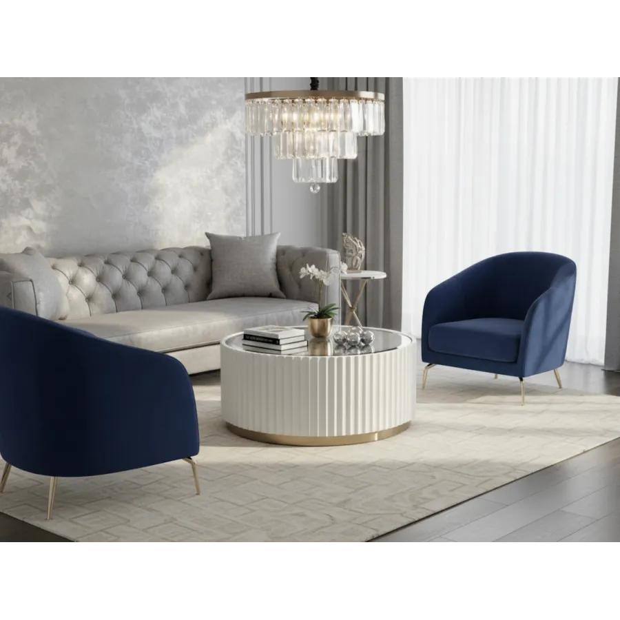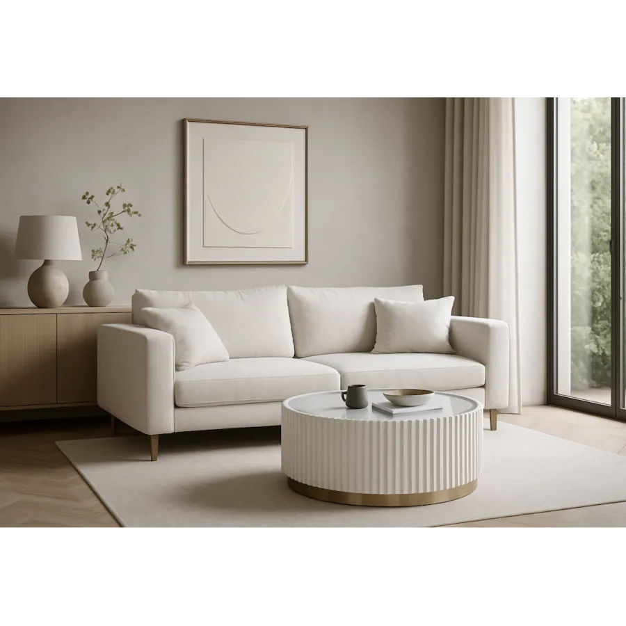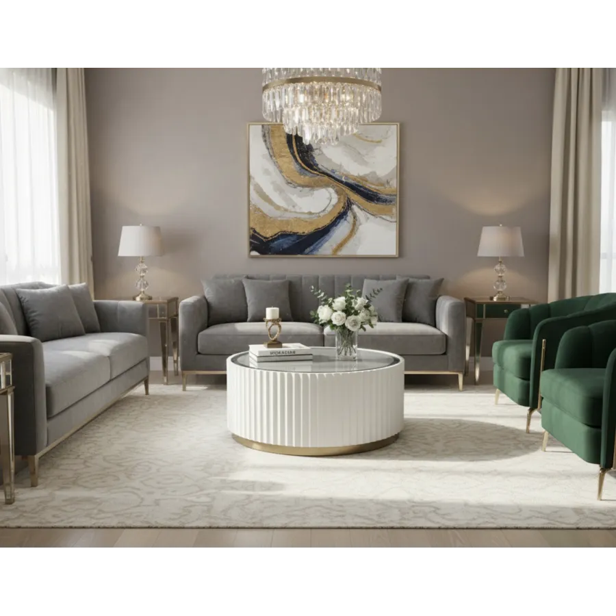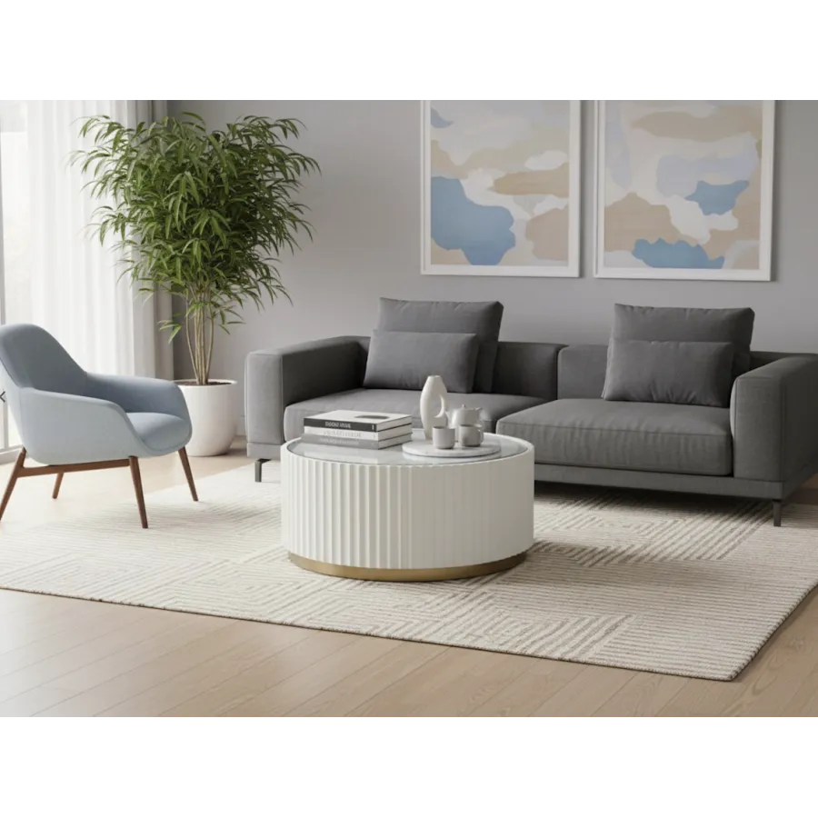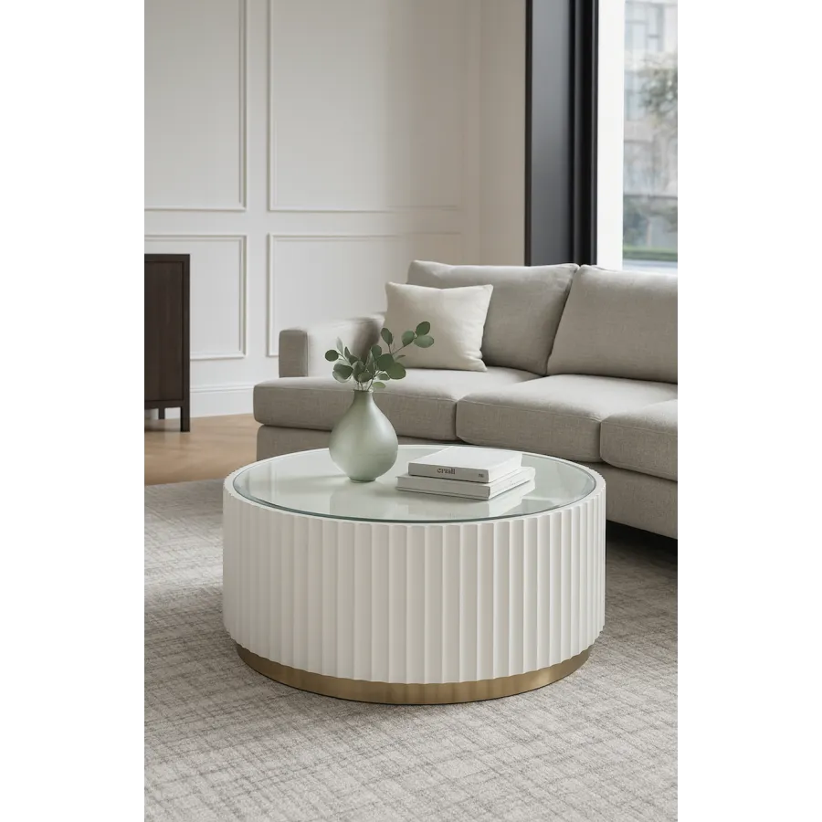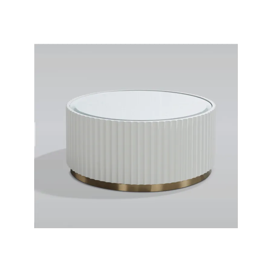 Elegancki, okrągły stolik kawowy w odcieniu ciepłej bieli, oparty na subtelnym, metalowym cokole w kolorze matowego złota. Korpus wykończony jest dekoracyjnymi, pionowymi frezami, które nadają mu rytmiczną i nowoczesną formę. Blat wykonano z lustra, dzięki czemu całość prezentuje się lekko i dodaje wnętrzu szlachetnego połysku.