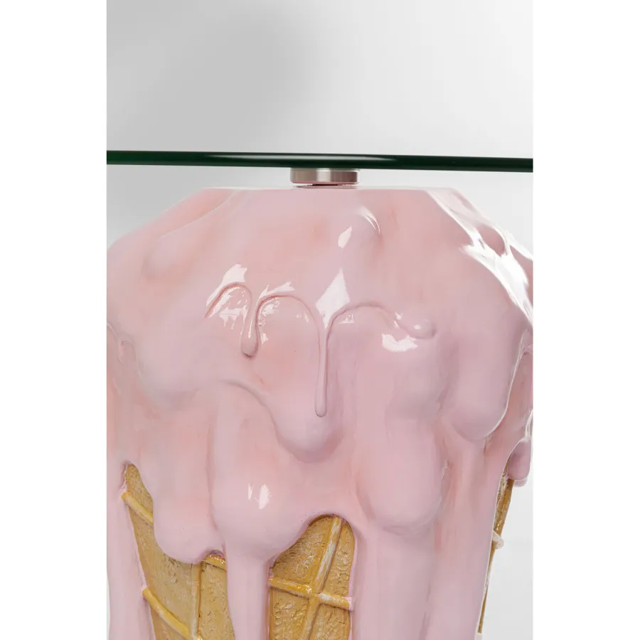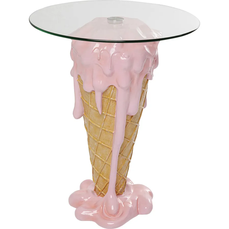 Niezwykły stolik boczny, który łączy zabawny design z funkcjonalnością. Rzeźbiarska podstawa w kształcie rożka z lodami truskawkowymi stanowi połączenie pop-artu i architektury wnętrz. Niezależnie od tego, czy będzie to atrakcja w salonie, kreatywny dodatek w kawiarni, czy też element przyciągający wzrok w salonie – ten designerski element z pewnością będzie tematem rozmów. Okrągły szklany blat wykonany z wytrzymałego szkła bezpiecznego zapewnia łatwą w pielęgnacji powierzchnię na napoje, przekąski lub dekoracje. Prawdziwy must-have dla każdego miłośnika niecodziennych projektów domów
