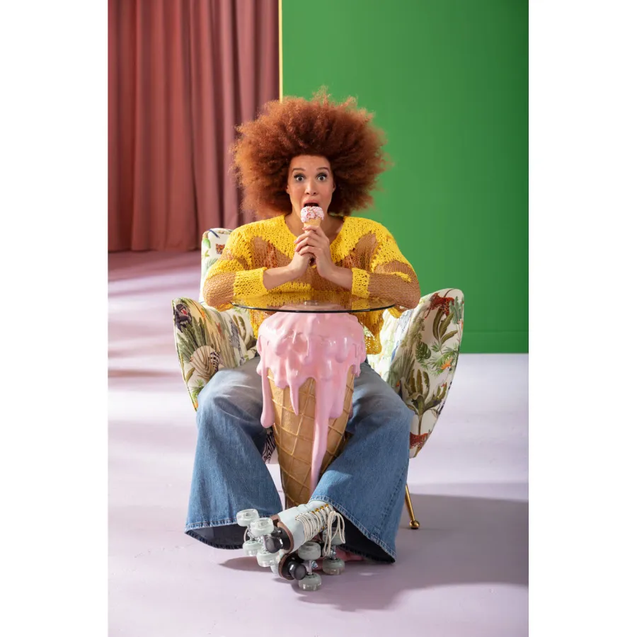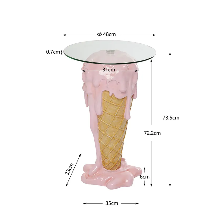 Niezwykły stolik boczny, który łączy zabawny design z funkcjonalnością. Rzeźbiarska podstawa w kształcie rożka z lodami truskawkowymi stanowi połączenie pop-artu i architektury wnętrz. Niezależnie od tego, czy będzie to atrakcja w salonie, kreatywny dodatek w kawiarni, czy też element przyciągający wzrok w salonie – ten designerski element z pewnością będzie tematem rozmów. Okrągły szklany blat wykonany z wytrzymałego szkła bezpiecznego zapewnia łatwą w pielęgnacji powierzchnię na napoje, przekąski lub dekoracje. Prawdziwy must-have dla każdego miłośnika niecodziennych projektów domów
