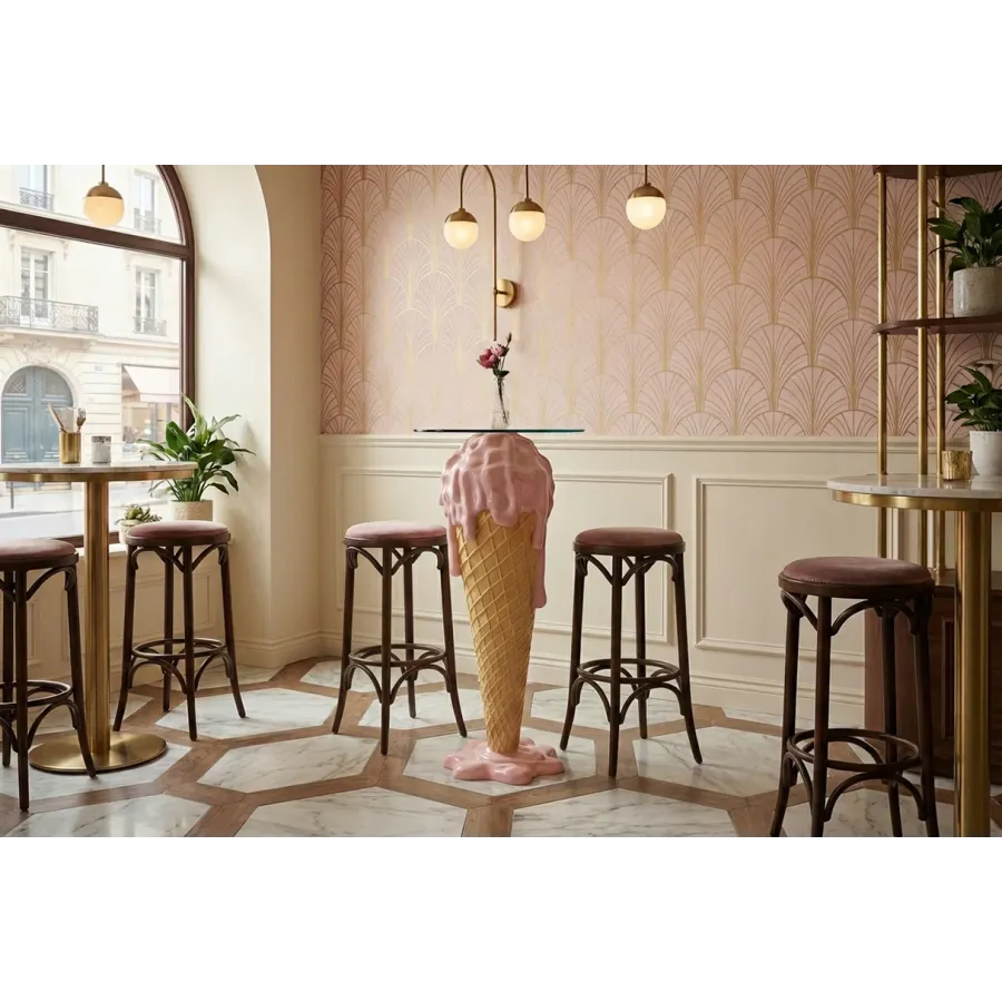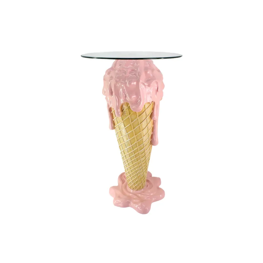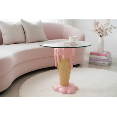 Wprowadź do swojego salonu radosny, a zarazem wyrafinowany akcent dzięki stolikowi kawowemu ICE CREAM, łączącemu delikatną paletę różu i beżu z rzeźbiarskim, inspirowanym lodami wzorem. Wykonany ręcznie z wysokiej jakości żywicy poliestrowej i zwieńczony eleganckim szkłem hartowanym, ten wyrazisty mebel łączy w sobie kapryśny urok z codzienną praktycznością i nowoczesnym stylem.
