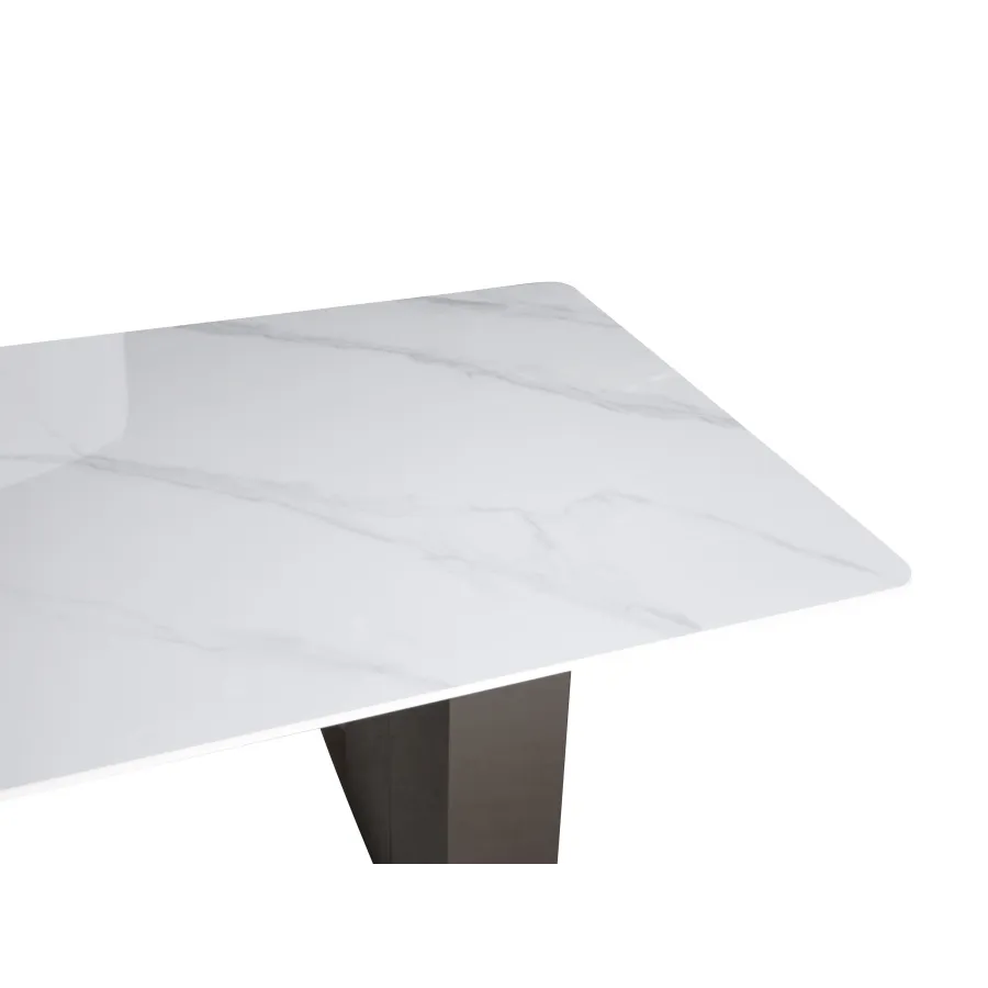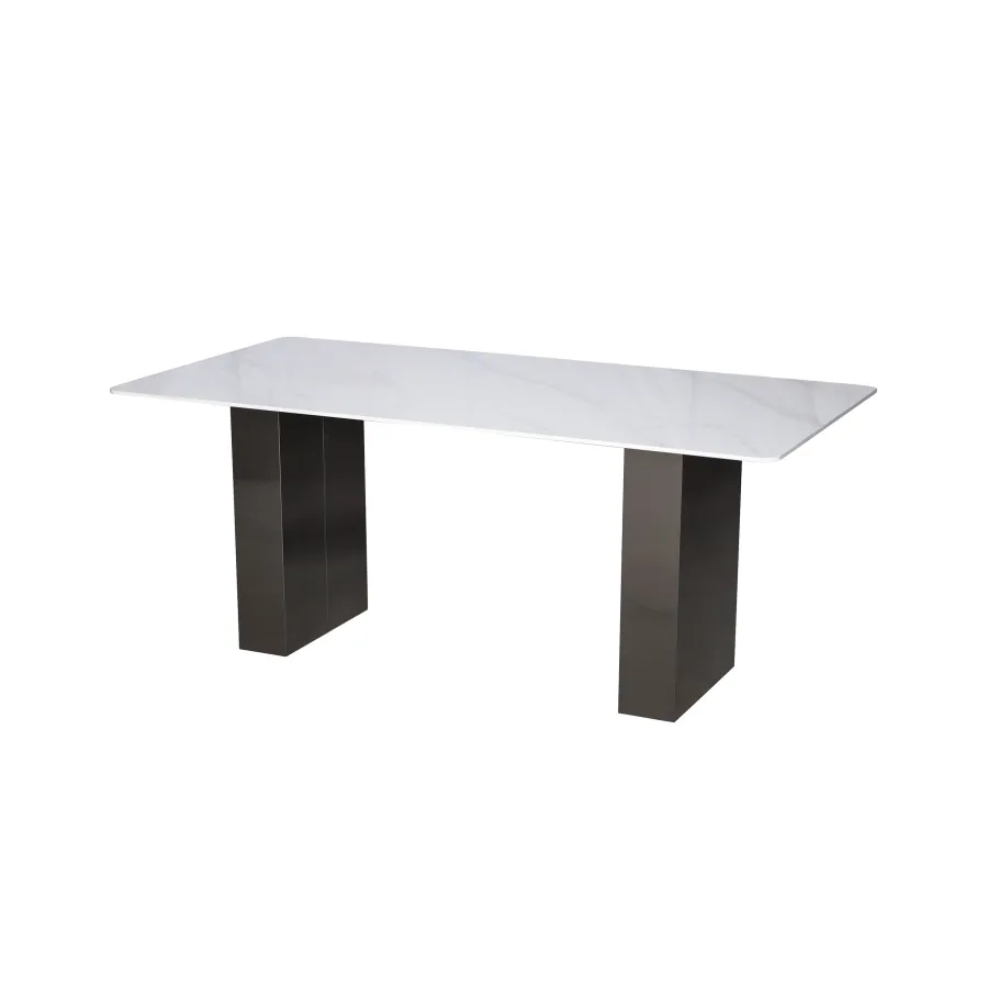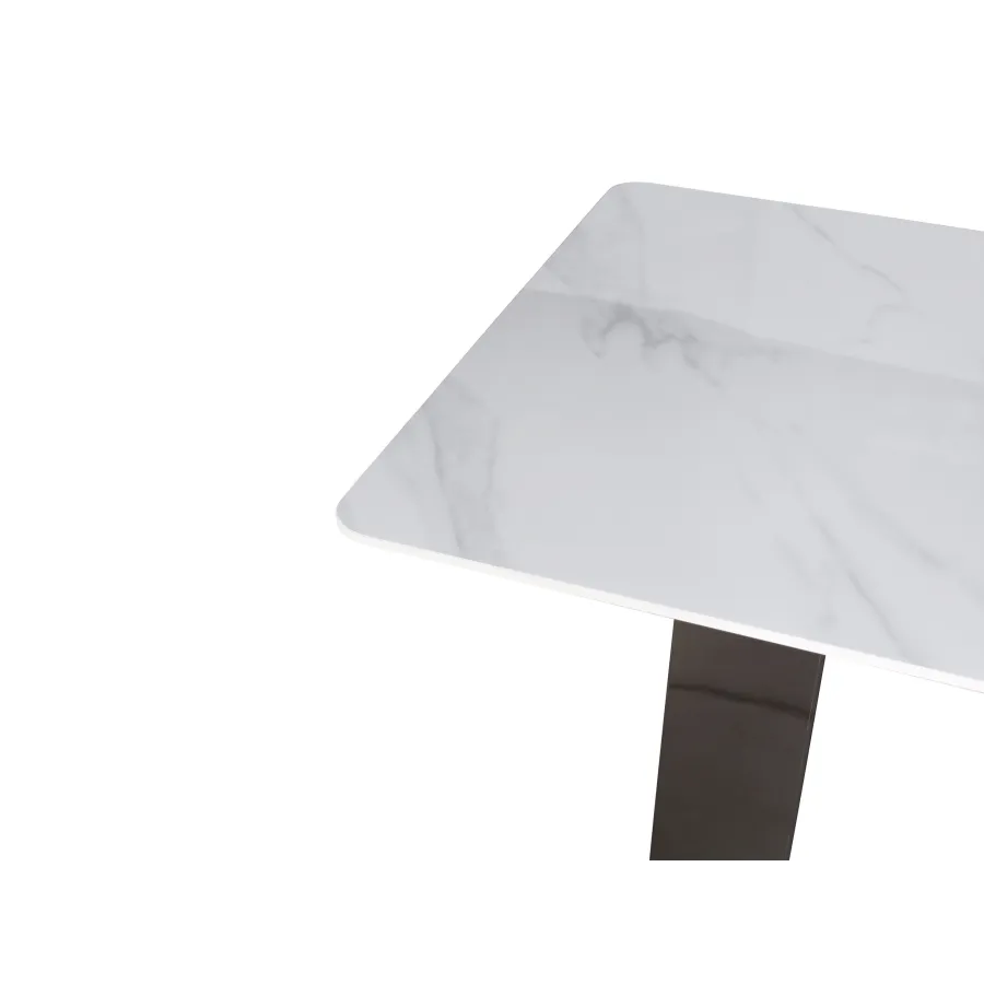 Minimalistyczny stół z chromowaną podstawą wykonaną ze stali nierdzewnej w kolorze grafitowym. Prostokątny blat w kolorze białym ma wzór imitujący marmur.