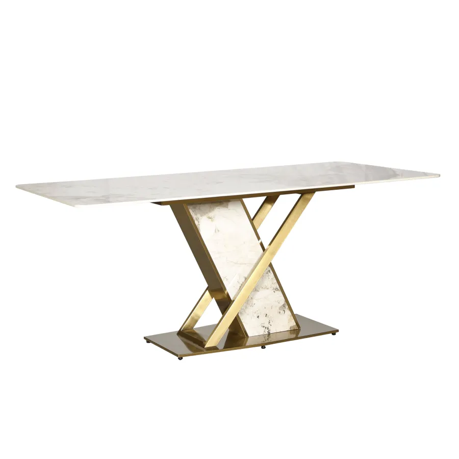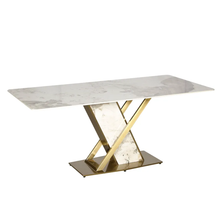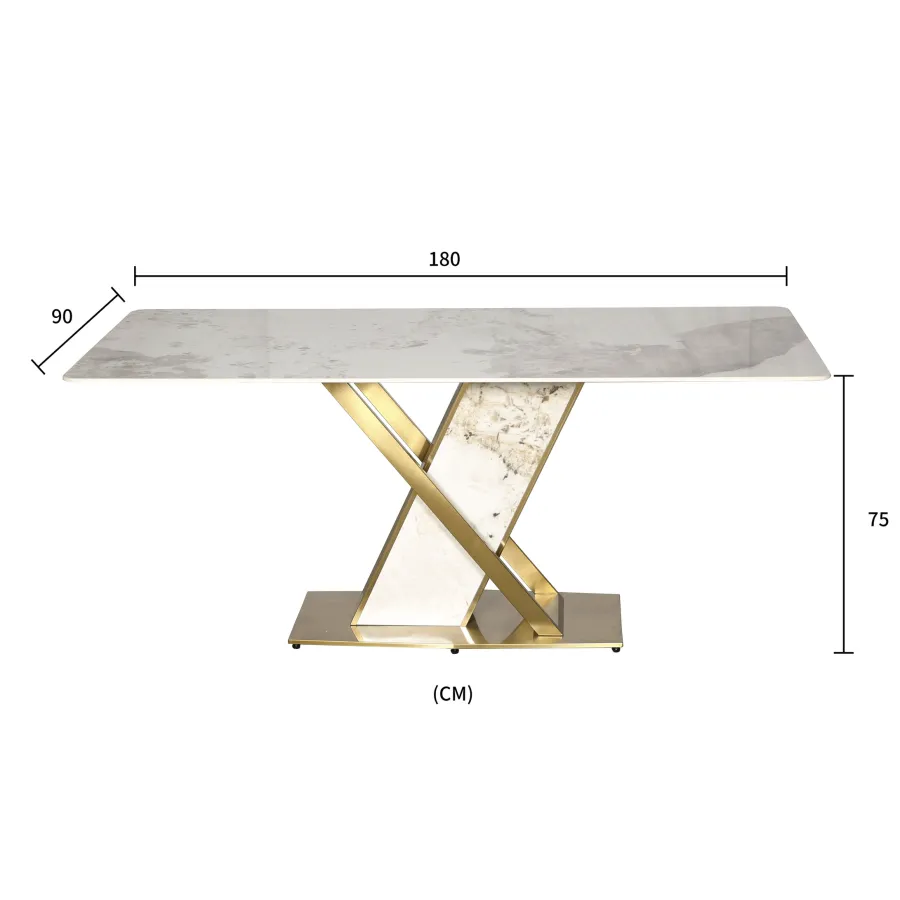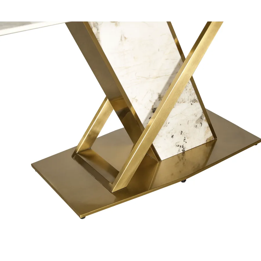 • Nowoczesny stół o podstawie w kształcie litery X wykonanej z imitacji marmuru w kolorze białym i stali nierdzewnej w kolorze złotym. Prostokątny blat w kolorze białym ma wzór imitujący marmur.