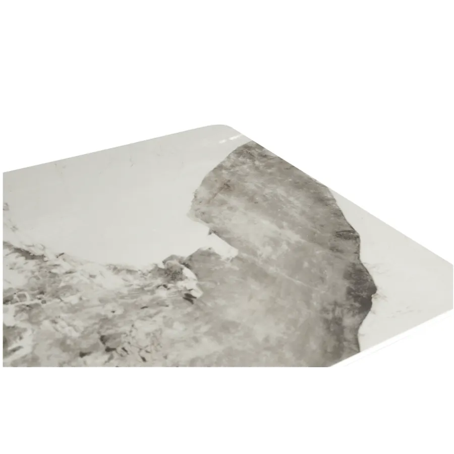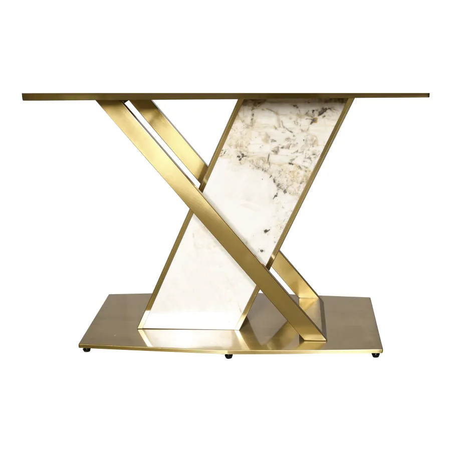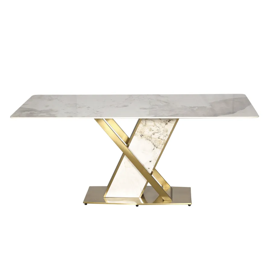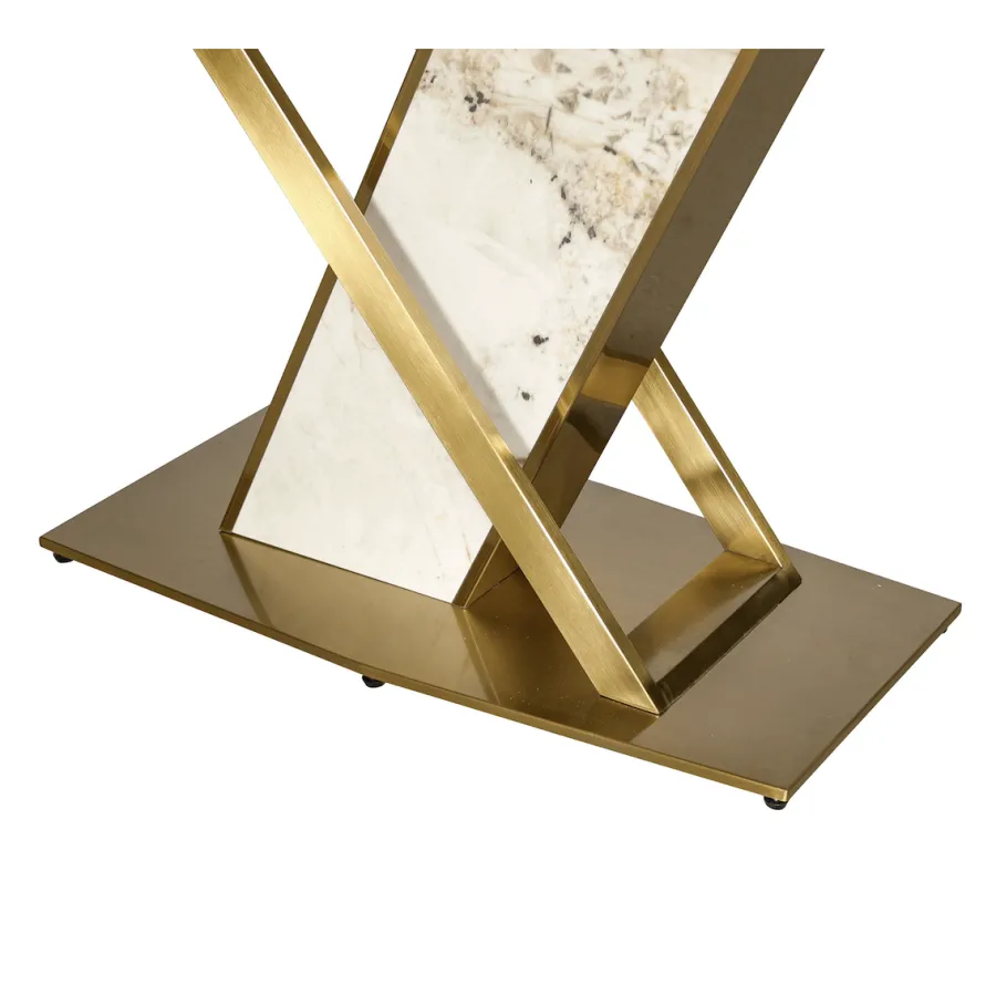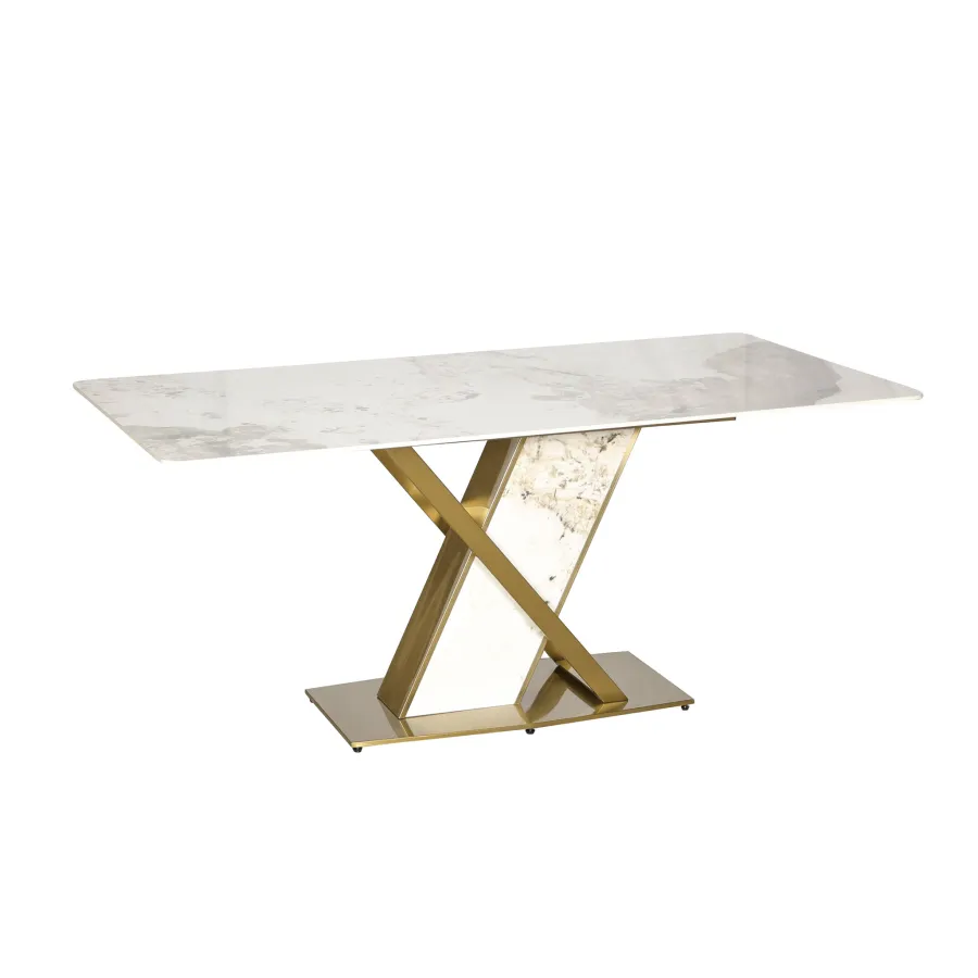 • Nowoczesny stół o podstawie w kształcie litery X wykonanej z imitacji marmuru w kolorze białym i stali nierdzewnej w kolorze złotym. Prostokątny blat w kolorze białym ma wzór imitujący marmur.