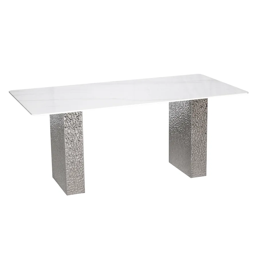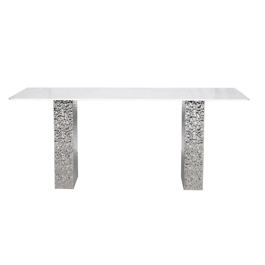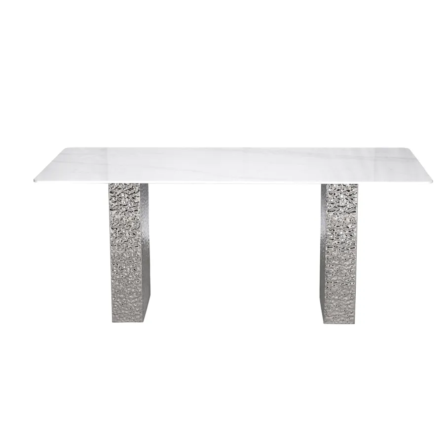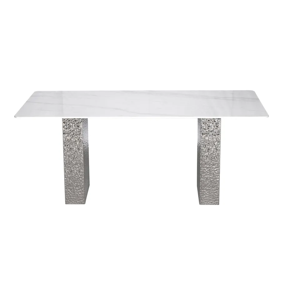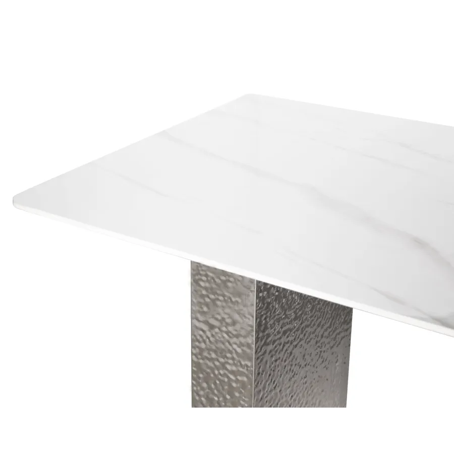 Stylowy stół o podstawie wykonanej ze stali nierdzewnej w kolorze srebrnym. Prostokątny blat w kolorze białym ma wzór imitujący marmur. Nogi mają powierzchnię młotkowaną.