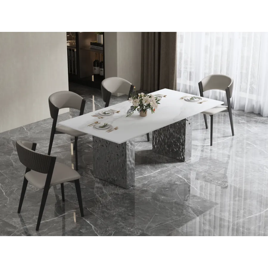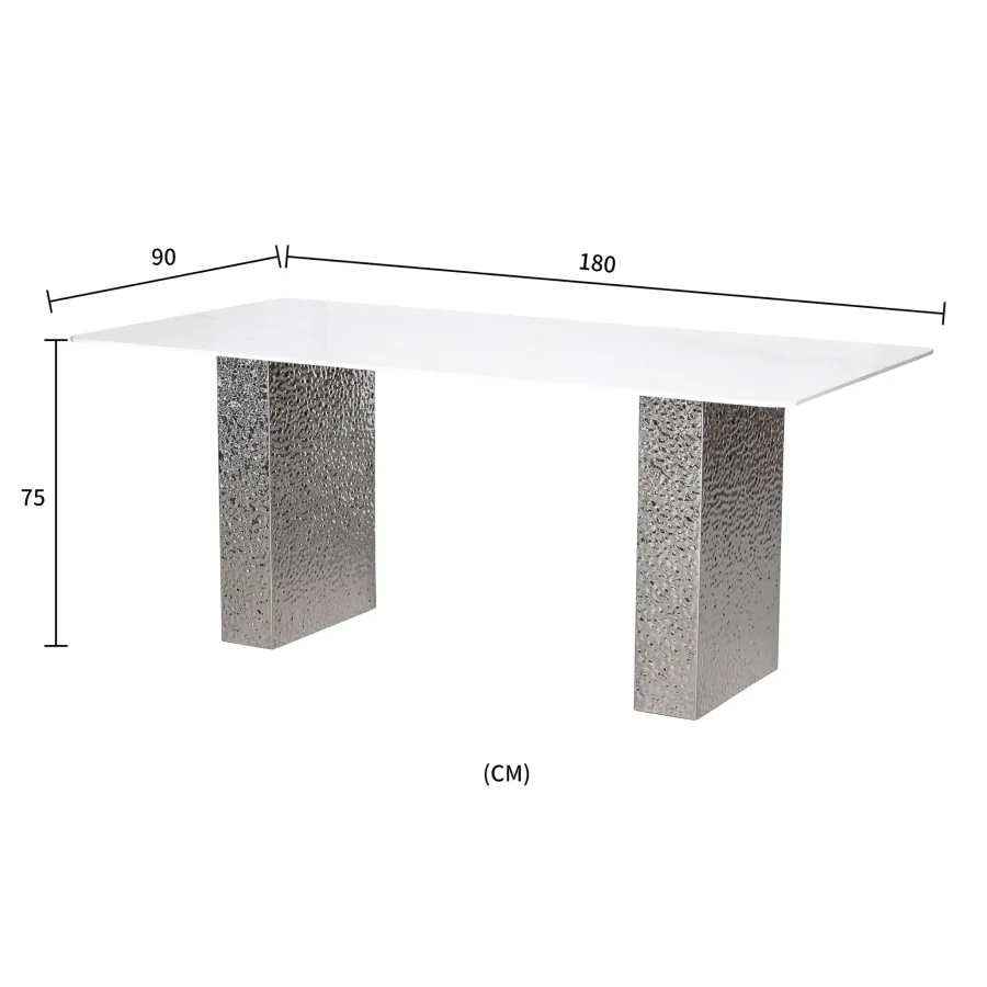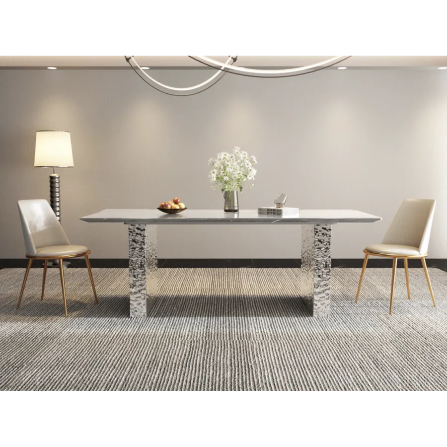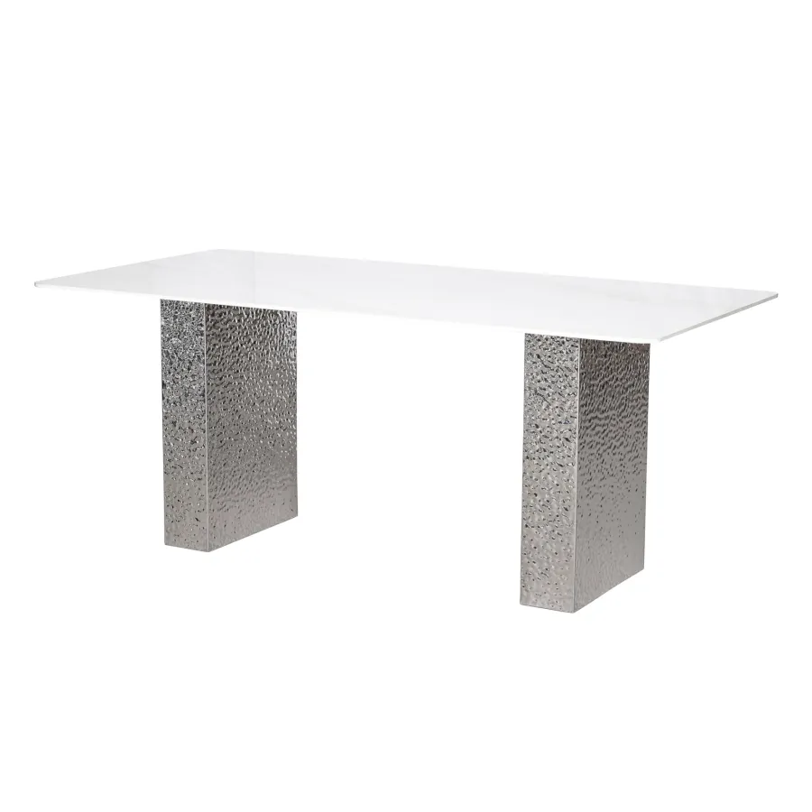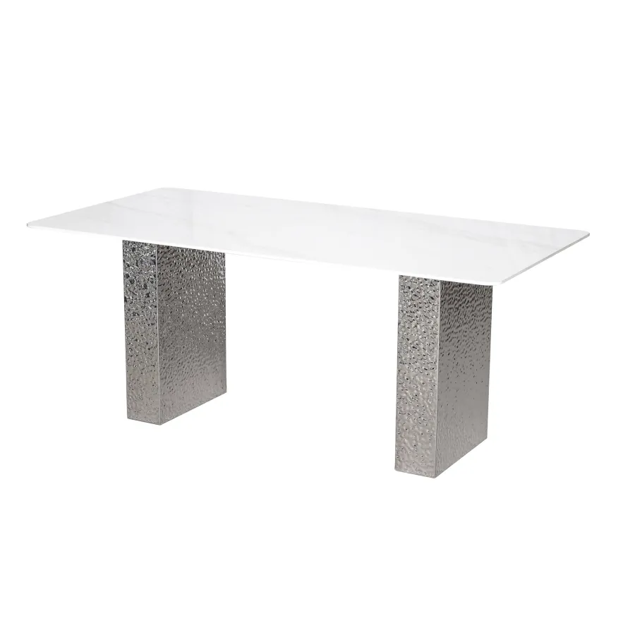 Stylowy stół o podstawie wykonanej ze stali nierdzewnej w kolorze srebrnym. Prostokątny blat w kolorze białym ma wzór imitujący marmur. Nogi mają powierzchnię młotkowaną.