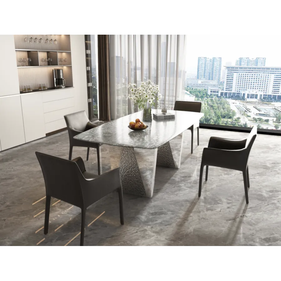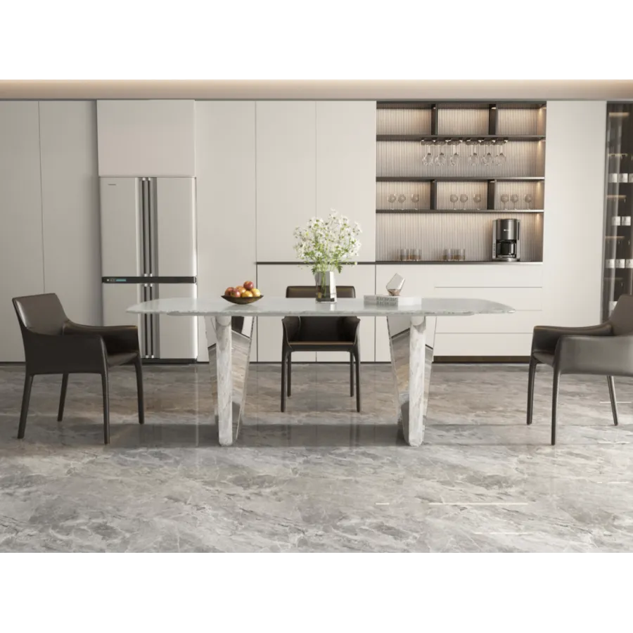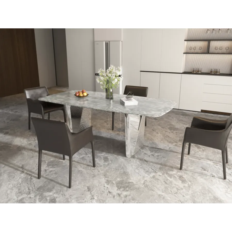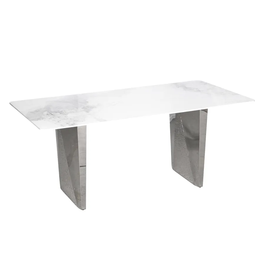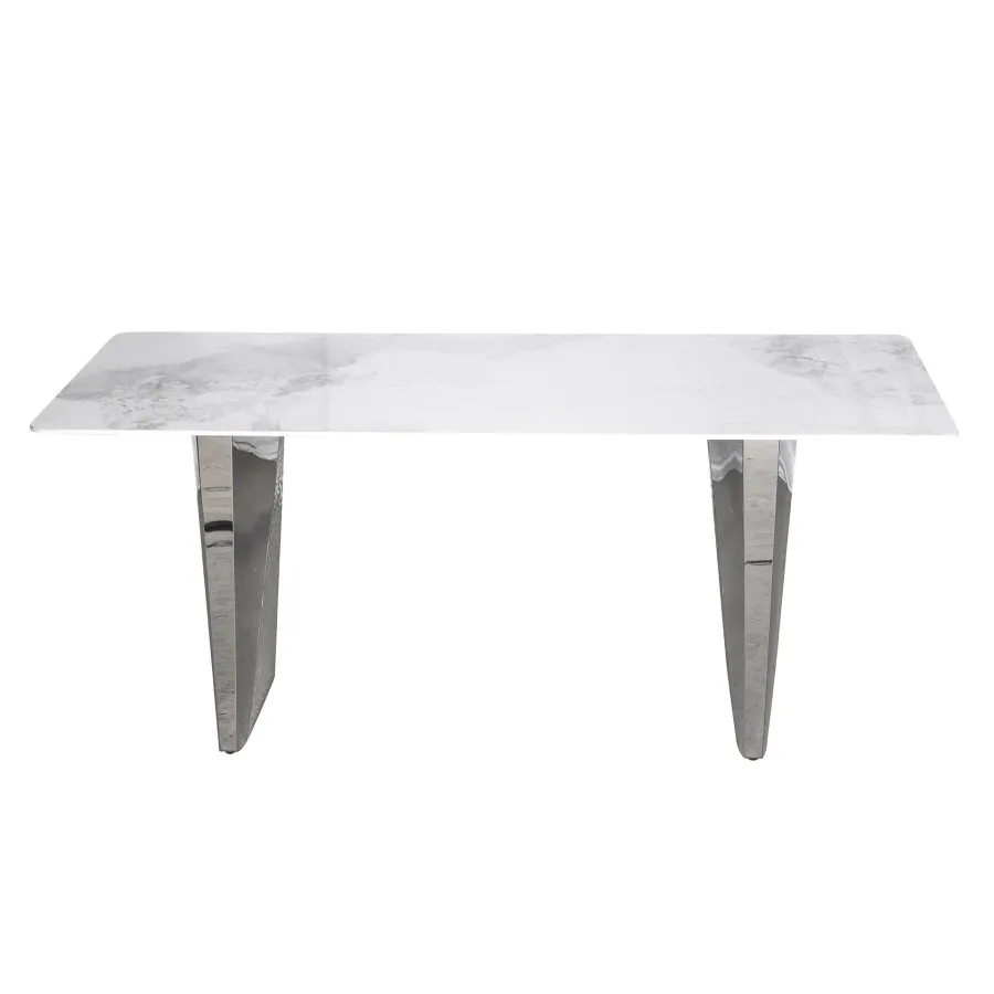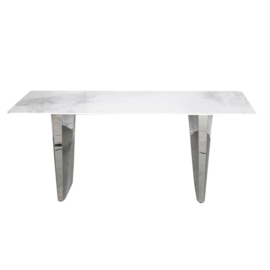 Stylowy stół o podstawie wykonanej ze stali nierdzewnej w kolorze srebrnym. Prostokątny blat w kolorze białym ma wzór imitujący marmur. Geometryczne nogi mają powierzchnię gładką i młotkowaną.