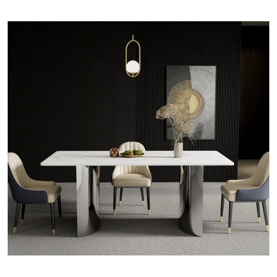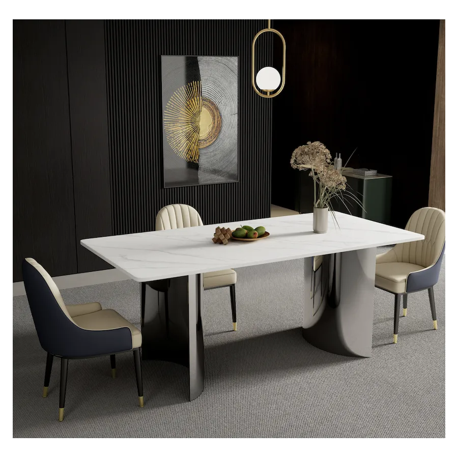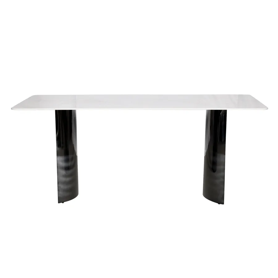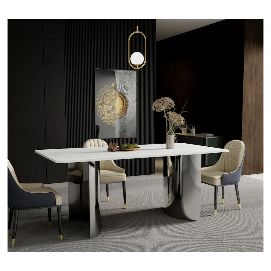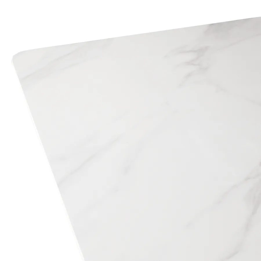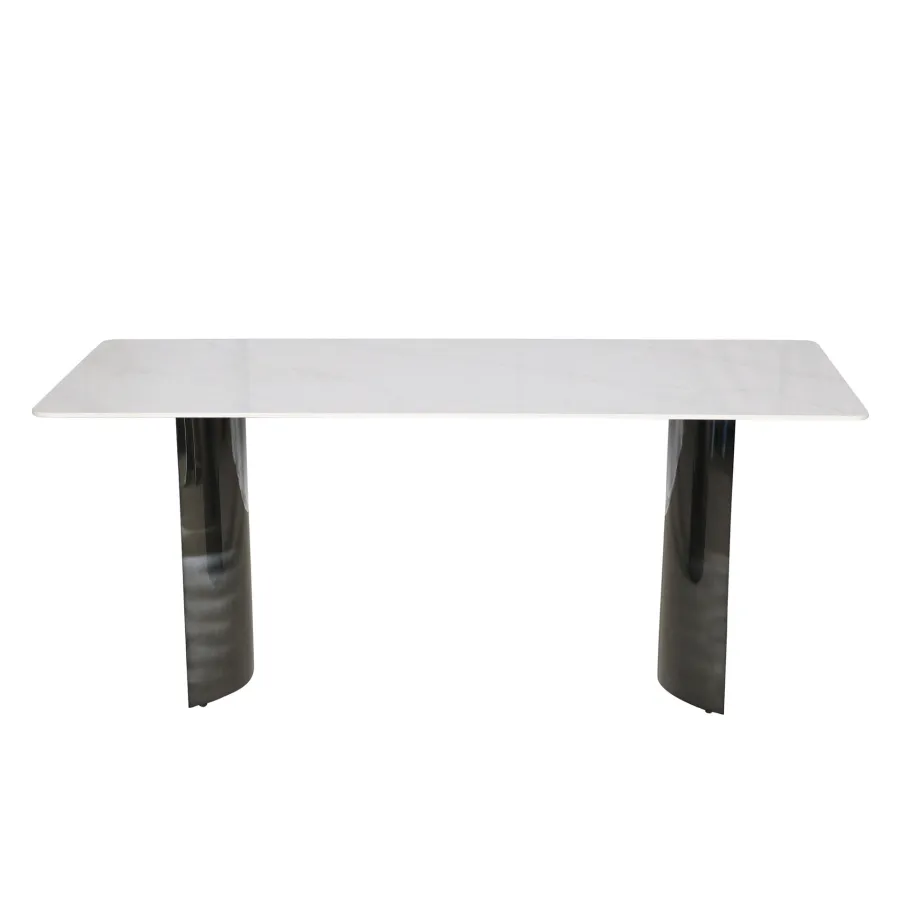 Minimalistyczny stół z chromowaną podstawą wykonaną ze stali nierdzewnej w kolorze grafitowym. Prostokątny blat w kolorze białym ma wzór imitujący marmur, podstawa nogi ma kształt półkola.