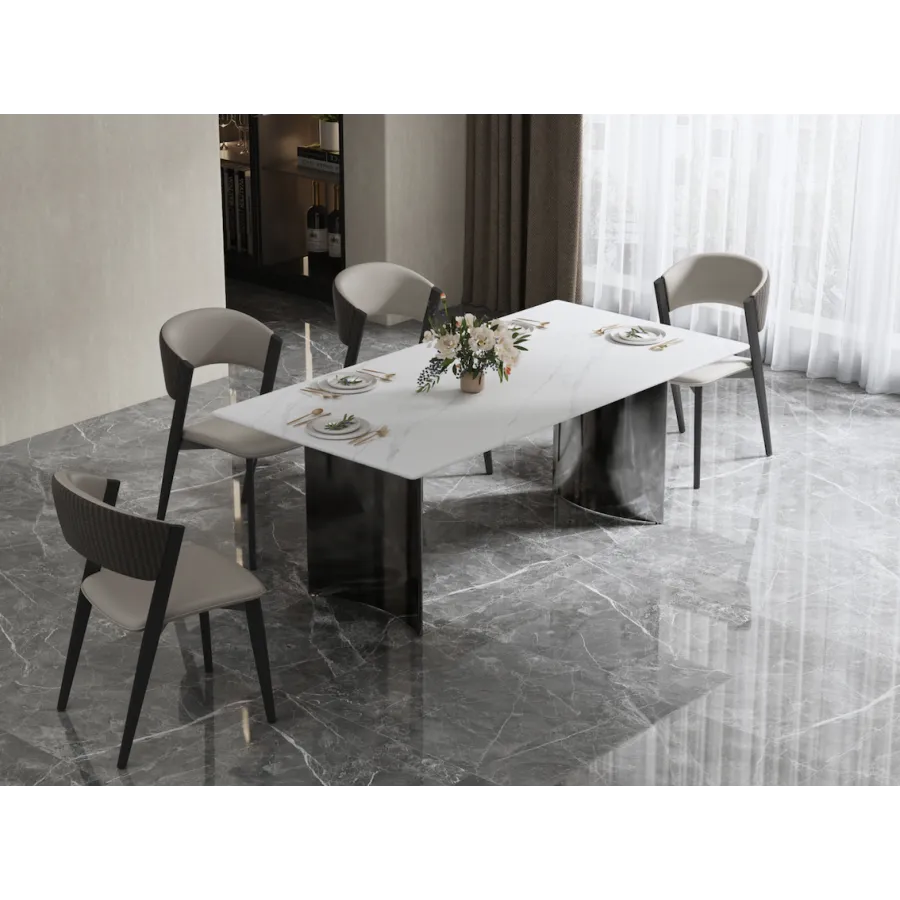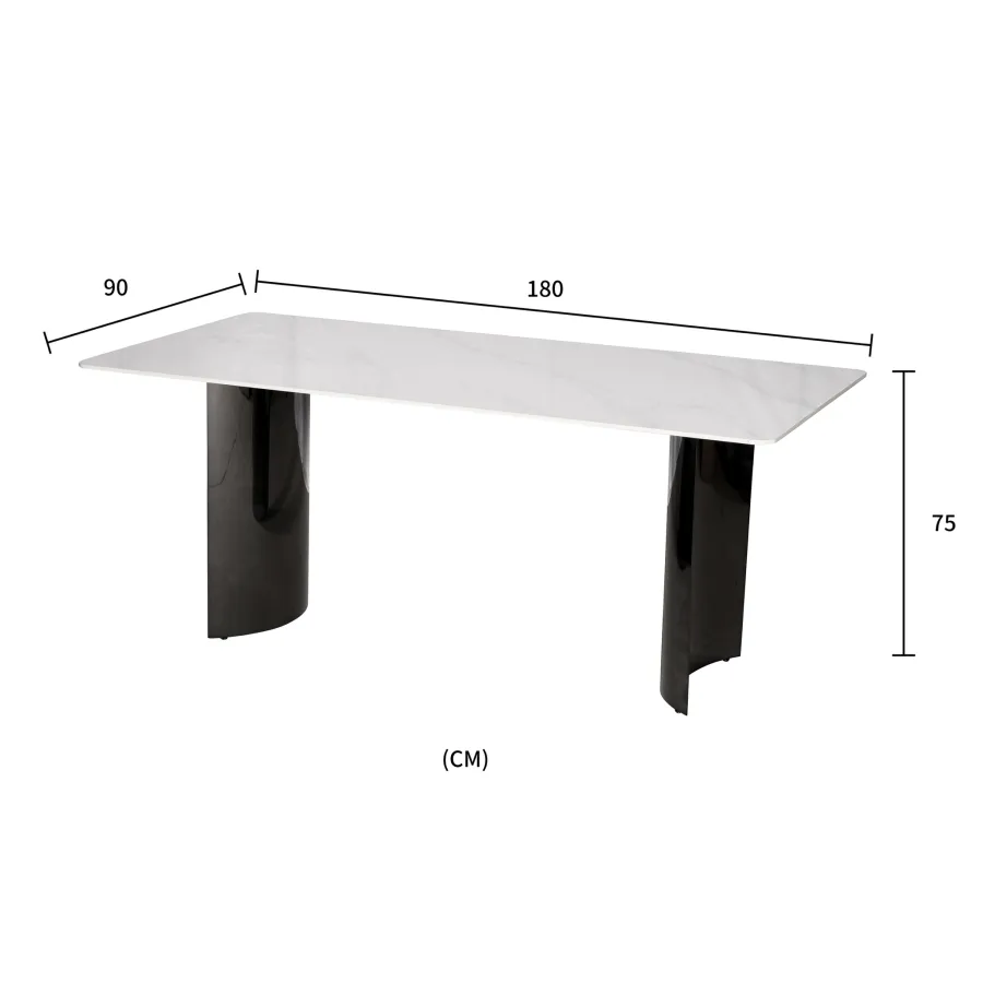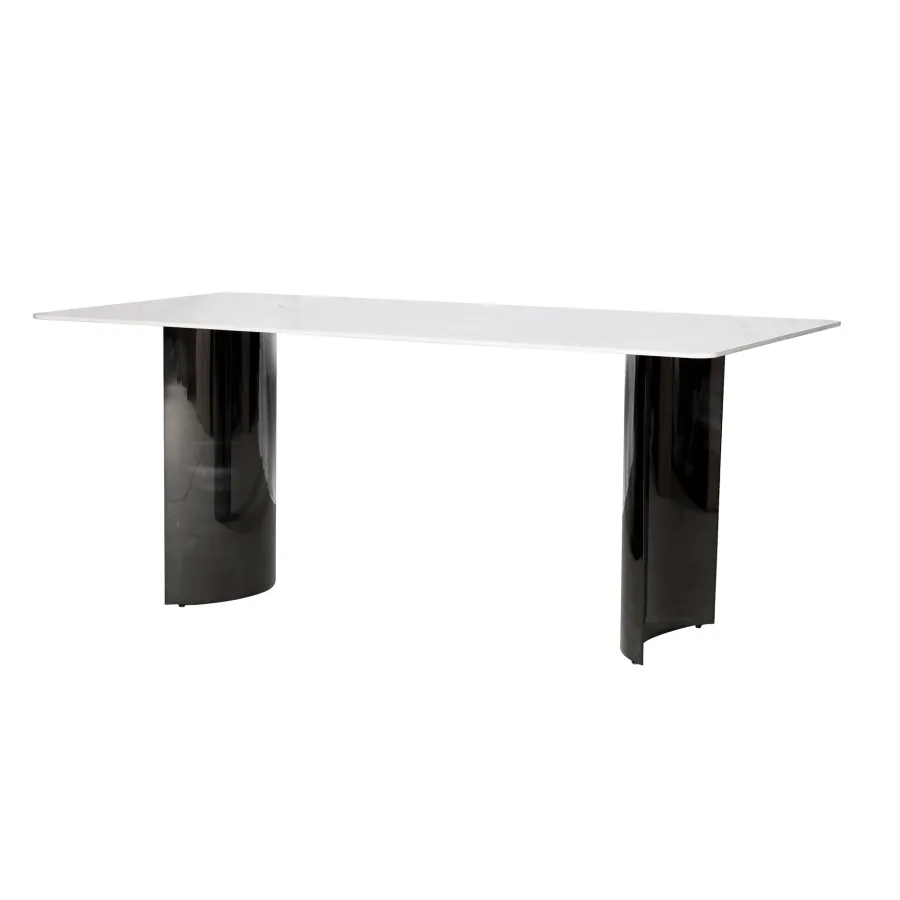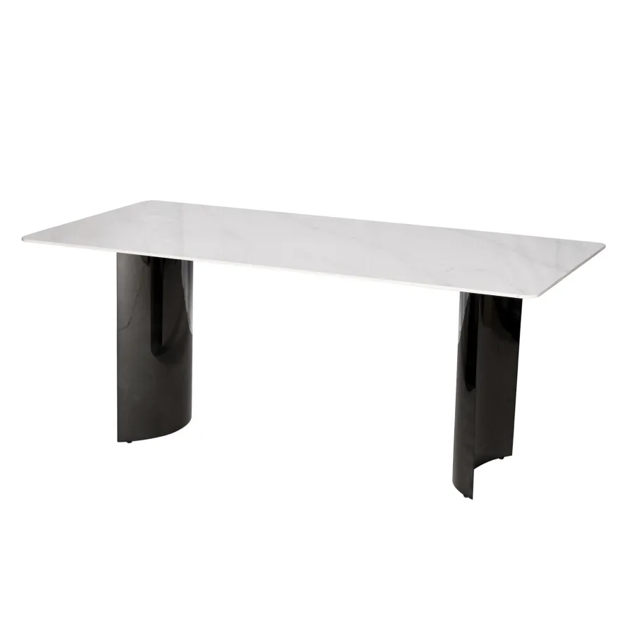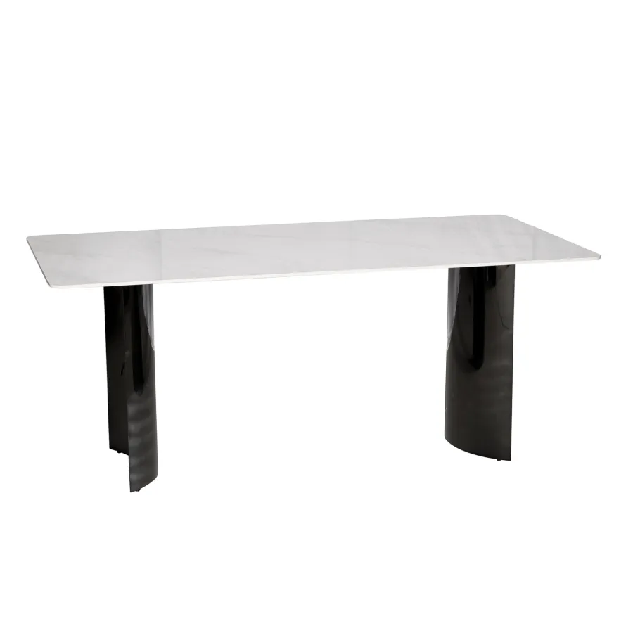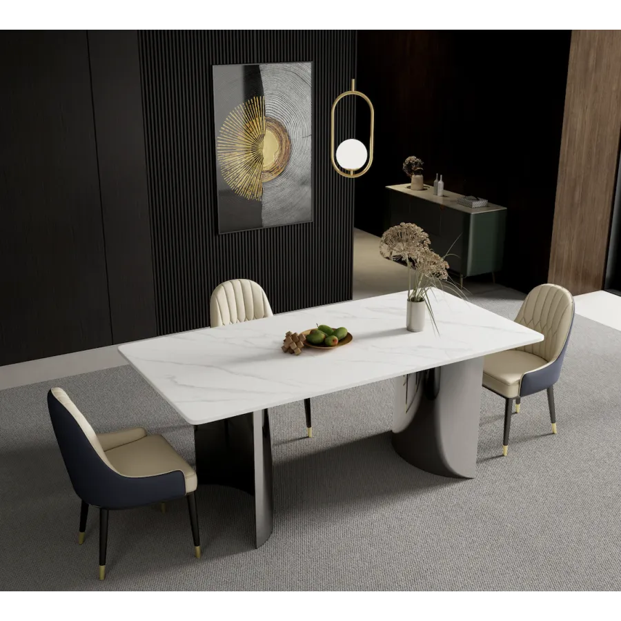 Minimalistyczny stół z chromowaną podstawą wykonaną ze stali nierdzewnej w kolorze grafitowym. Prostokątny blat w kolorze białym ma wzór imitujący marmur, podstawa nogi ma kształt półkola.