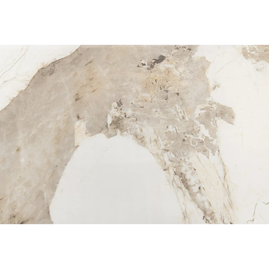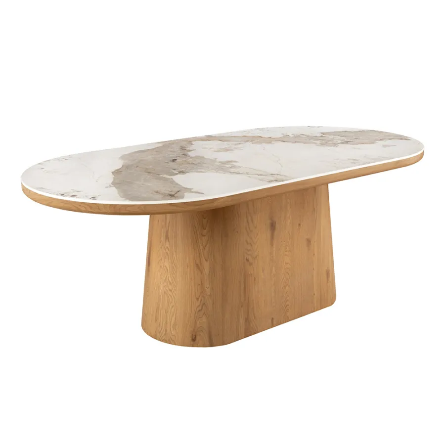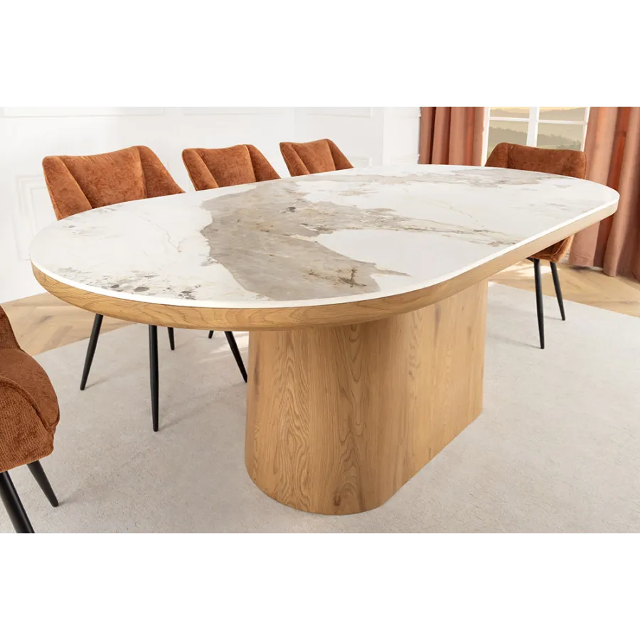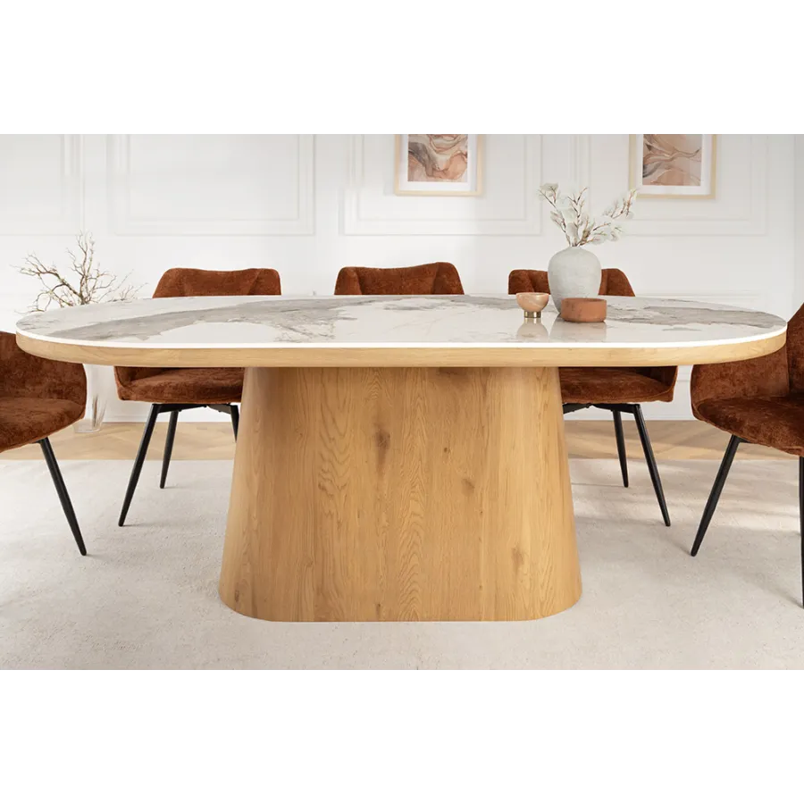 Ten owalny stół jadalny zachwyca eleganckim wzornictwem i wysokiej jakości materiałami. Biały ceramiczny blat o wyrafinowanym marmurowym wyglądzie dodaje odrobinę luksusu do Twojej jadalni i zachwyca solidną, odporną na zarysowania i łatwą w pielęgnacji powierzchnią. Solidna podstawa w formie postumentu wykonana z forniru orzechowego nie tylko zapewnia stabilność, ale także zachwyca ciepłym usłojeniem drewna i naturalnym kolorem.