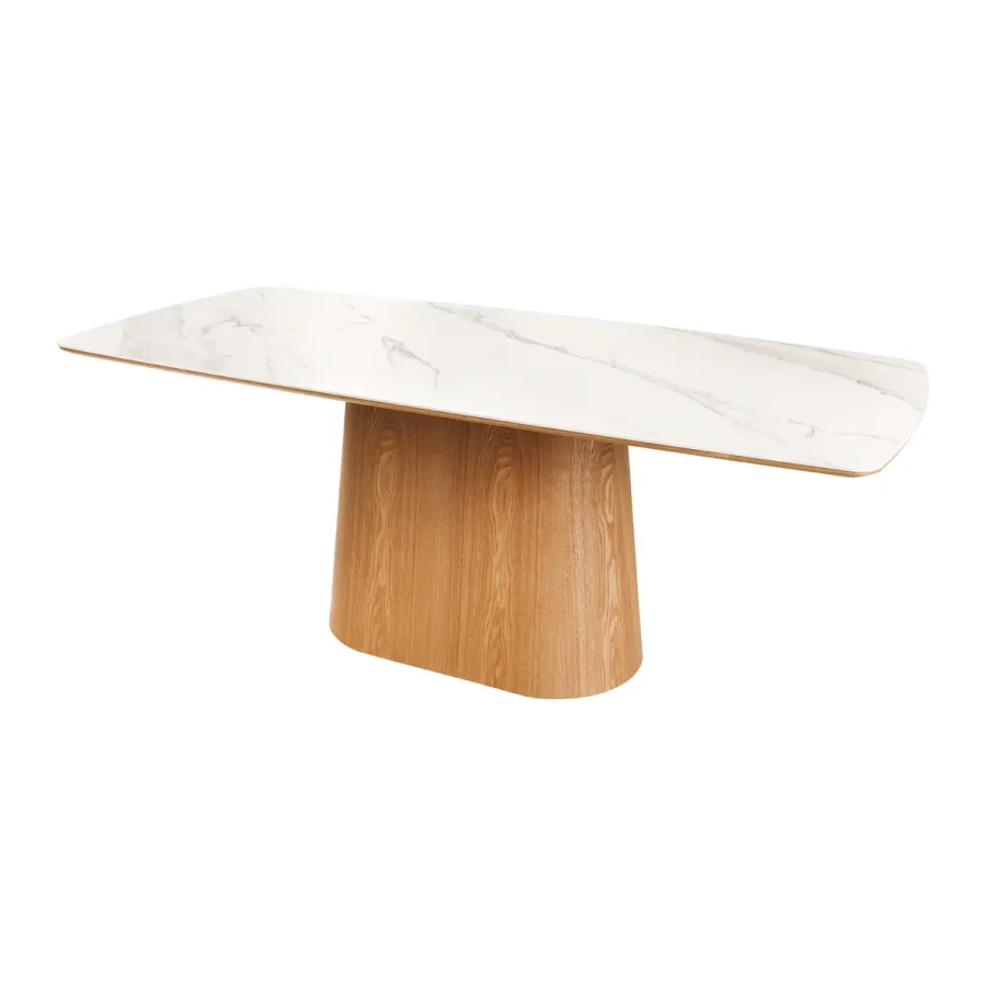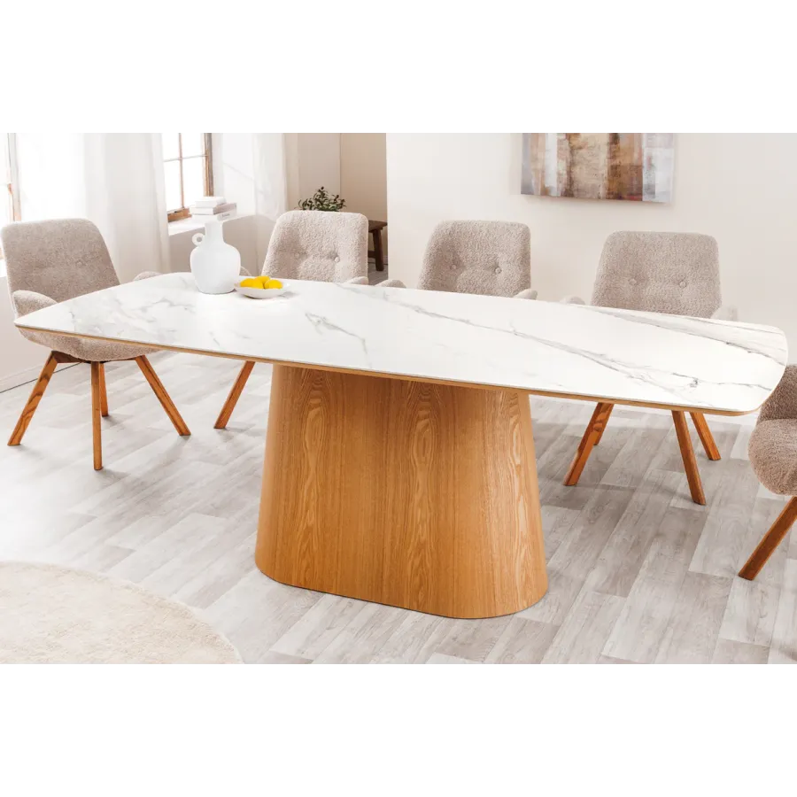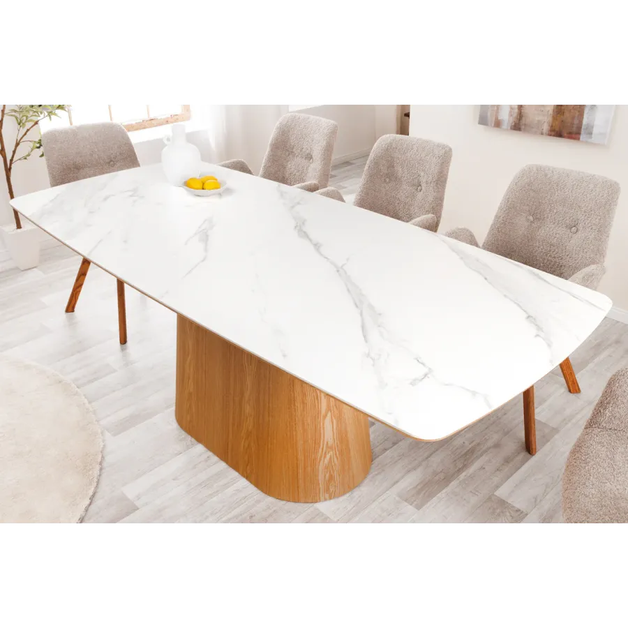Ten owalny stół jadalny zachwyca eleganckim wzornictwem i wysokiej jakości materiałami. Biały ceramiczny blat o wyrafinowanym marmurowym wyglądzie dodaje odrobinę luksusu do Twojej jadalni i zachwyca solidną, odporną na zarysowania i łatwą w pielęgnacji powierzchnią. Solidna podstawa w formie postumentu wykonana z forniru orzechowego nie tylko zapewnia stabilność, ale także zachwyca ciepłym usłojeniem drewna i naturalnym kolorem.