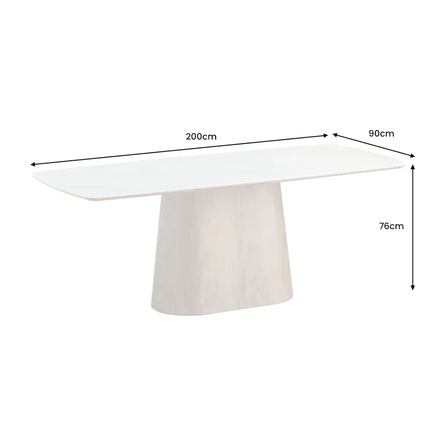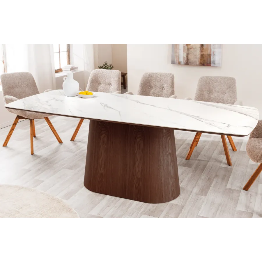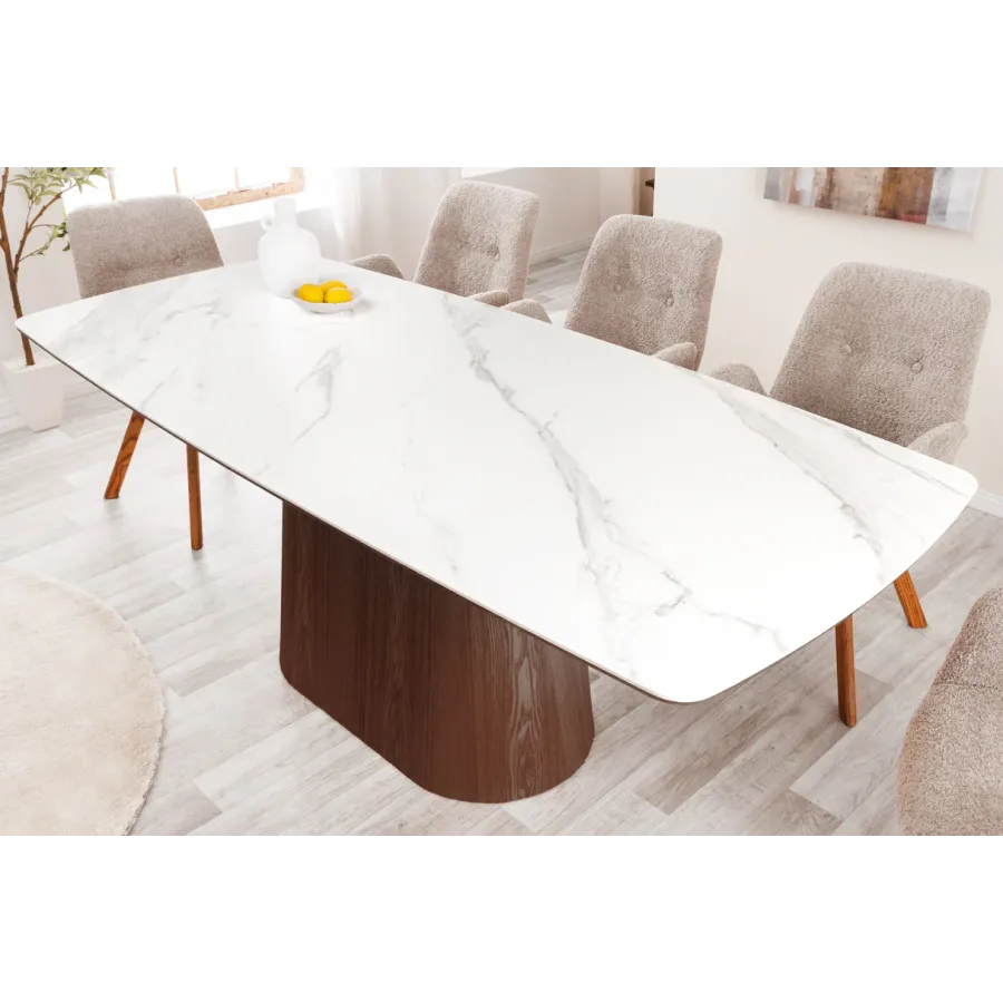 Ten owalny stół jadalny zachwyca eleganckim wzornictwem i wysokiej jakości materiałami. Biały ceramiczny blat o wyrafinowanym marmurowym wyglądzie dodaje odrobinę luksusu do Twojej jadalni i zachwyca solidną, odporną na zarysowania i łatwą w pielęgnacji powierzchnią. Solidna podstawa w formie postumentu wykonana z forniru orzechowego nie tylko zapewnia stabilność, ale także zachwyca ciepłym usłojeniem drewna i naturalnym kolorem.