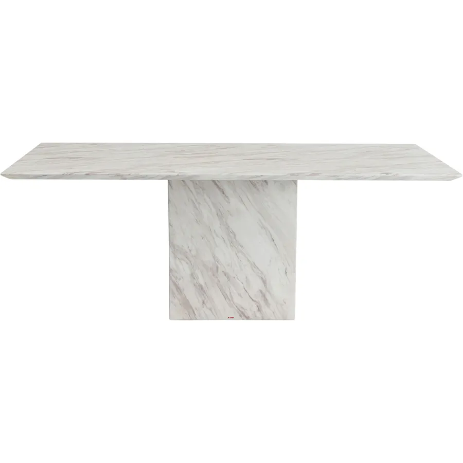 Dzięki prostopadłościennej podstawie stołu i marmurkowej powierzchni, ten stół do jadalni magnetycznie przyciąga uwagę wszystkich. Designerski mebel, który pasuje do wszystkich stylów życia i nadaje pomieszczeniom klasę. Wygląd jest równie elegancki, jak pielęgnacja prosta. Minimalistyczny design dobrze komponuje się z różnymi krzesłami stołowymi. Aksamitne krzesła dodają blasku, a proste krzesła o czystej wyściółce podkreślają nowoczesny styl mieszkania