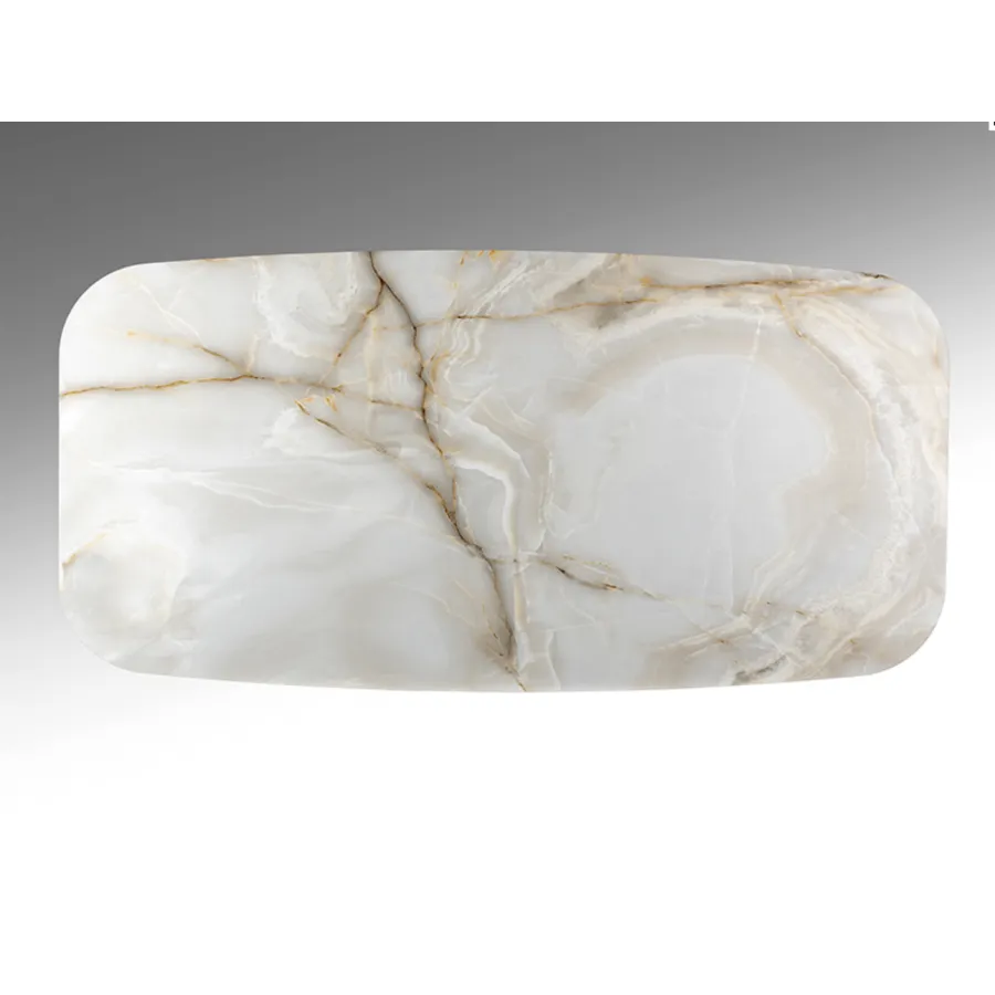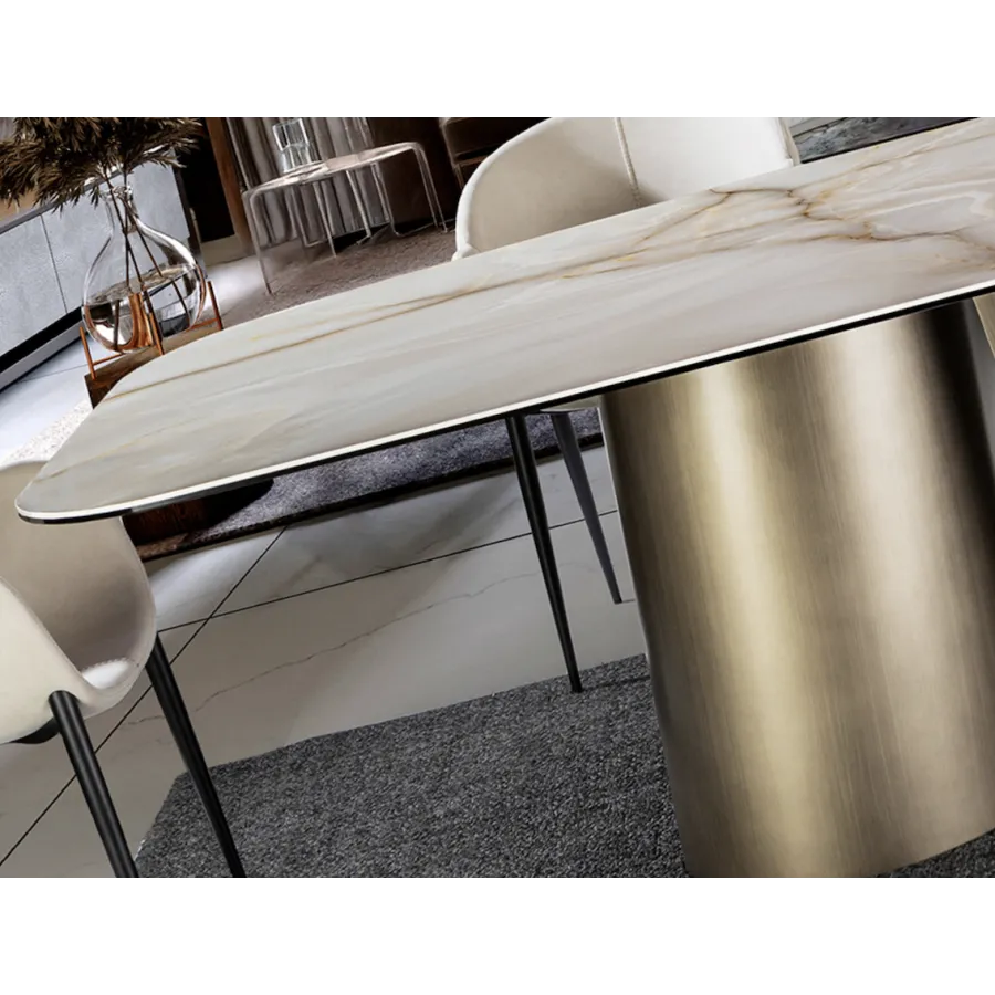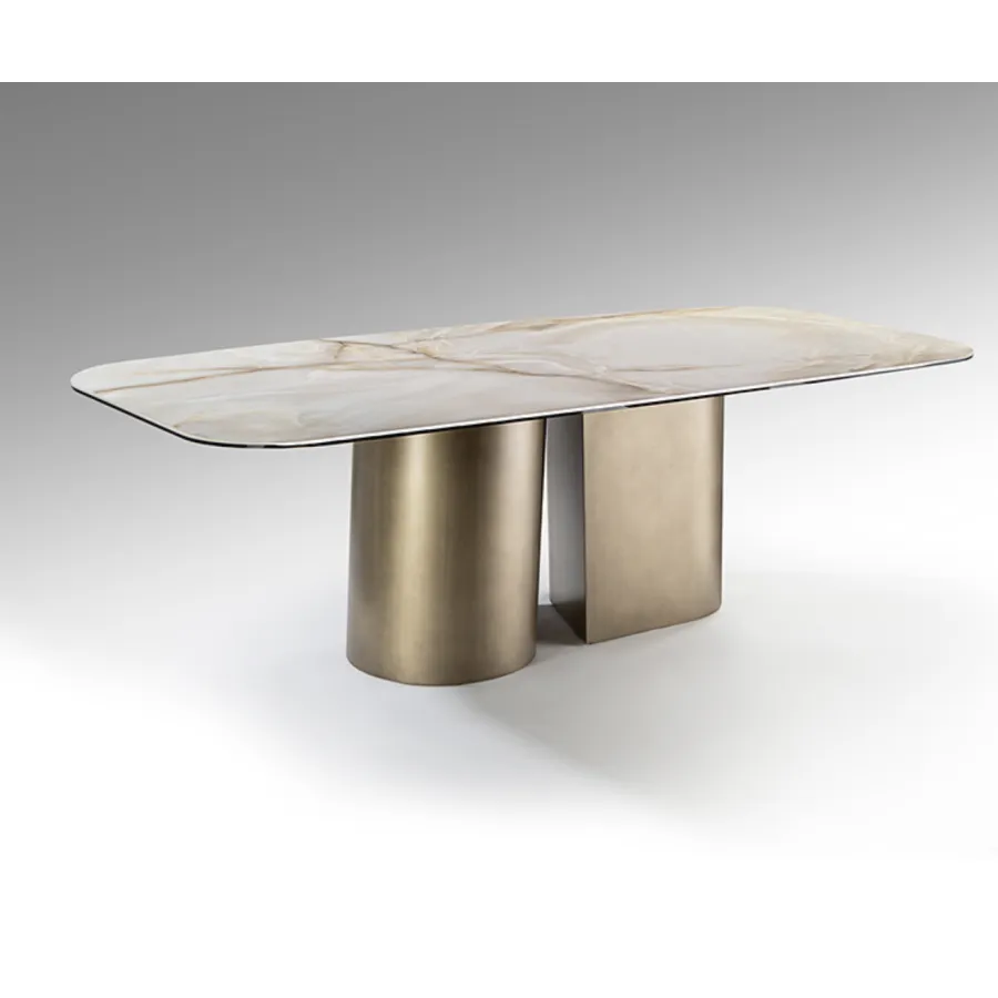 Stół jadalny, wykonany z metalu w wykończeniu szczotkowanego mosiądzu. Laminowany blat z porcelany i szkła z dekoracją z żyłkowanego marmuru.
