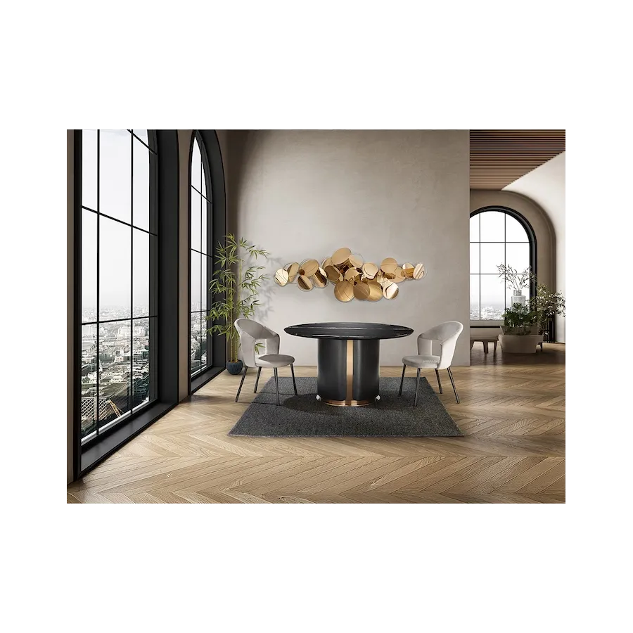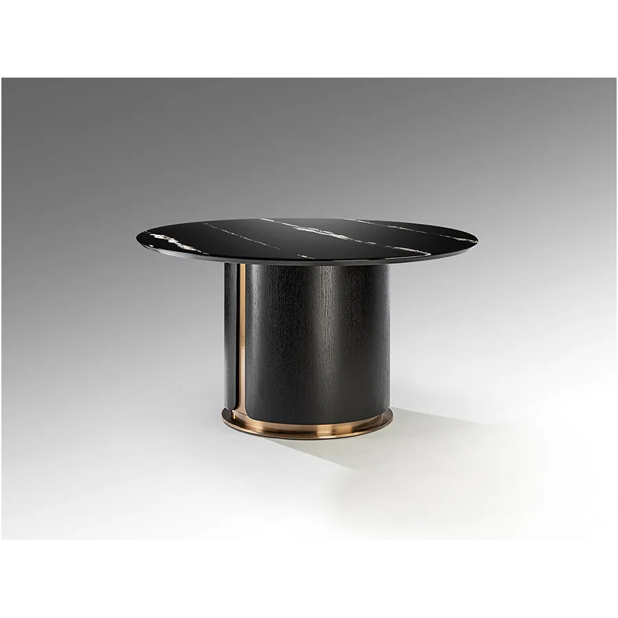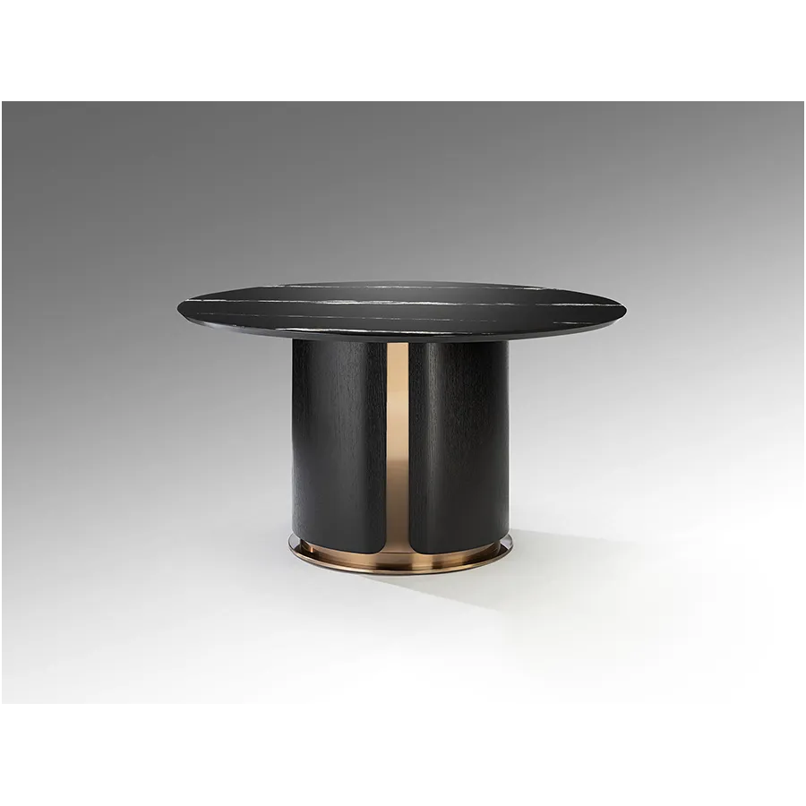 Okrągły stół jadalny wykonany z płyty MDF fornirowanej ciemnym dębem, stali nierdzewnej w kolorze różowego złota i blatu z czarnego marmuru o żyłkowanym wykończeniu