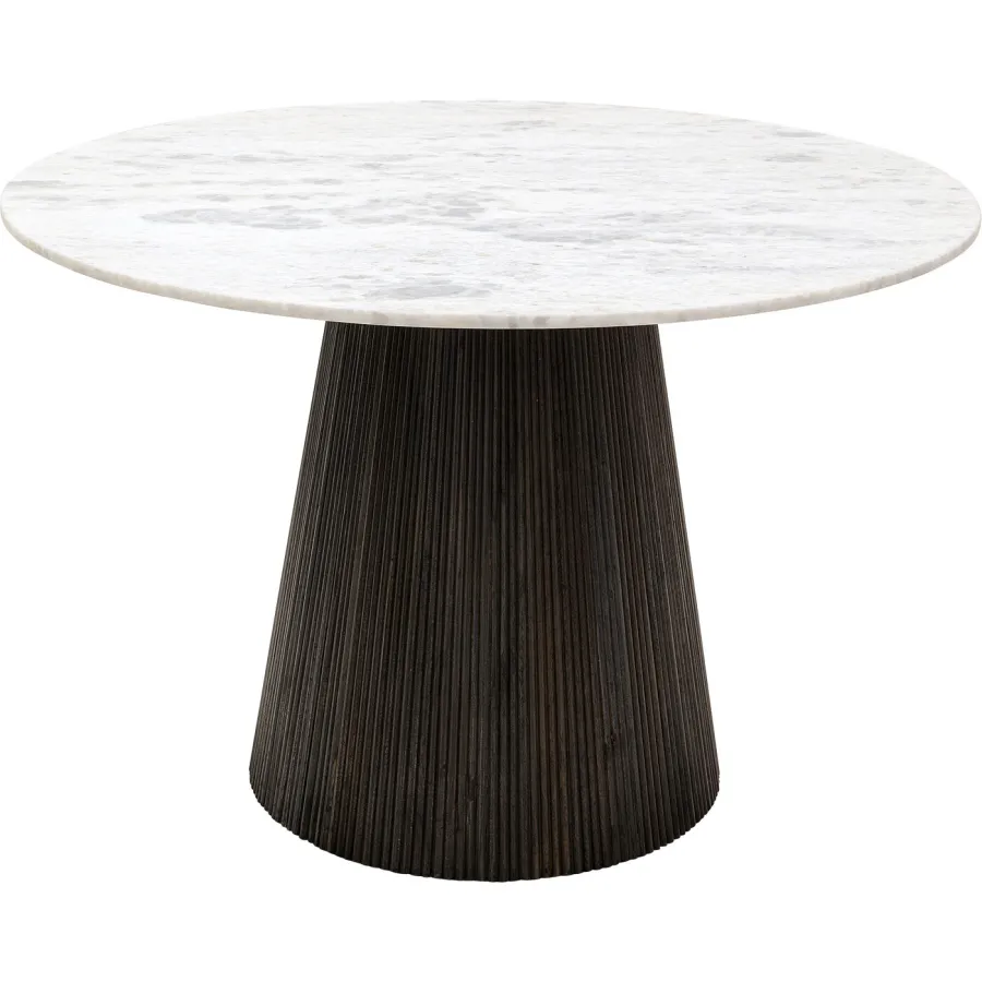 Wnieś do swojej jadalni odrobinę luksusu. Ten okrągły stół łączy naturalną elegancję marmuru z solidnością egzotycznego drewna mango, tworząc wyjątkowy mebel, który przyciąga wzrok i podnosi prestiż wnętrza.
