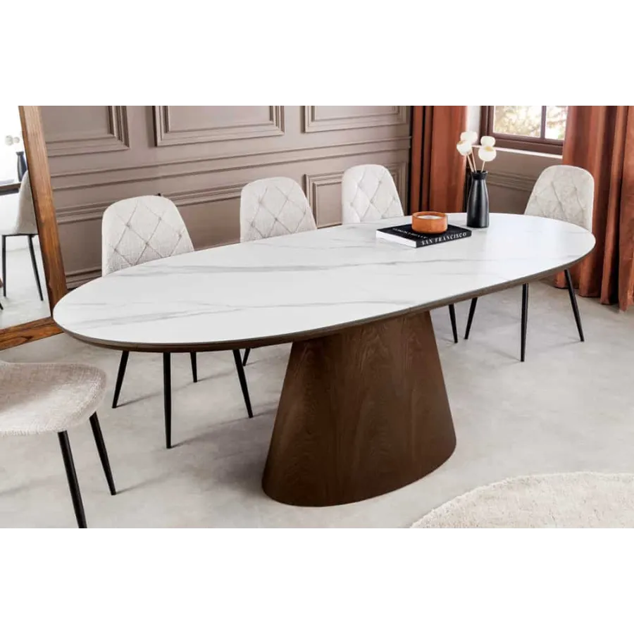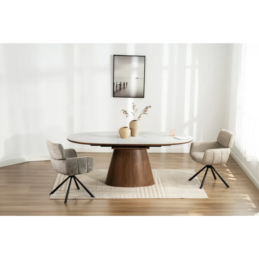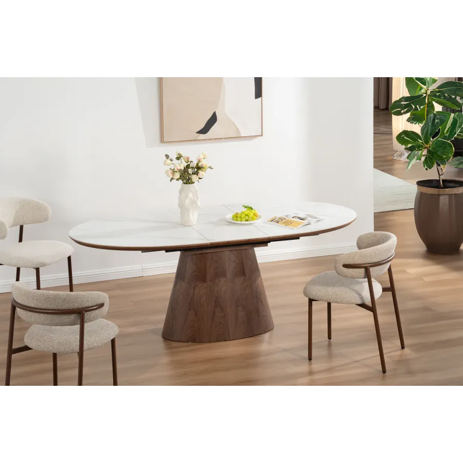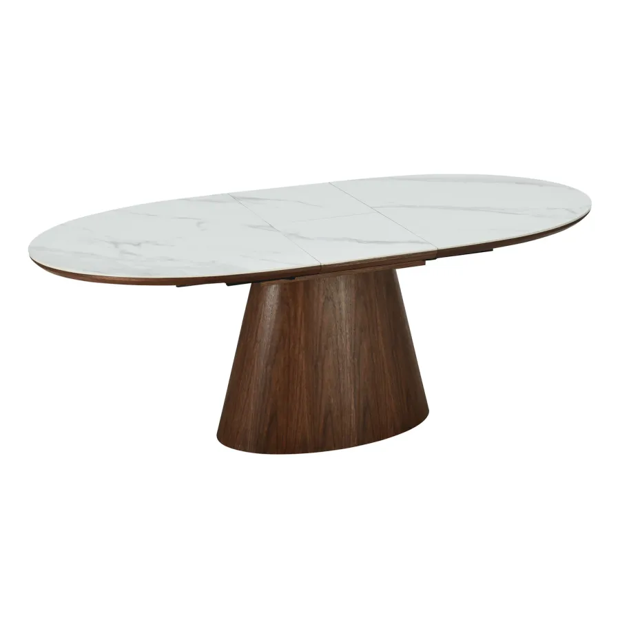 Wprowadź elegancję i nowoczesny styl do swojej jadalni dzięki UNIQUE – rozkładanemu stołowi, który łączy elegancki, biały blat o wyglądzie marmuru z bogatymi akcentami z orzechowego drewna. Stylowy, trwały i niezwykle praktyczny, idealnie sprawdzi się zarówno na co dzień, jak i podczas niezapomnianych kolacji.
