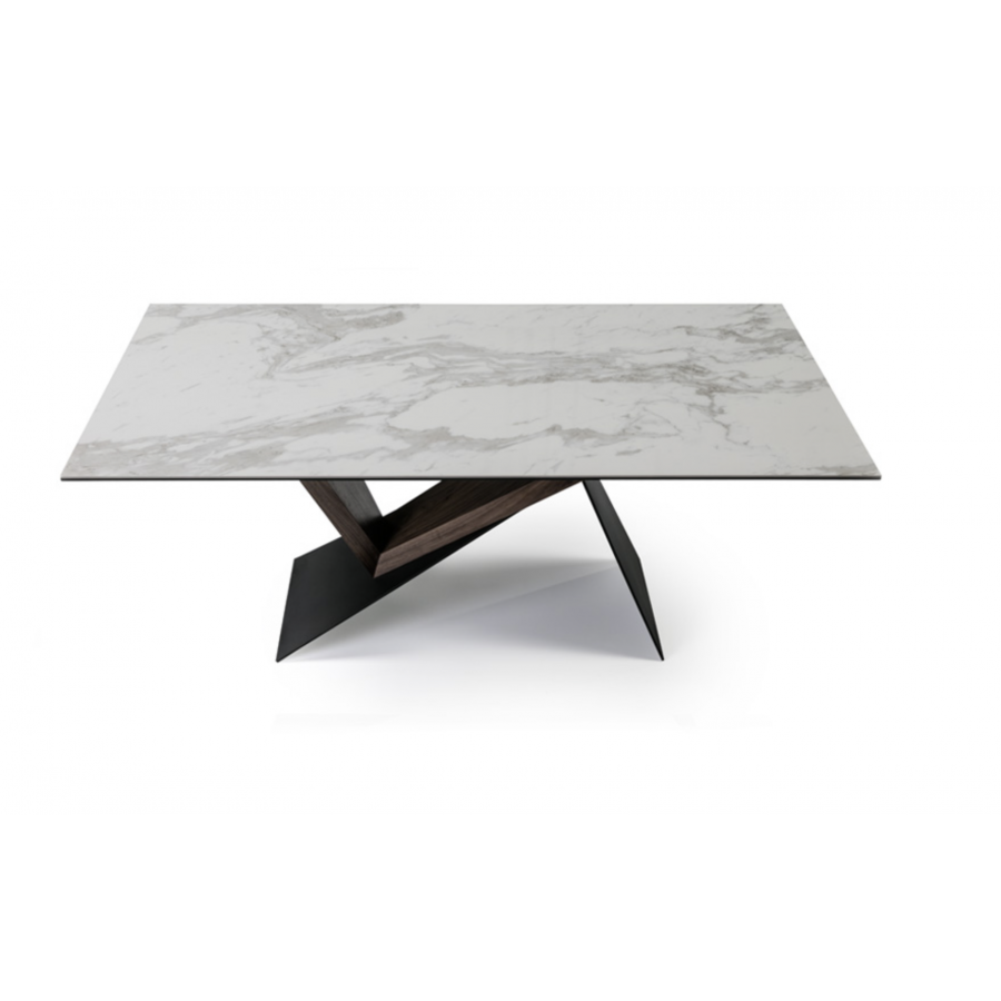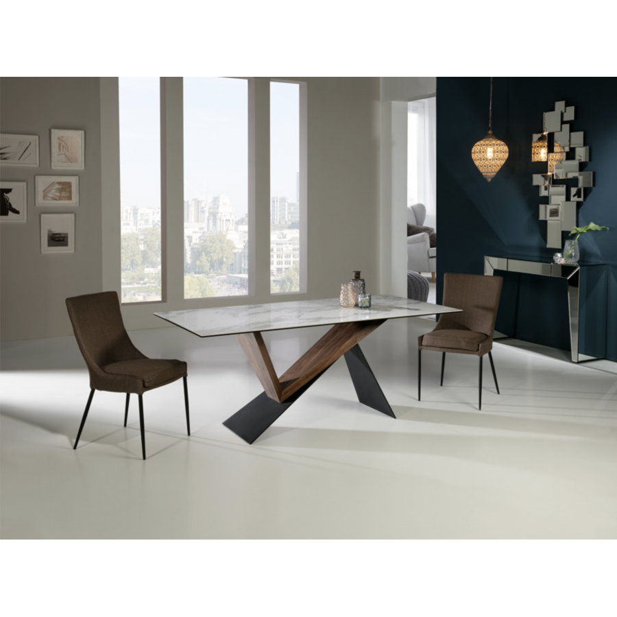 Stół jadalny wykonany z metalu, lakierowanego na matowo czarny kolor, z drewna orzechowego. Blat z laminowanej porcelany i szkła, z dekoracją z białego marmuru, wykończenie połyskujące.