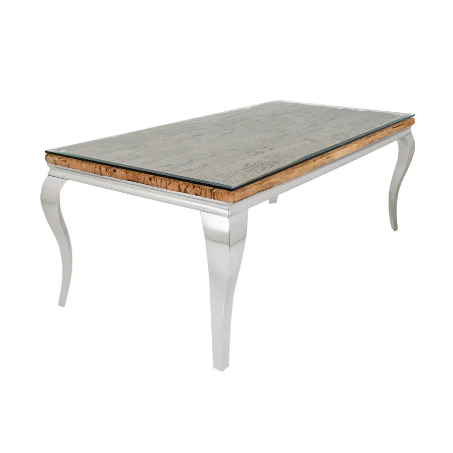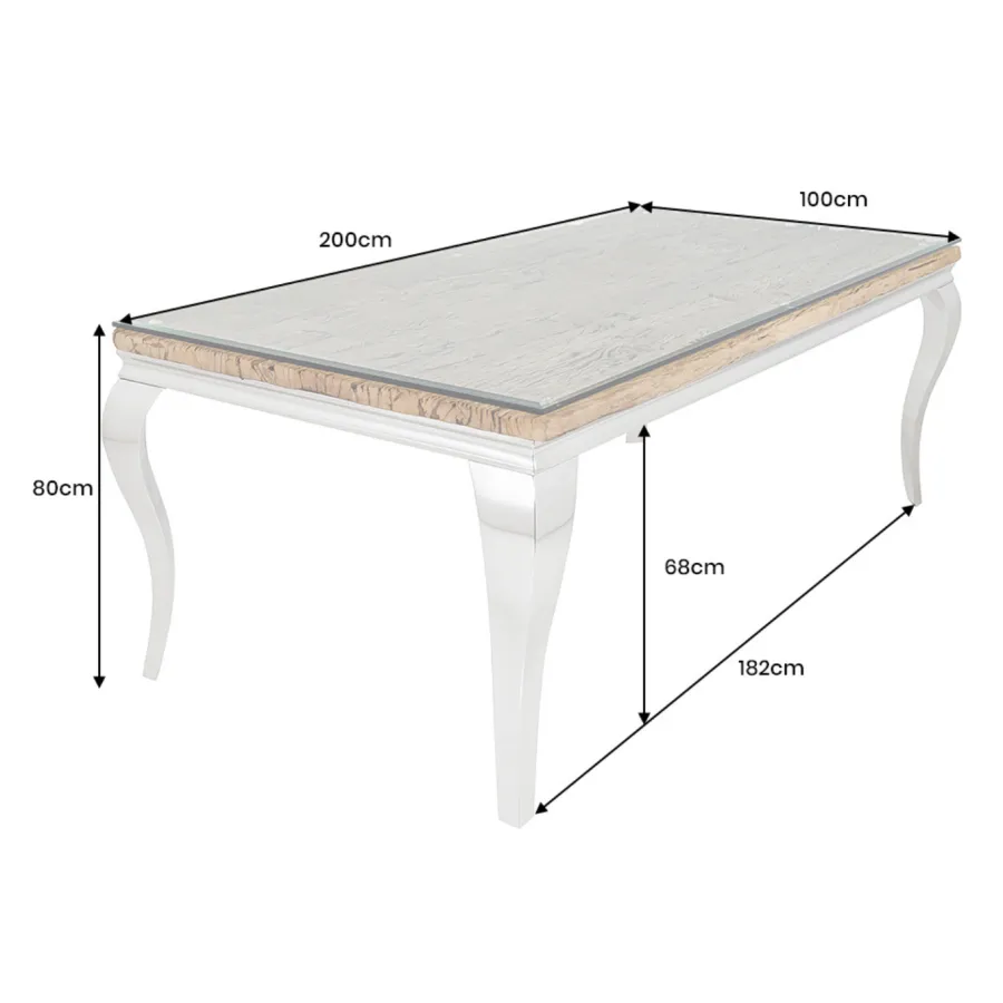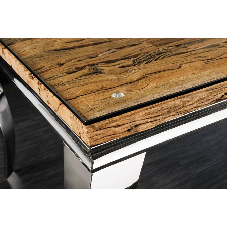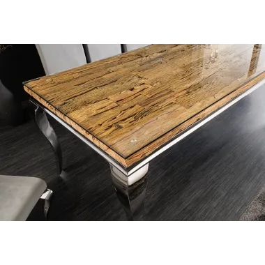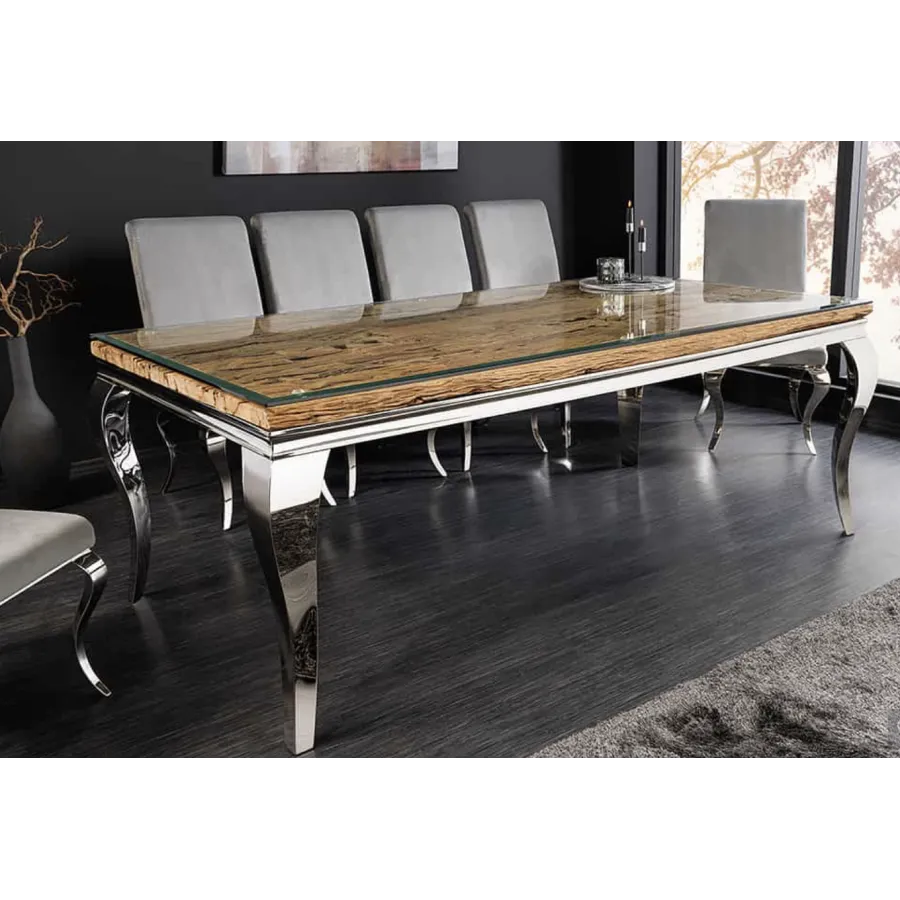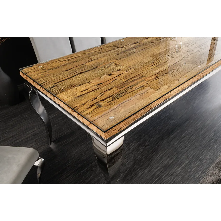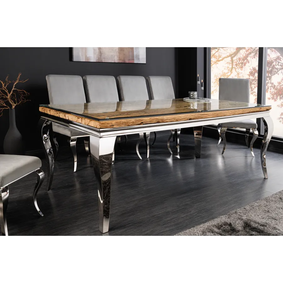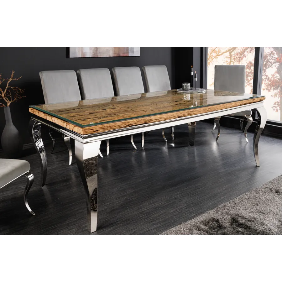 Stół do jadalni MODERN BAROCK BARRACUDA tworzy luksusowe i eleganckie wnętrze. Ten wykwintny mebel, jak sama nazwa wskazuje, został zaprojektowany w stylu barokowym, który zachwyca wyrazistymi, zakrzywionymi liniami oraz wysokiej jakości połączeniem materiałów. Połączenie drewna tekowego i srebrnych, wygiętych nóg nadaje stołowi wyjątkowo elegancki charakter. Imponujący, nowoczesny styl życia świadczy o Twoim guście i nadaje Twojemu domowi niezwykły i niepowtarzalny charakter.